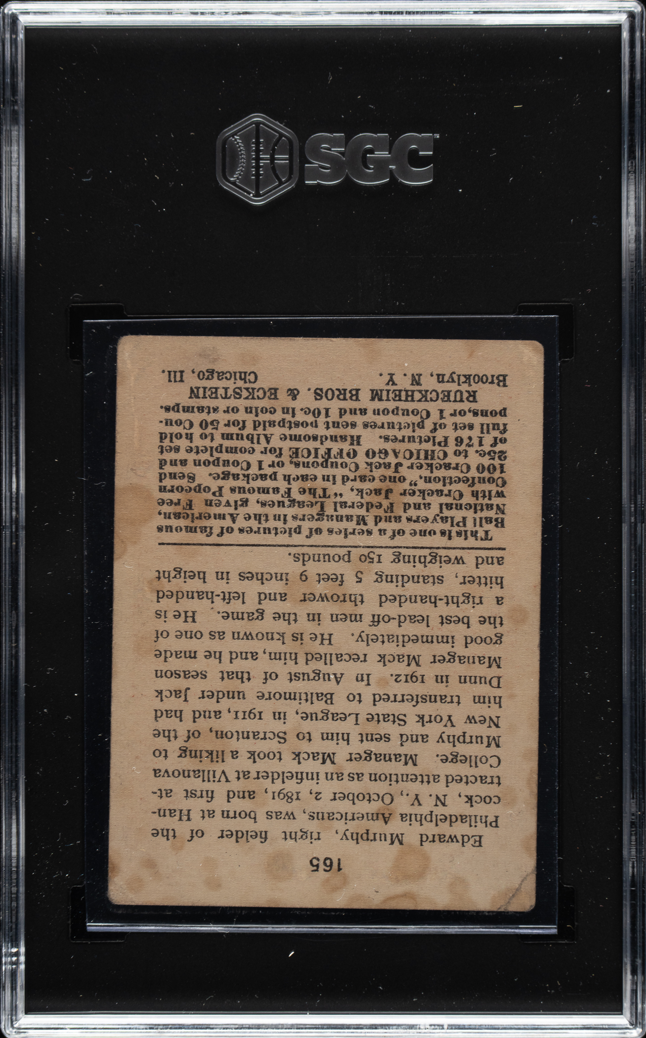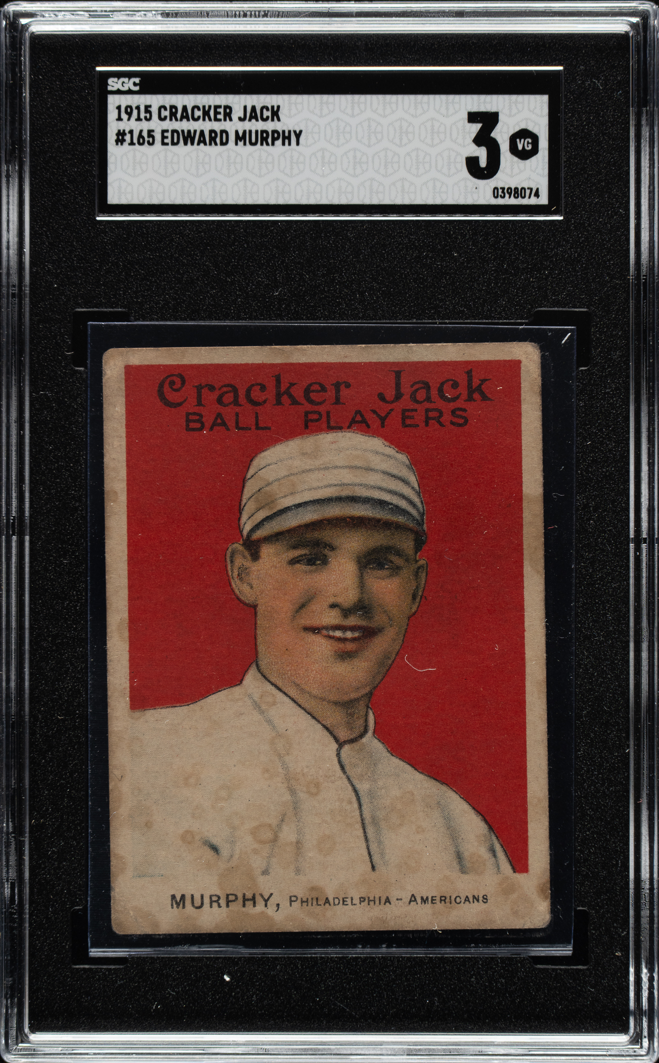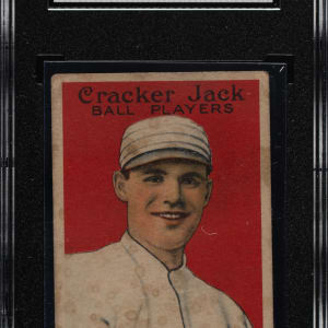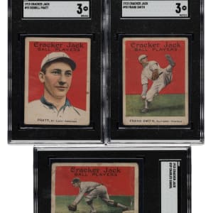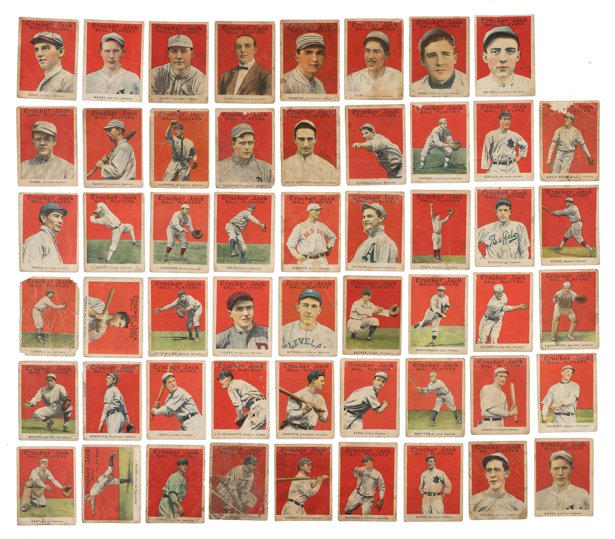 Collection of 57 (of 56 different) 1914 and 1915 E145 Cracker Jack cards, highlighted by infamous "Black Sox" member Chick Gandil and 16 players from the Federal League. Condition is Pr to Fr overall, with a few slightly better. We have selected four cards for grading and encapsulation by SGC. This collection consists of the following: 1) 1914 Cracker Jack (2 cards): #28 and 62. 2) 1915 Cracker Jack (55 cards): #1 Knabe (marked reverse, otherwise Fr), 8, 9, 15, 25, 26, 27, 29, 31, 33, 34, 38, 39 Gandil (POOR 1, Black Sox), 41, 44, 53, 60, 62, 64, 67, 71, 72, 79, 81, 82, 83, 86, 87, 90 (VG 3), 93 (VG 3), 95, 102, 106, 107, 109, 113, 120, 124, 126, 128, 129, 132, 139, 143, 149, two 158, 159, 160, 162, 164, 165 (VG 3), 166, 171, and 172. This is a very presentable lower-grade collection of cards in a very desirable and relatively affordable grade (compared to the much higher cost of higher-grade Cracker Jacks). Total: 57 cards.