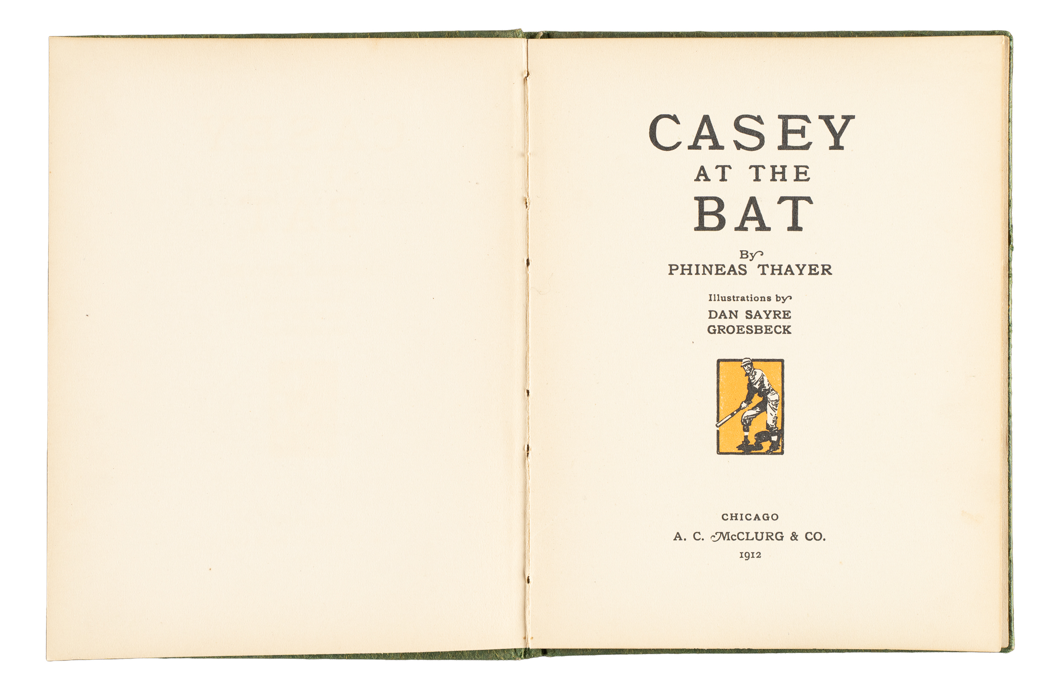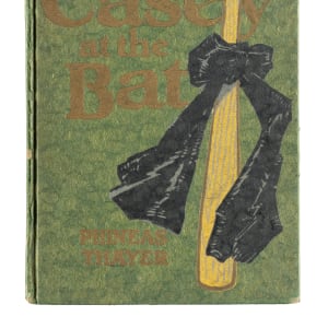 1912 edition of Casey at the Bat by Ernest "Phineas" Thayer, published by A.C. McClurg & Co. The hardcover book features colorful illustrations alongside the text. The book (5-3/8 x 6-7/8 inches) displays light-to-moderate handling wear, while the inside pages are bright and clean. Very Good to Excellent condition overall.