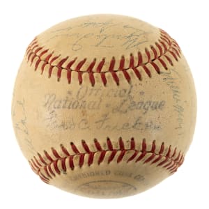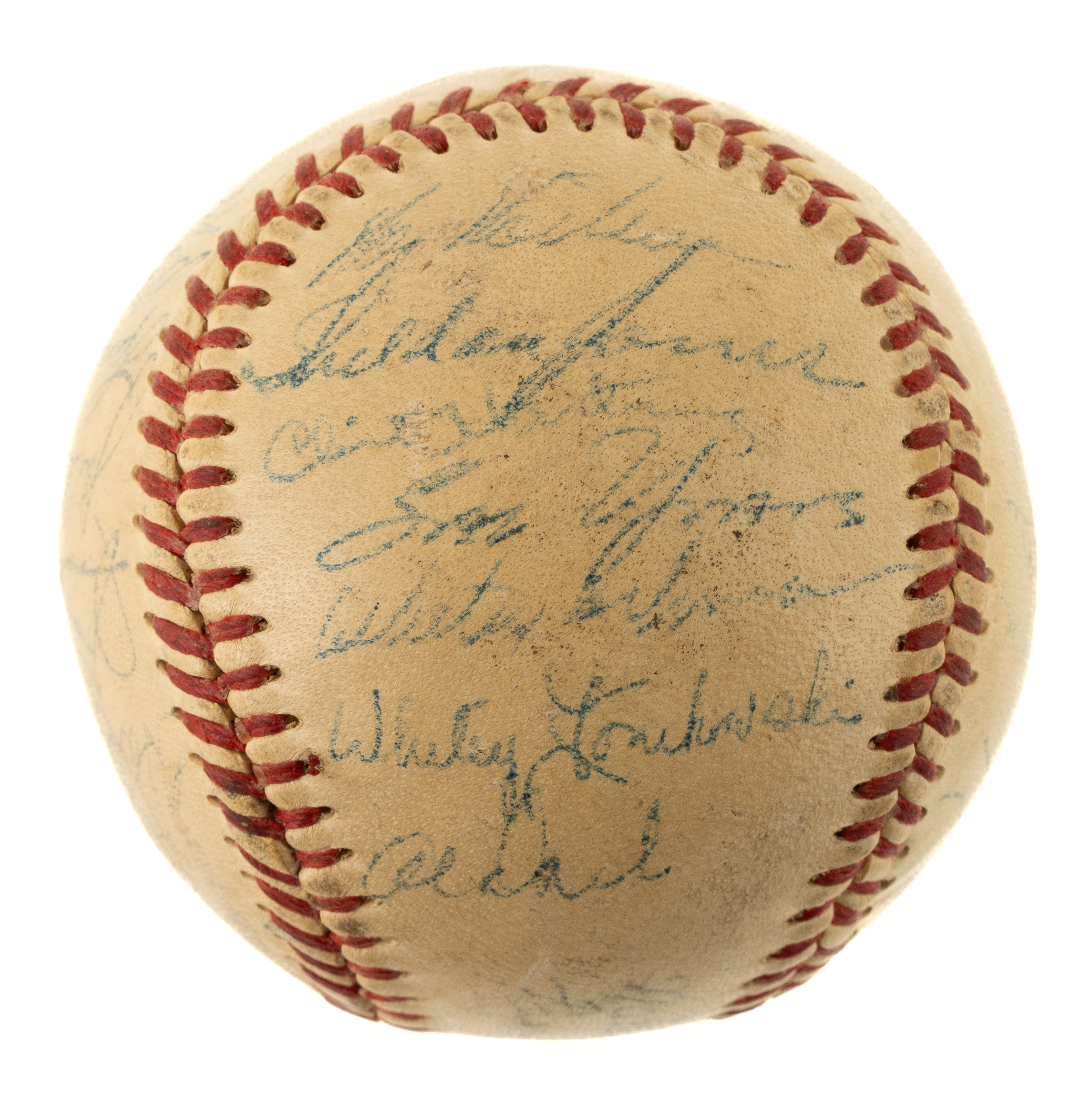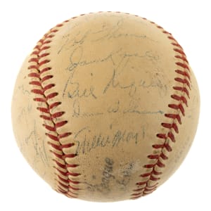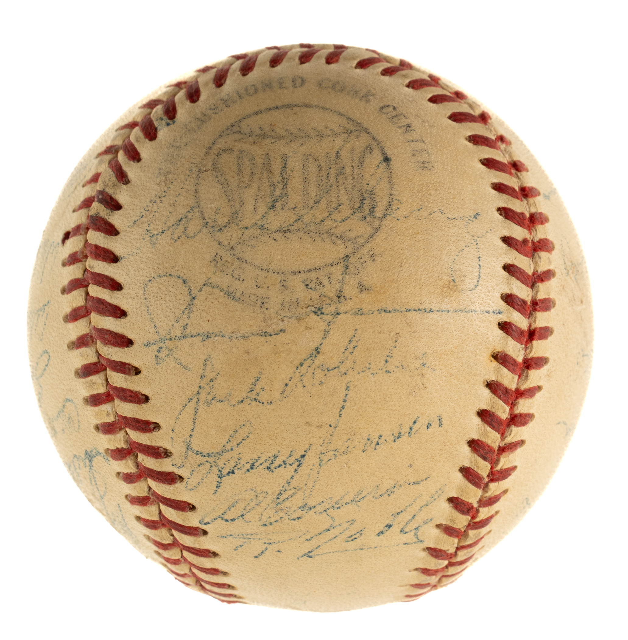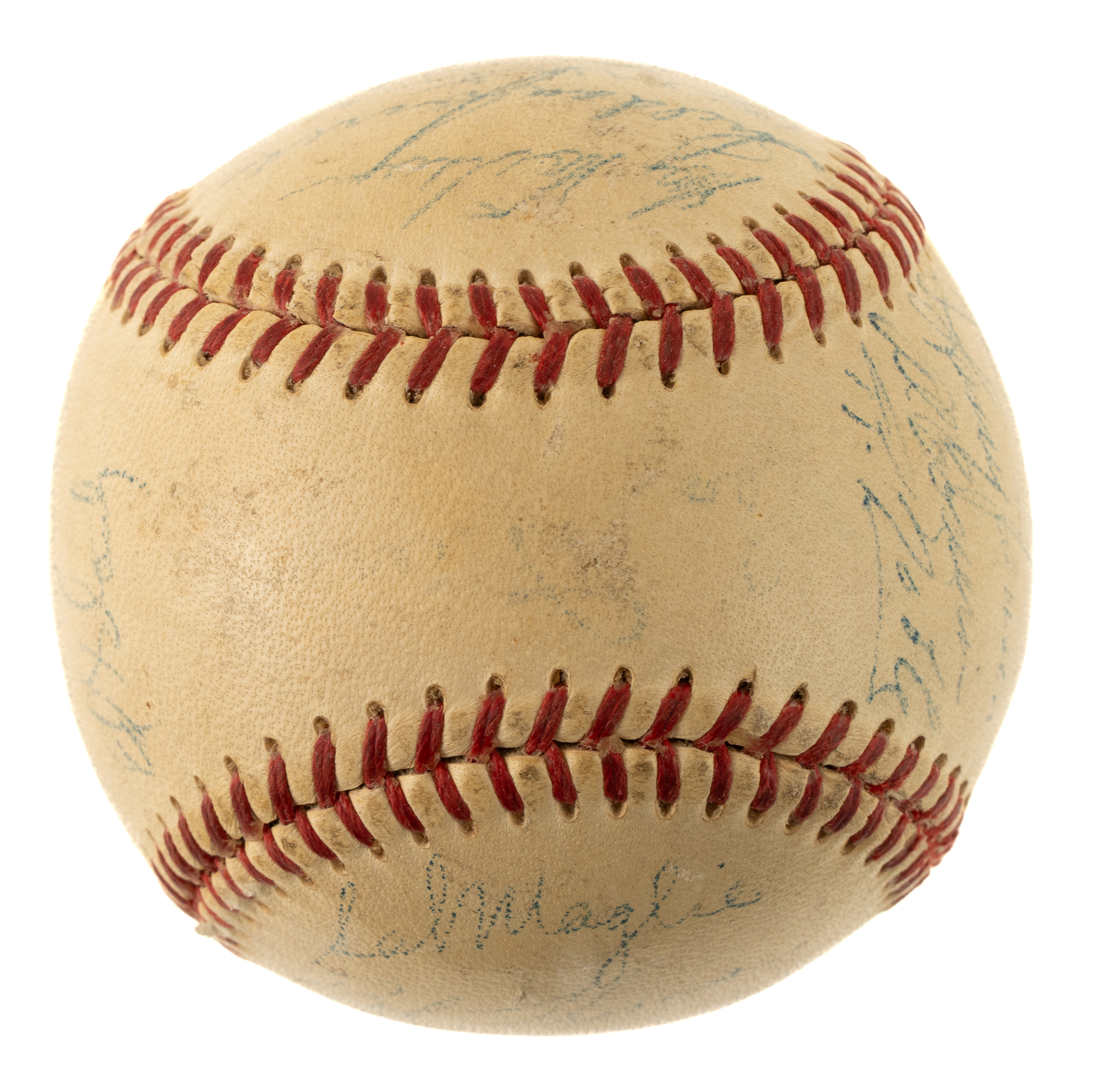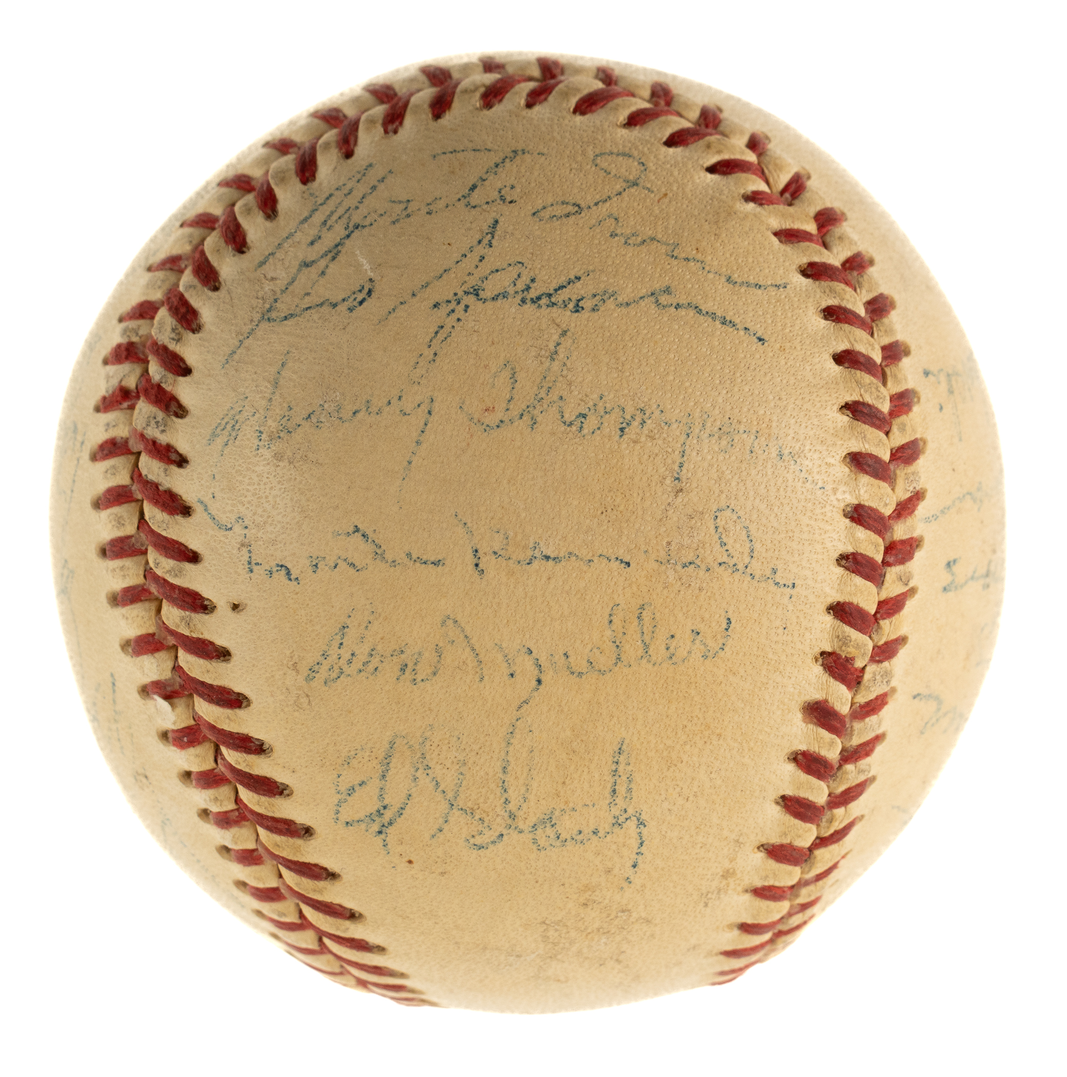 Official National League baseball (Frick) signed in blue ink by twenty-six members of the 1951 National League Champion New York Giants, including Mays (rookie season), Irvin, Stanky, Mueller, Koslo, Jansen, Jones, Thomson, Rigney, Spencer, Kennedy, Corwin, Schenz, Yvars, Dark, Noble, Maglie, Hartung, Williams, Thompson, Lohrke, Hardy, Lockman, Konikowski, and one unidentified. The signature of manager Leo Durocher on the sweet spot is a stamped facsimile (common for Giants balls at the time). The ball is lightly toned with a few surface abrasions. All of the manufacturer's stampings are bold and legible. In Very Good to Excellent condition overall. Auction LOA from James Spence/JSA.