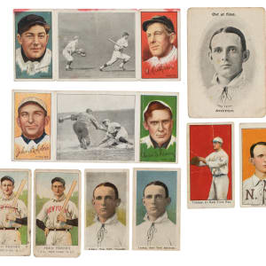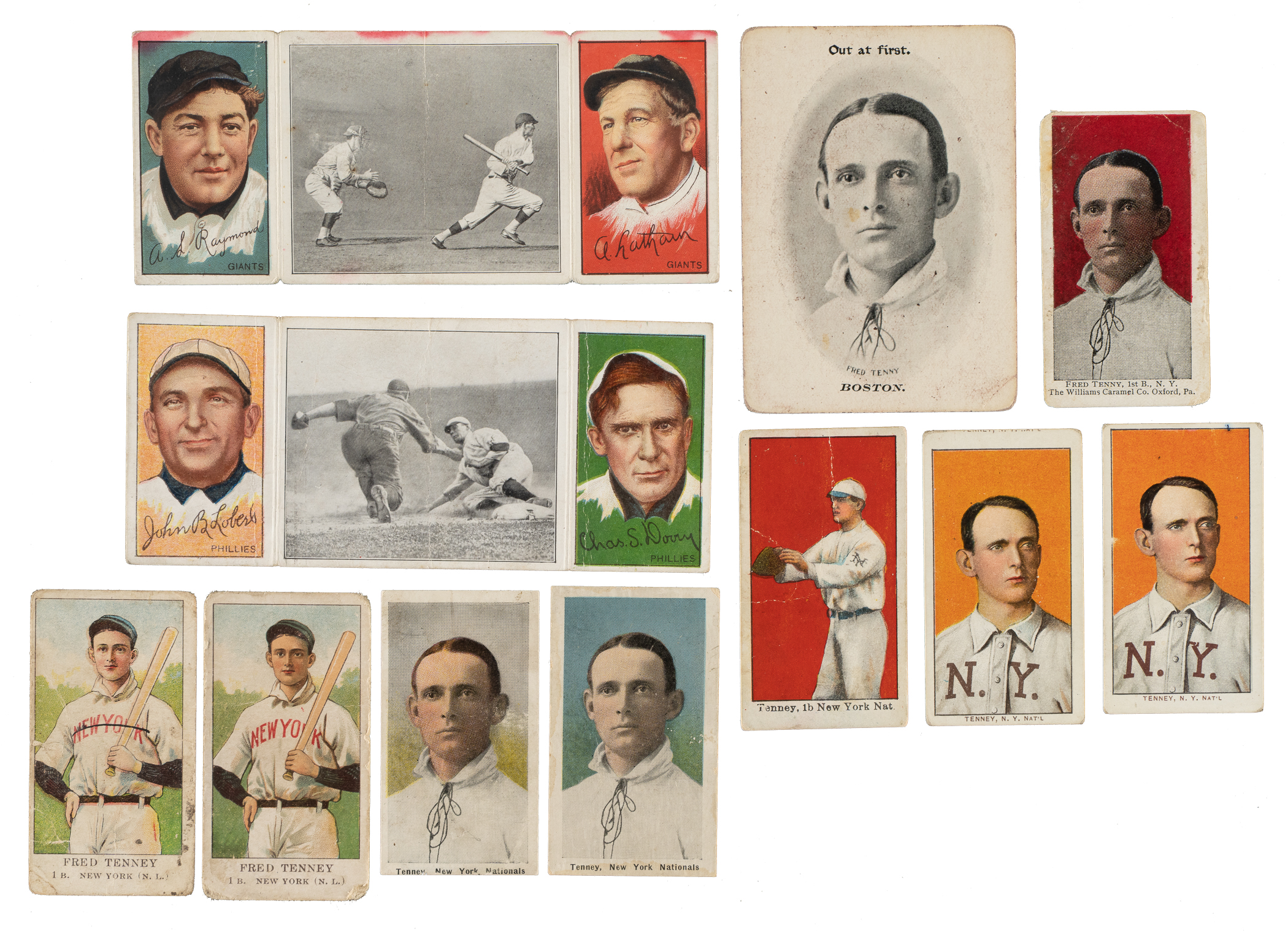 Presented is a collection of eleven 1910-era baseball cards (mostly caramel and tobacco), all depicting Fred Tenney. The Ivy-League educated Tenney was a star of his day, cranking out more than 2,200 hits during a seventeen-year career with the New York Giants and the National League Boston franchise. Tenney is considered one of the top defensive first basemen of the Deadball Era and is credited with originating the 3-6-3 double play and popularizing the defensive positioning (deep and well off first base) that is common to this day. This collection consists of the following: 1) 1906 WG2 Fan Craze N.L. (1 card): Tenney (Gd). 2) 1908 E91-A American Caramel (1 card): Tenney (Fr). 3) 1909 E91-B American Caramel (1 card): Tenney (Pr). 4) 1909-1911 E90-1 American Caramel (1 card): Tenney (Fr). 5) 1909-1911 T206 White Border (2 cards): Two Tenney (tiny ink mark on front, otherwise Vg, Sweet Caporal and light ink marks on reverse, otherwise Vg, Piedmont). 6) 1910 E103 Williams Caramel (1 card): Tenney (Pr). 7) 1910-1911 M116 Sporting Life (2 cards): Tenney/blue background (Pr) and Tenney/pastel background (slight trim, otherwise Pr). 8) 1912 T202 Hassan Triple Folder (2 cards): Lobert Gets Tenney - Lobert/Dooin (Fr) and Tenney Lands Safely - Latham/Raymond (Pr). Total: 11 cards.