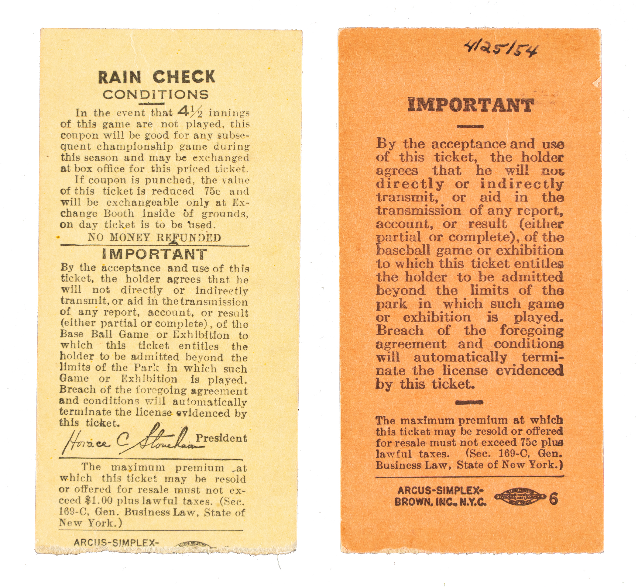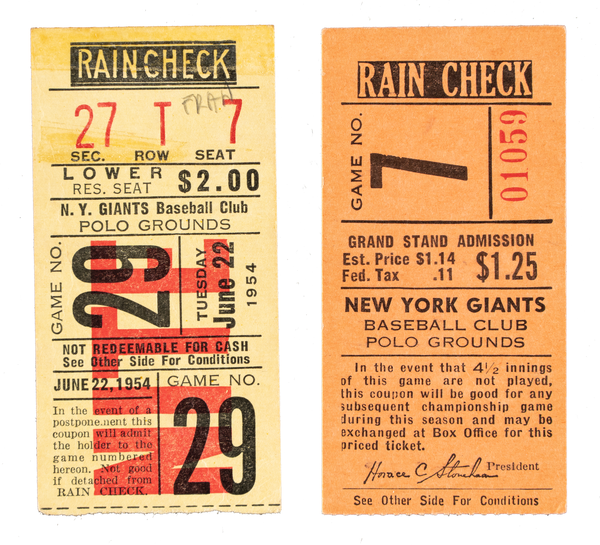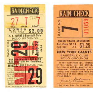Pair of New York Giants ticket stubs (1-5/8 x 3-1/4 inches) dating from the 1954 season held at the Polo Grounds in New York. 1) April 25 vs. Philadelphia Phillies (doubleheader). Giants won both games, 3-0 and 5-0. The ticket stub has the date "4/25/'54" written in black on the reverse, but is otherwise in Very Good to Excellent condition overall. 2) June 22 vs. Milwaukee Braves. Hank Aaron career home run #8 and Willie Mays career home run #45. The ticket stub displays a pencil notation on the front, but is otherwise in Very Good condition overall. Total: 2 ticket stubs.