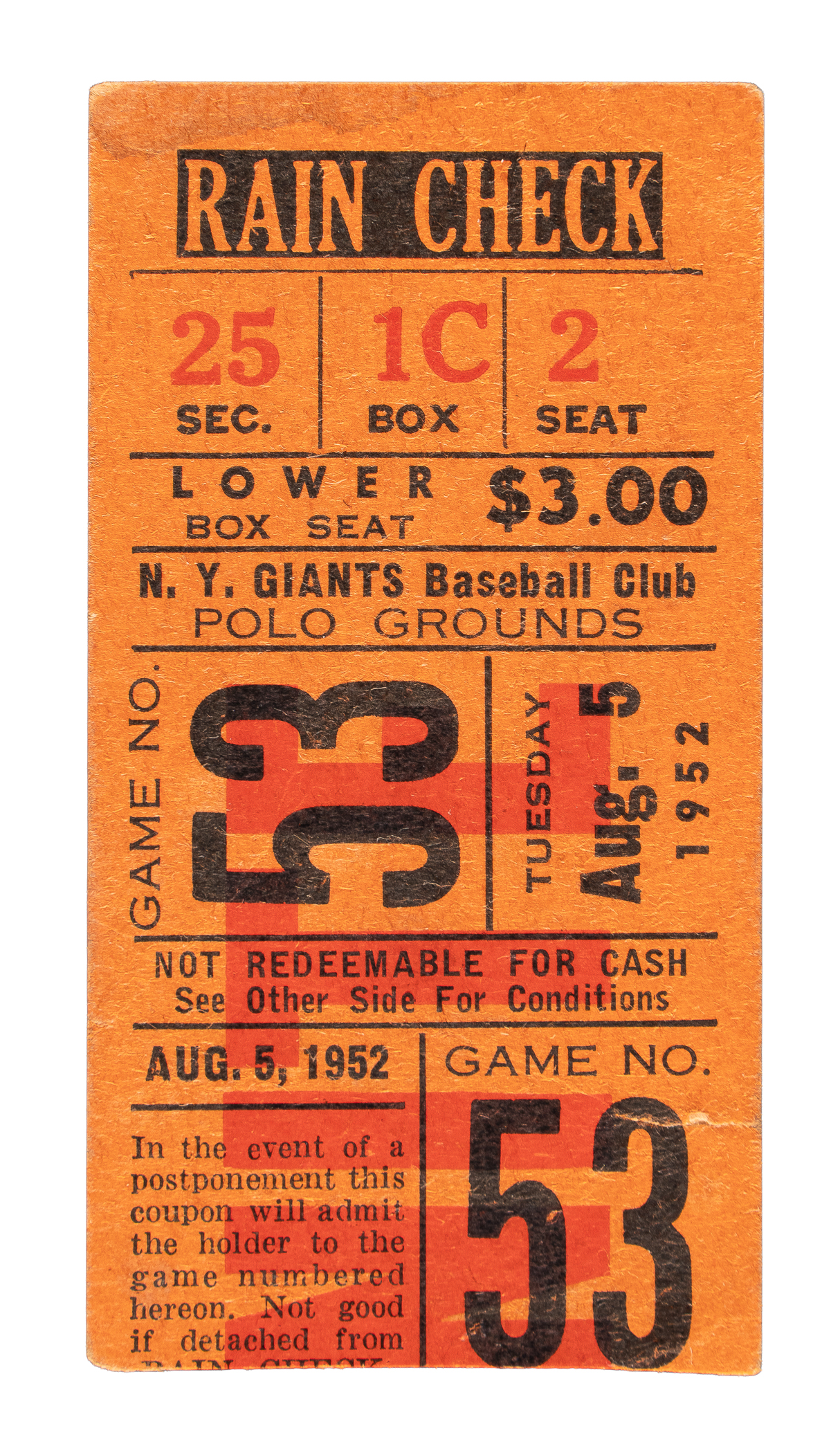 New York Giants regular-season ticket stub issued for a game against the Brooklyn Dodgers on August 5, 1952. Despite a grand slam from Gil Hodges, the Dodgers fell to the Giants 7-6 in 15 innings. The ticket stub (1-5/8 x 3 inches) is in Good condition overall.