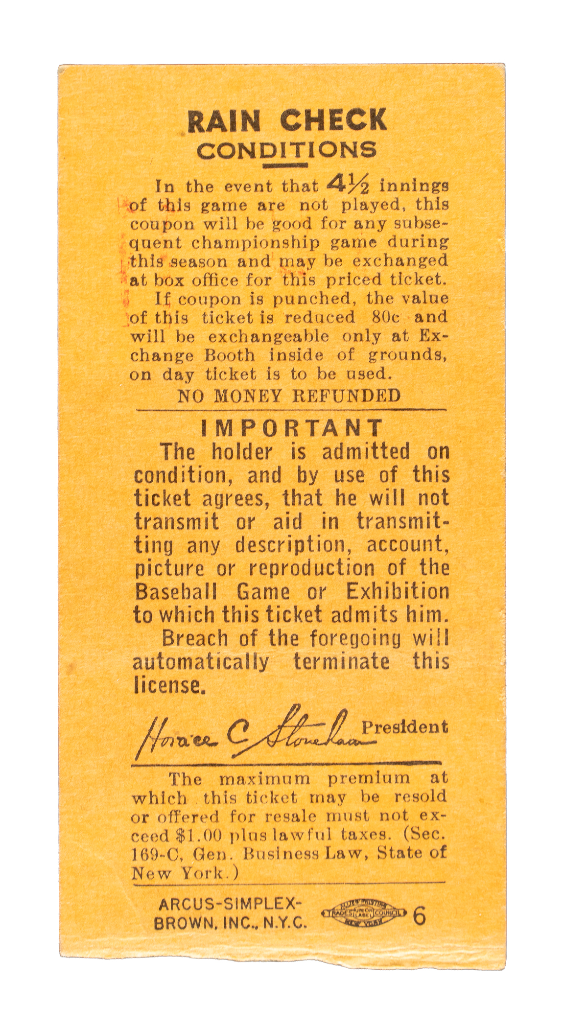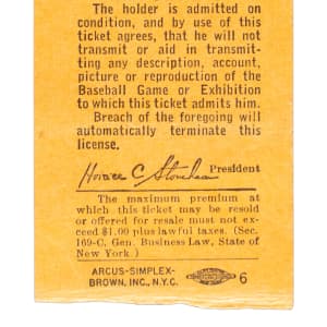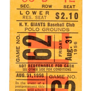 New York Giants regular-season ticket stub issued for a game against the Brooklyn Dodgers on August 31, 1956. Despite a home run from Willie Mays, the Giants fell to the Dodgers 7-3. The ticket stub (1-5/8 x 3-1/4 inches) is in Very Good to Excellent condition overall.