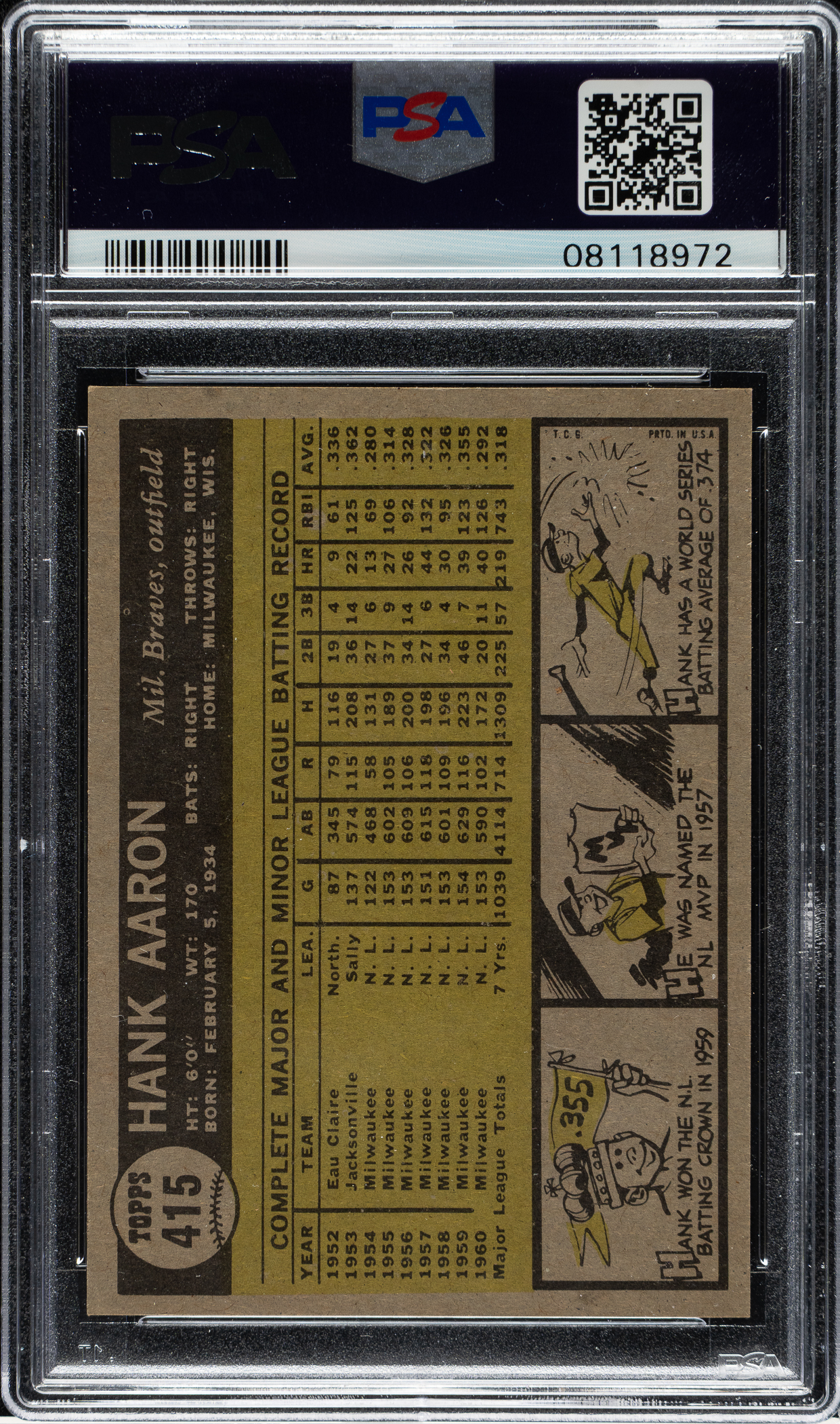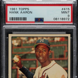 Graded MINT 9 by PSA. Highest-graded example! Tremendous example of Milwaukee Braves Hall of Famer Hank Aaron from the 1961 Topps set. This card boasts bold colors, outstanding image quality, and sharp corners. Clean reverse. This is an extraordinary MINT example that would be a stunning addition to any 1961 Topps, Hank Aaron, or Hall of Fame card collection.