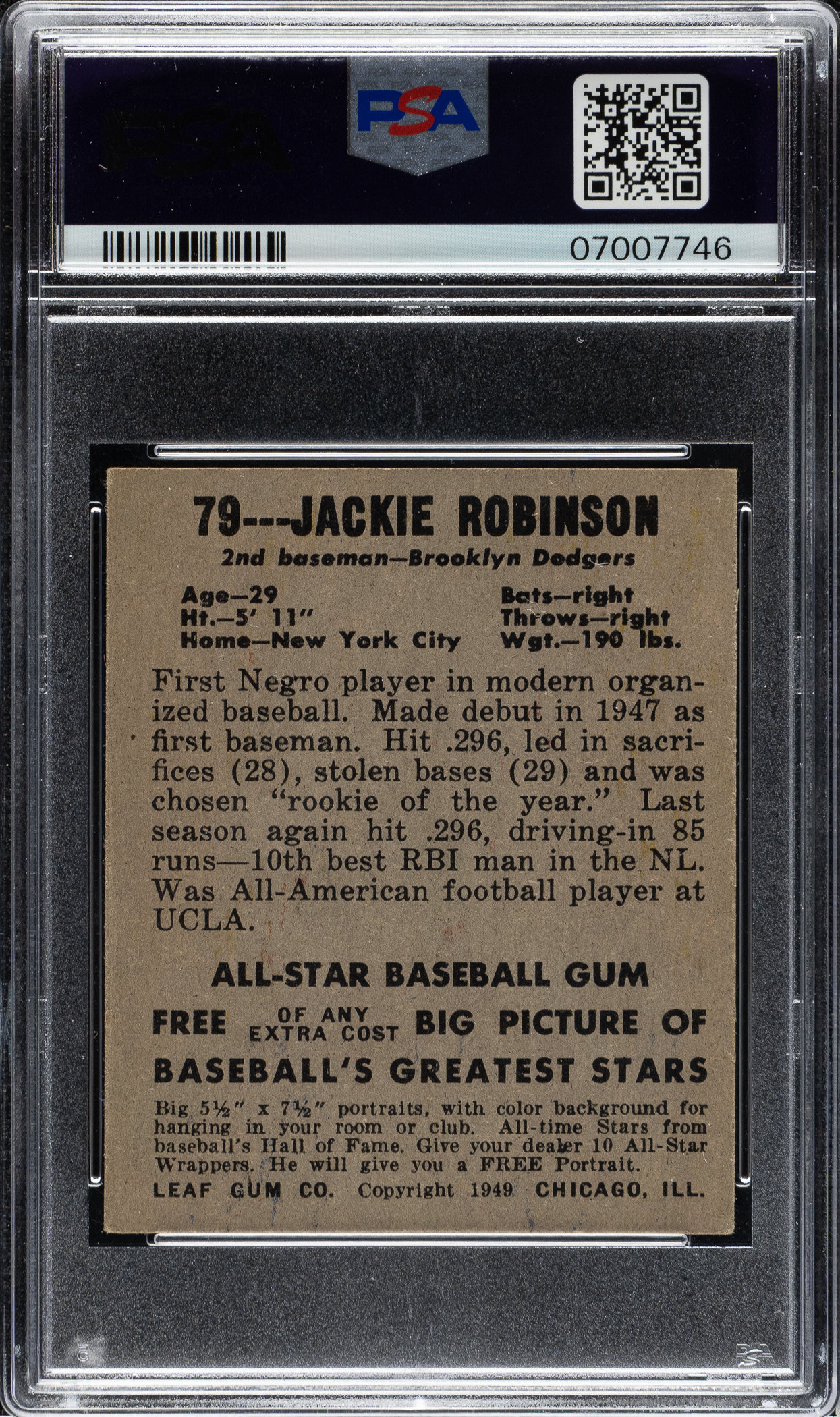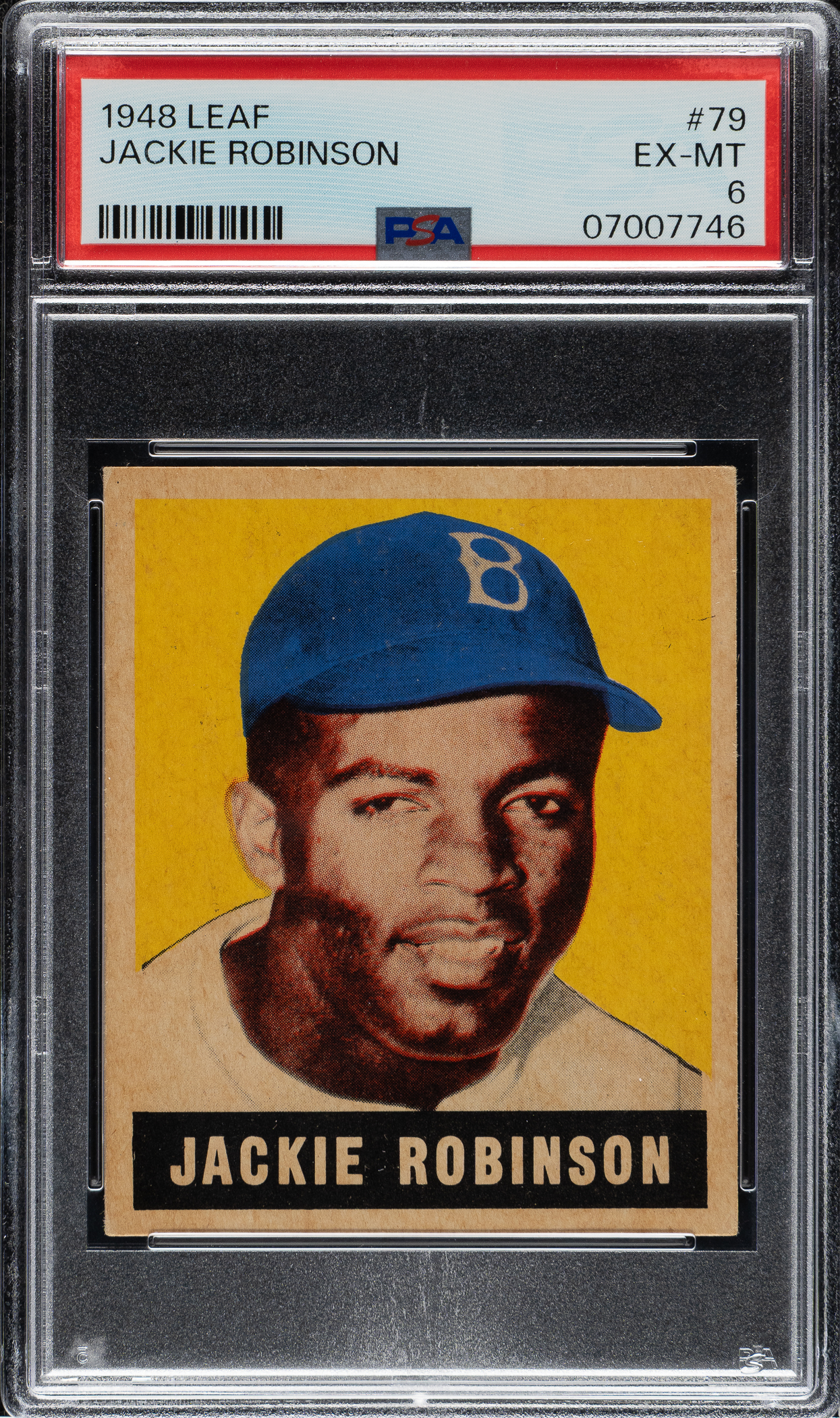Graded EX-MT 6 by PSA. Tremendous example of this classic rookie card of Brooklyn Dodgers Hall of Famer Jackie Robinson. The 1948-1949 Leaf card of Robinson is one of the most popular, striking, and classic of all his cards. Leafs are often encountered with many condition problems (excessive toning, general wear from fragile paper stock, soft corners, centering issues, and print lines), and collectors also have to deal with the wildly varying degrees of print quality that characterize the set. It is easy to see why 1948-1949 Leafs are one of the most difficult of all issues to collect in high grade. The offered card is a great rarity in terms of condition and quality for any Leaf, let alone Jackie Robinson, one of the key Hall of Famers in the set. The offered example features vibrant colors, excellent registration, and strong corners displaying light touches of wear. The reverse is clean and free of staining and excess print. This is an exceptionally attractive example of one of the icons of postwar Hall of Fame card collecting and, in the eyes of many, Jackie Robinson's single most desirable baseball card. This classic card has always been a favorite with collectors and is rarely found in such remarkable high grade.