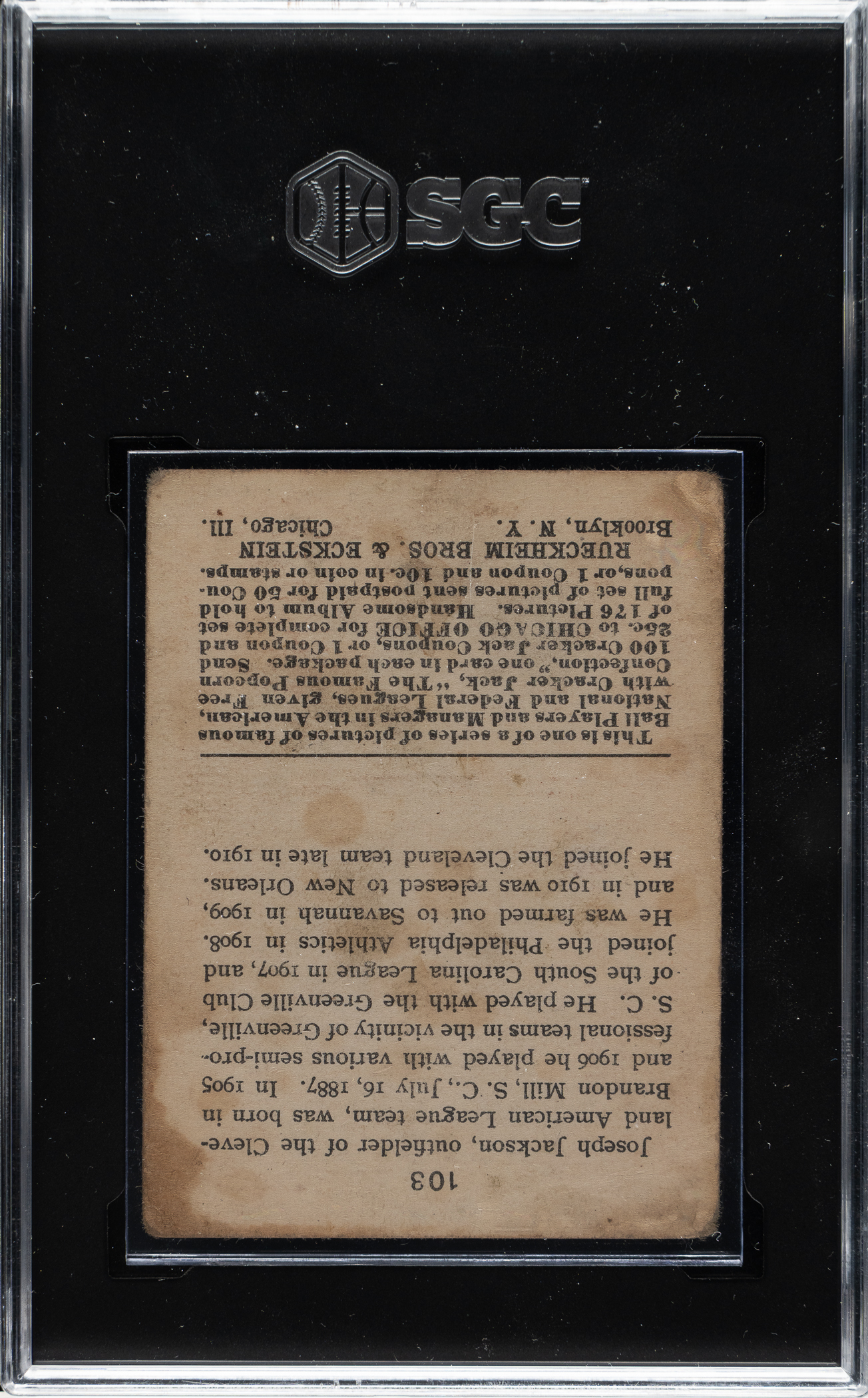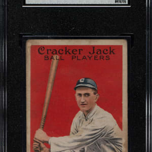 Graded GOOD 2 by SGC. Attractive example of this classic Joe Jackson card and an iconic vintage baseball collectible. The offered card has a brilliant red background, outstanding registration, and moderate corner wear. A bit of caramel staining is visible along the front and reverse. Light unobtrusive creasing and a tiny spot of paper loss along Jackson's face factor into the assigned grade. Joe Jackson is one of the big three key cards in the set, along with Ty Cobb and Honus Wagner. This is an extremely desirable grade for this card, providing a relatively affordable alternative to a far more expensive high-grade example.