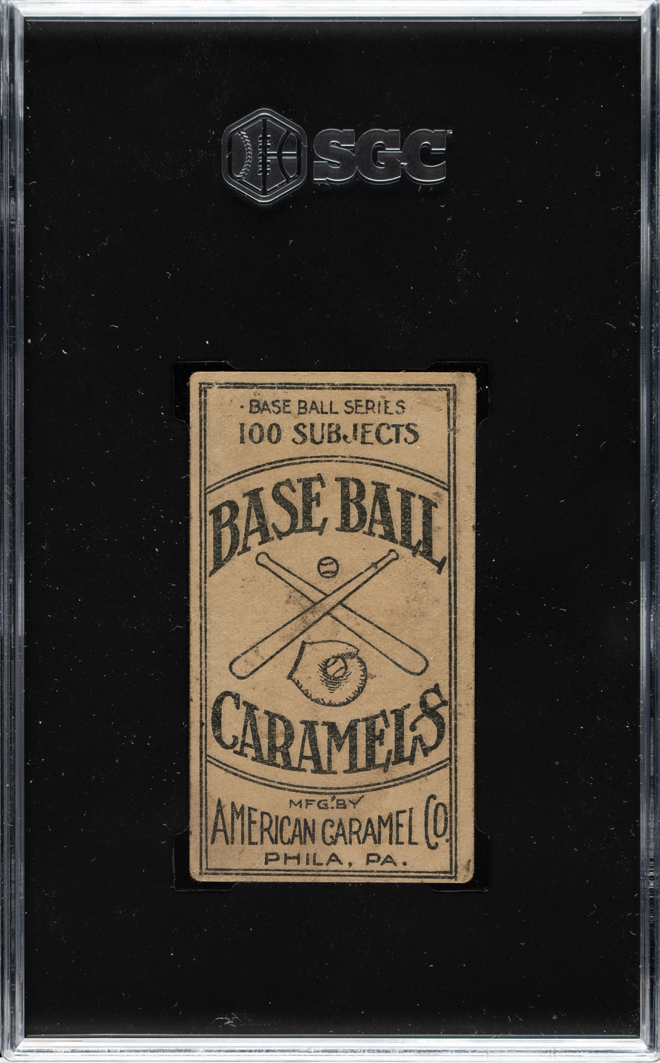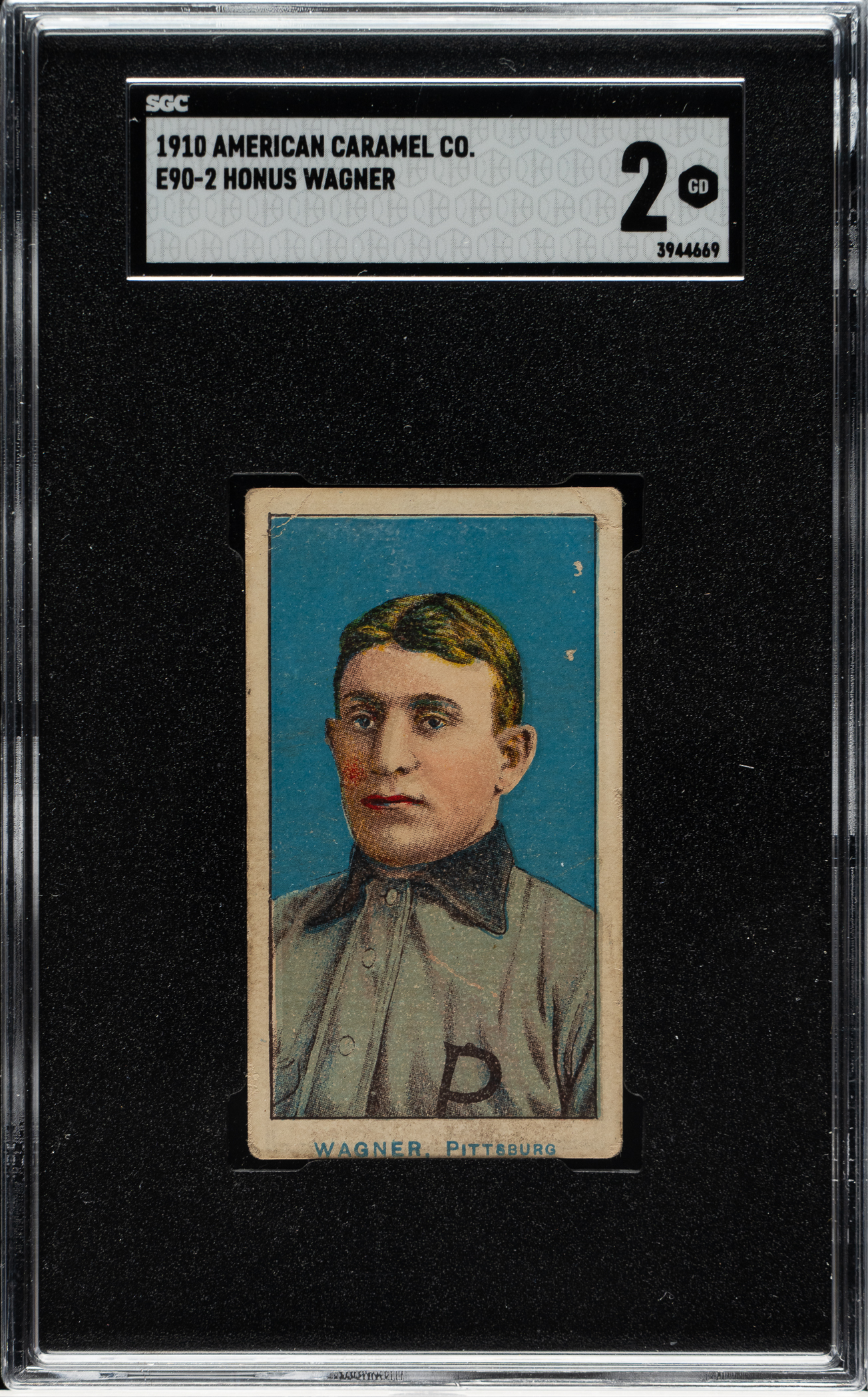 Graded GOOD 2 by SGC. Presented is the key card from the 1910 E90-2 American Caramel set. This very scarce set was regionally issued in the Pittsburgh area and features only members of the Pirates, the National League champions of the previous year. This is one of Honus Wagner's most striking cards and features a portrait image reminiscent of the pose on his famous T206 card. This well-centered example features a brilliant blue background, outstanding registration, and honest corner wear. The reverse has light soiling. Light unobtrusive creasing and two tiny spots of paper loss along the blue background contribute to the assigned grade. Despite these flaws, this remains a striking example of this card, which is recognized as among the most classic and popular of all 1910-era Honus Wagner cards.