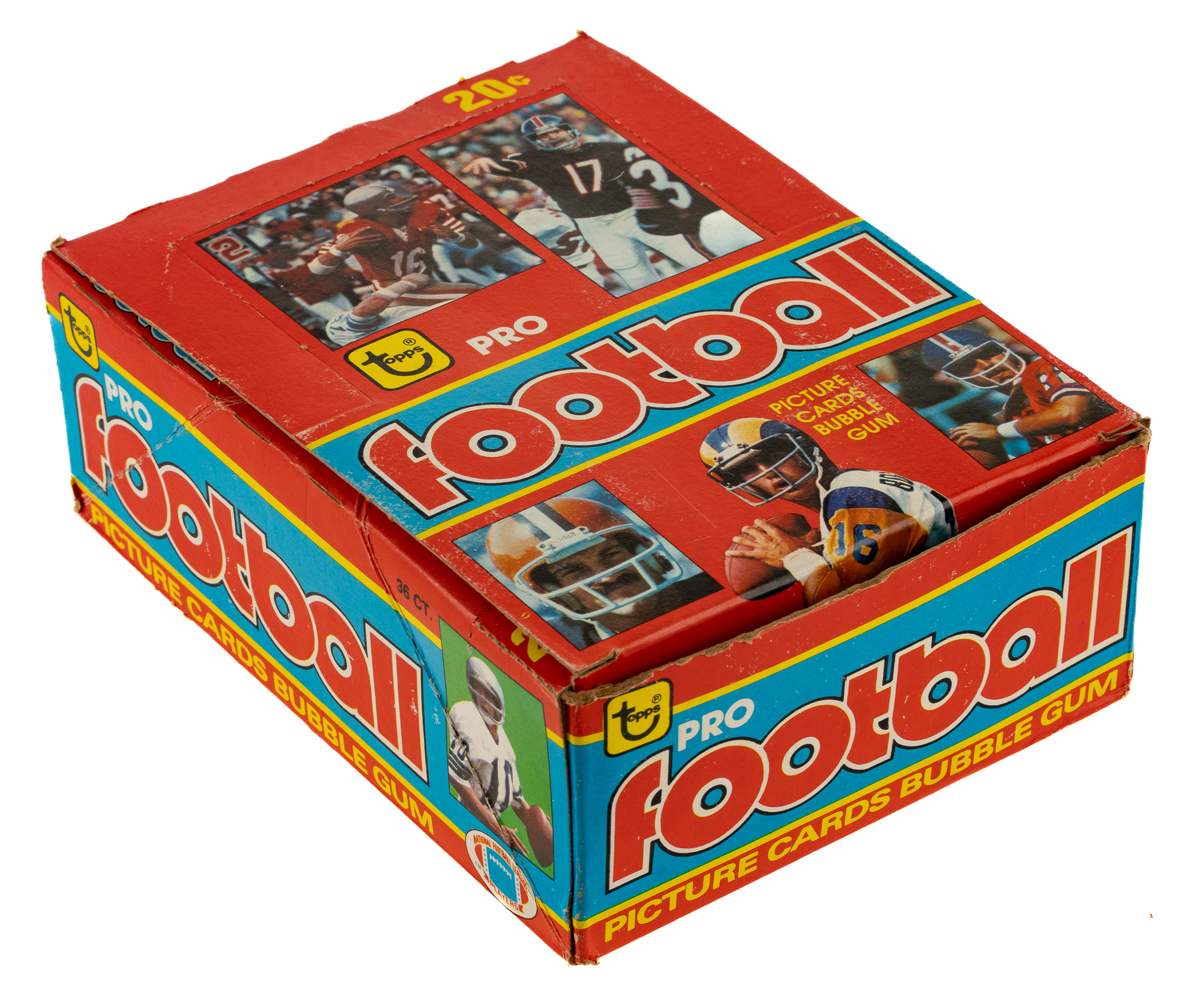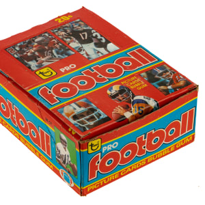 Complete wax box of 1979 Topps football. The box houses 36 packs with each pack containing 10 cards, for a total of 360 cards. The 1979 Topps set features rookie cards of Hall of Famers Earl Campbell, James Lofton, and Ozzie Newsome, as well as numerous other stars and Hall of Famers, including Terry Bradshaw, Walter Payton, and Roger Staubach. Steve Hart of the Baseball Card Exchange (the leading authority on unopened material) has personally reviewed these packs, and in his opinion, are original and unopened. However, he declined to wrap due to moisture damage to the packs.