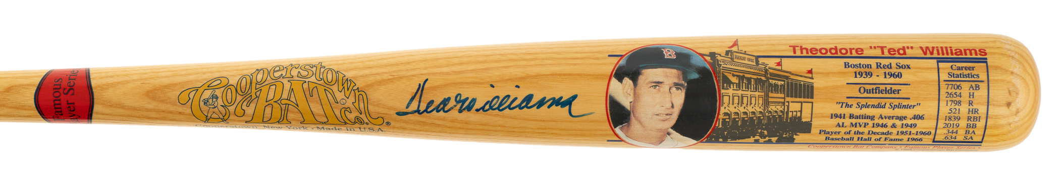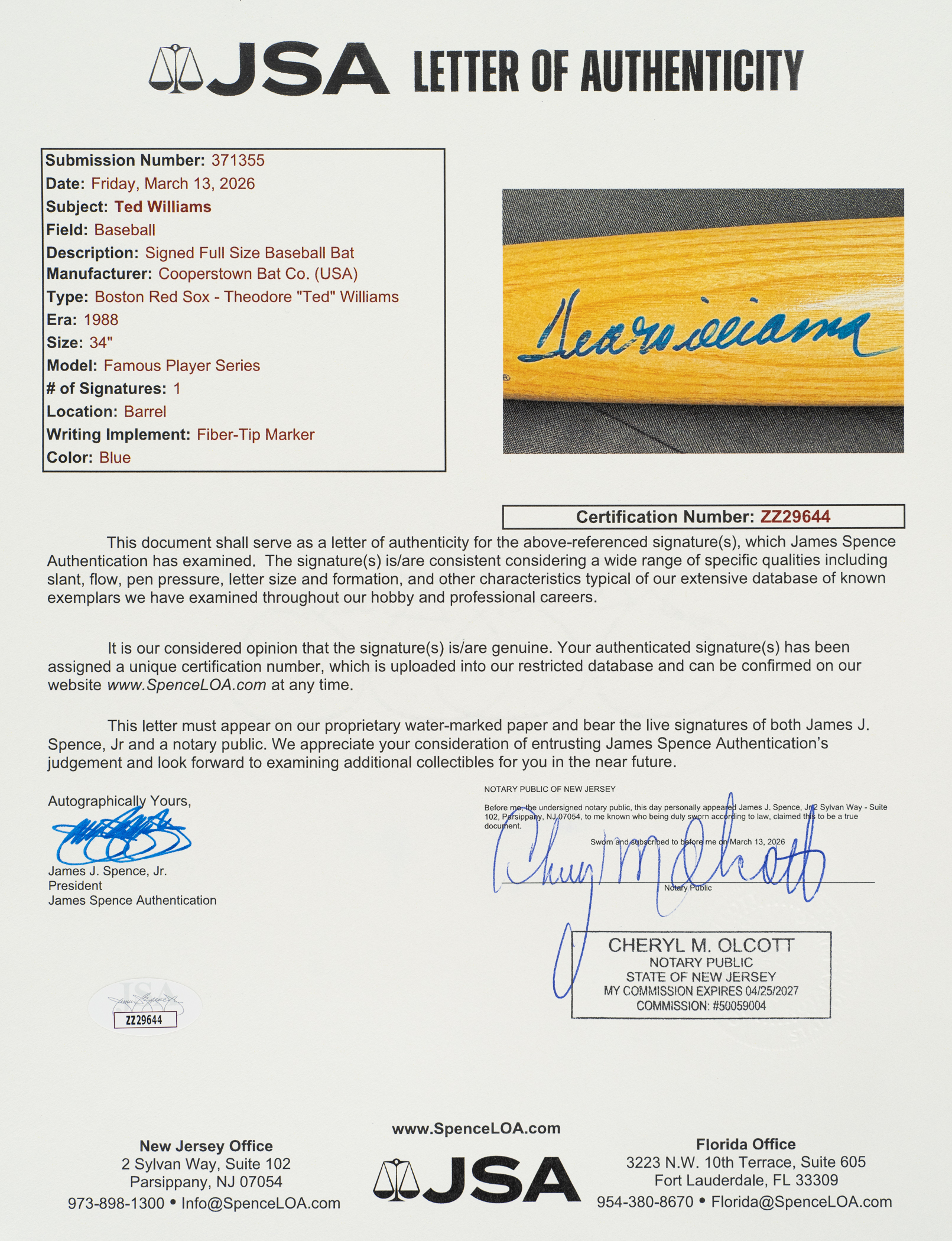 Commemorative bat manufactured by the Cooperstown Bat Company signed by Ted Williams, who has written his signature in blue Sharpie on the barrel. The barrel also features a decal that pays tribute to Williams' legendary career. The bat measures 34 inches long and is in Near Mint condition. Full LOA from James Spence/JSA. The size/weight of this item requires that there will be an additional shipping charge for this lot.
