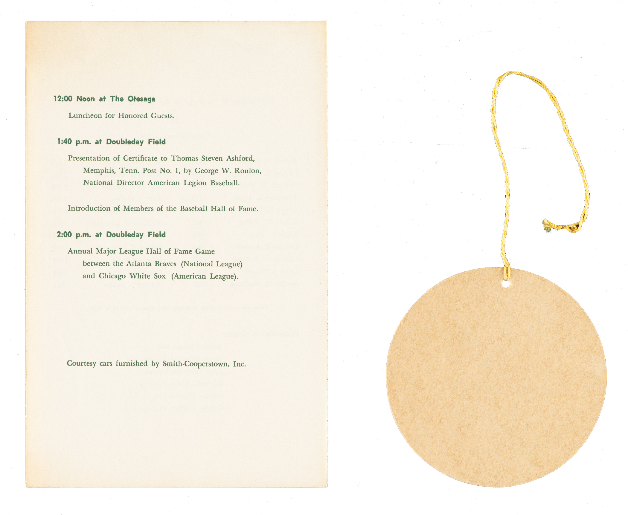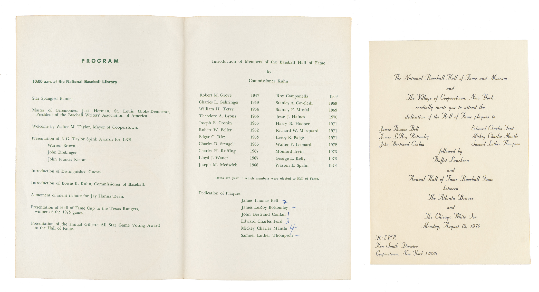 1974 Baseball Hall of Fame induction-ceremony program honoring that year's inductees: Mickey Mantle, Whitey Ford, Cool Papa Bell, Jocko Conlan (umpire), Jim Bottomley, and Sam Thompson. The fold-over program (5.5 x 8.5 inches) is in Excellent condition overall. Accompanied by a Hall of Fame Game field pass (4 inches in diameter), which is also in Excellent condition overall. Total: 2 items (program and field pass).
