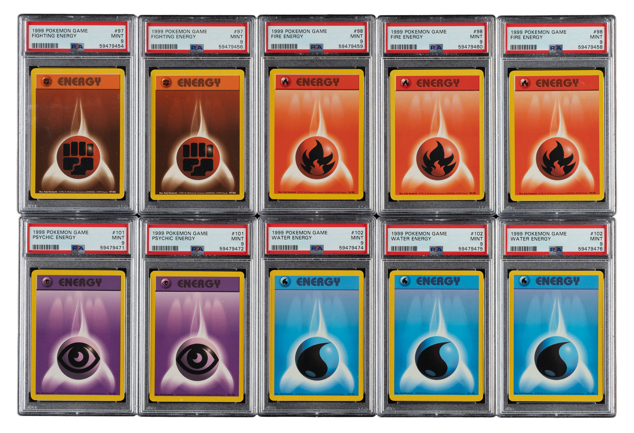 Collection of ten 1999 Pokemon Base Set Energy cards, each professionally graded and encapsulated by PSA as MINT 9. This collection consists of the following: #two Fighting Energy, three Fire Energy, two Psychic Energy, and three Water Energy. Total 10 cards.