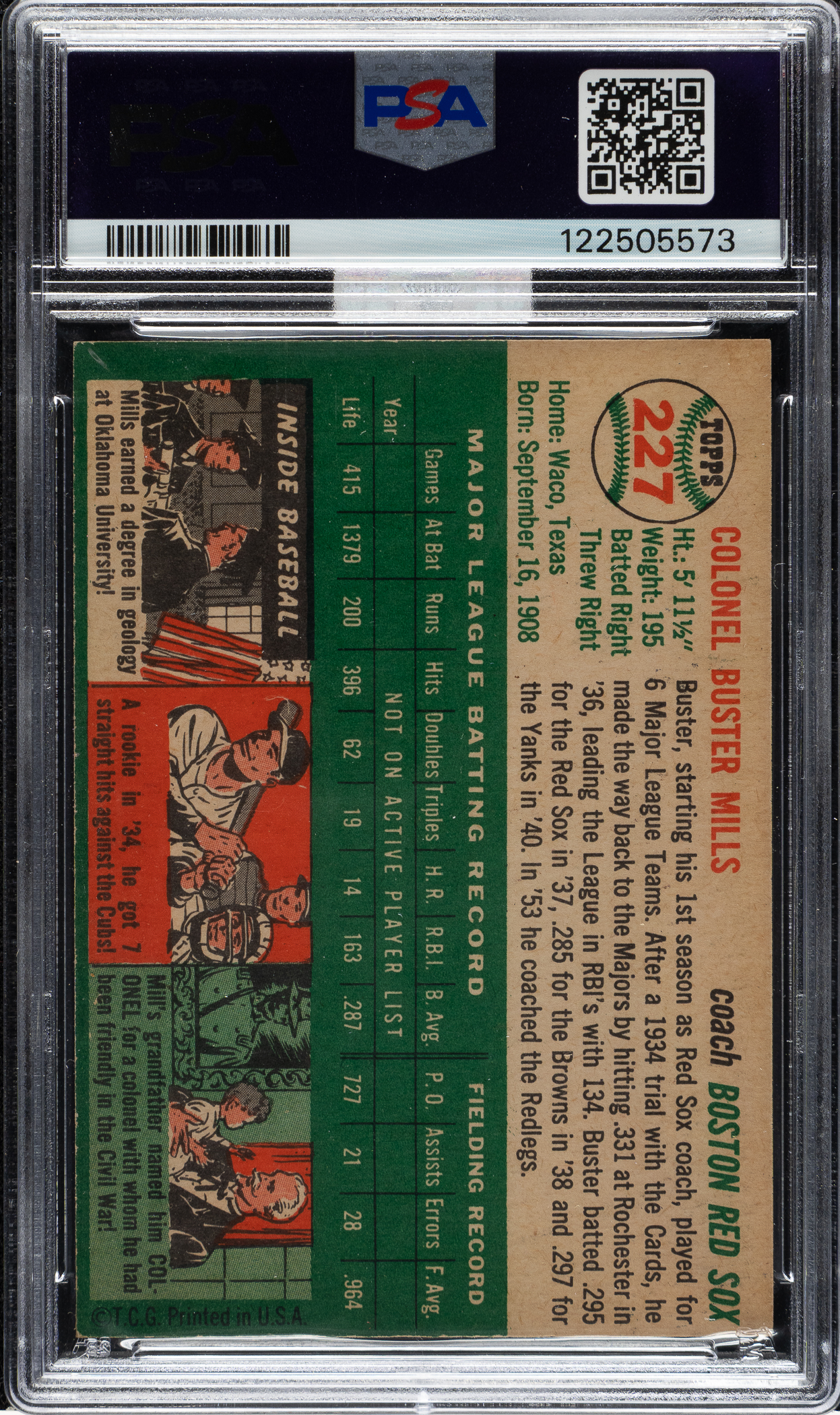 Graded NM 7 by PSA. Boston Red Sox. Awarded an MBA Silver Diamond by Mike Baker Authenticated for high-end eye appeal. A corresponding MBA sticker is affixed to the front of the holder.