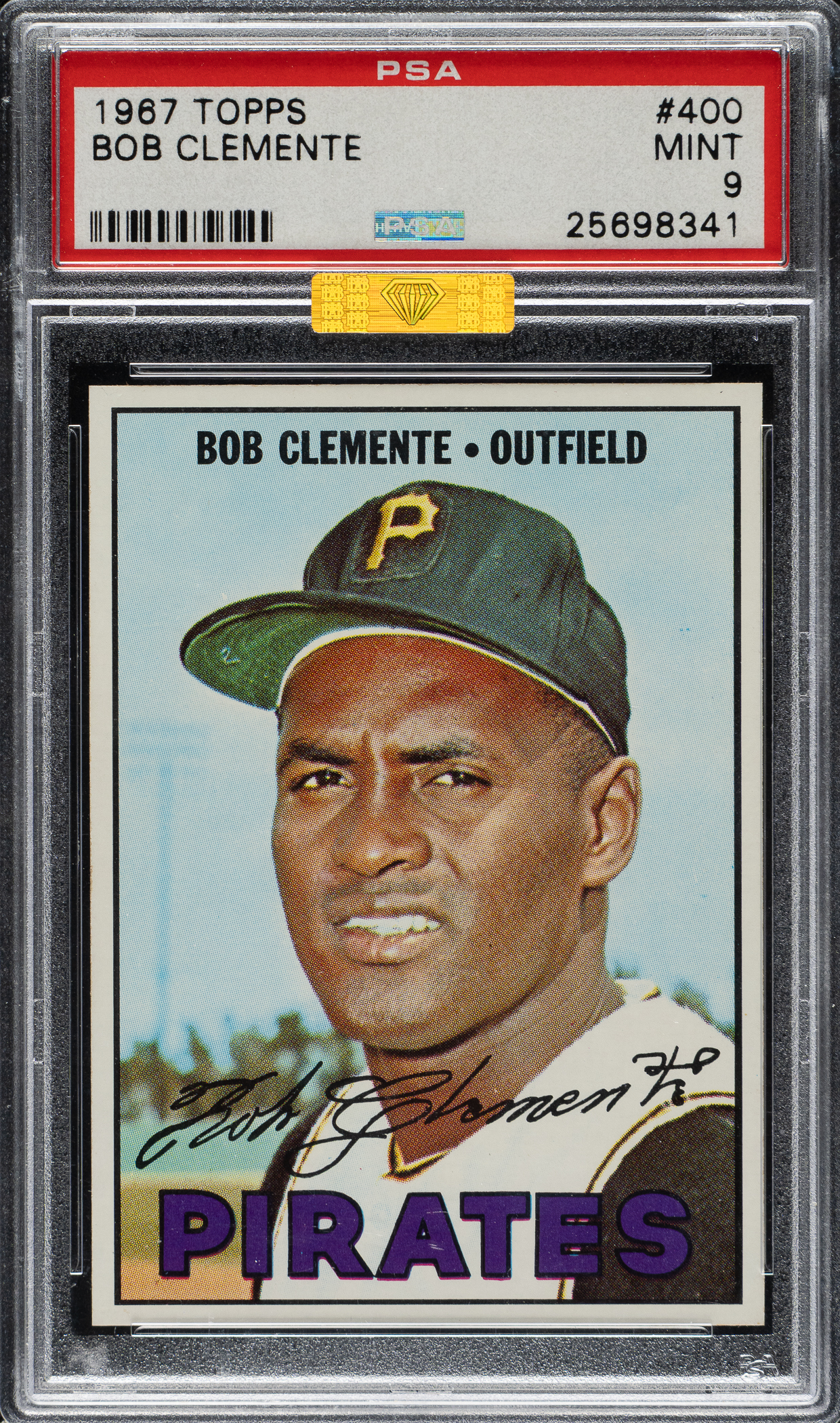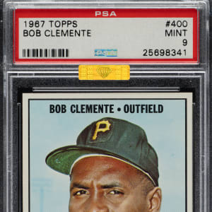 Graded MINT 9 by PSA. Only three examples have been graded higher by PSA out of 5,672 cards evaluated to date. Stunning example of Roberto Clemente's 1967 Topps card. This example boasts bright colors, a crisp image, sharp corners, and excellent centering. Clean reverse. This is a world-class example of this classic 1960s bubble-gum card. Awarded an MBA Gold Diamond by Mike Baker Authenticated for high-end eye appeal. A corresponding MBA sticker is affixed to the front of the holder.