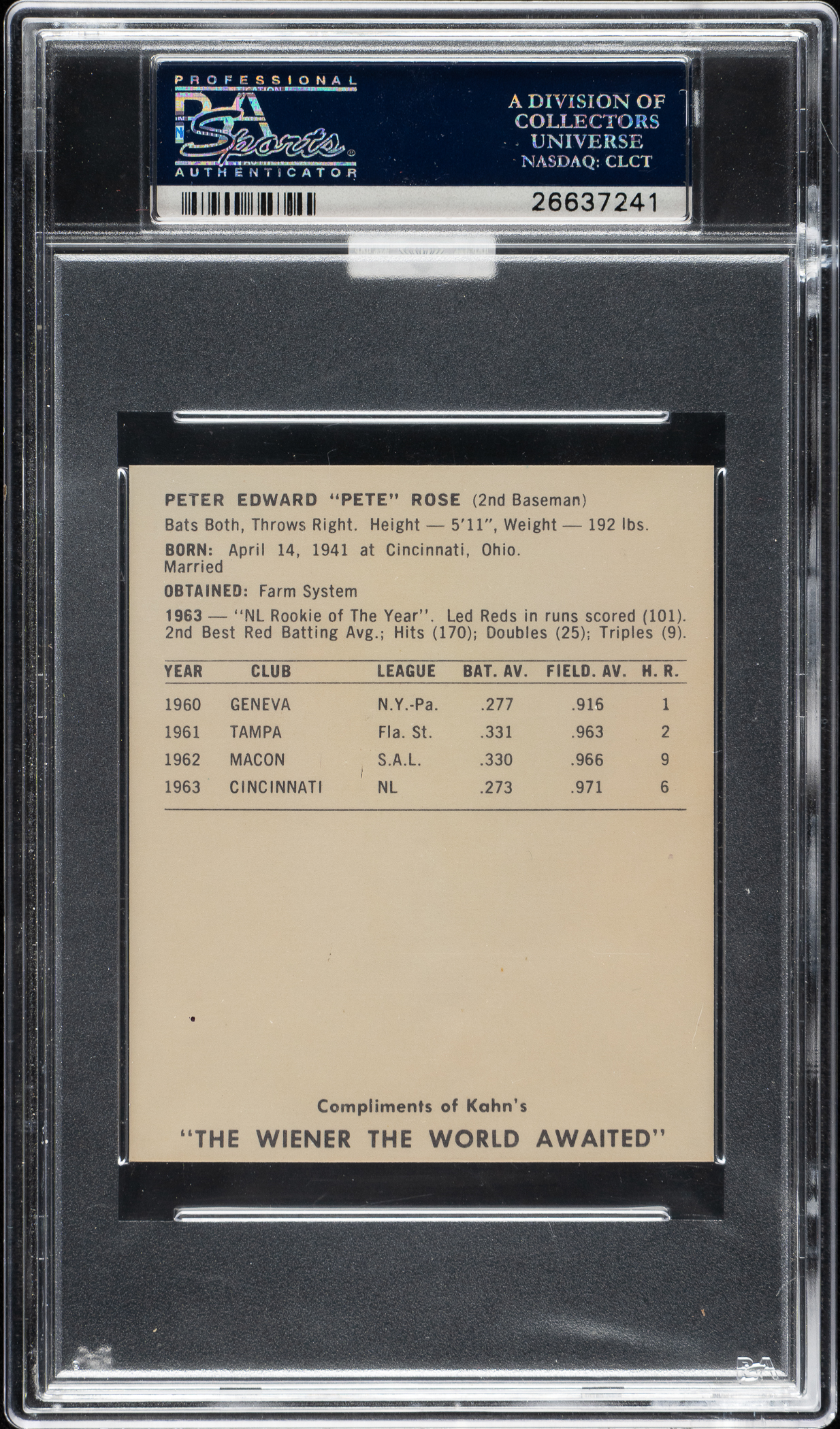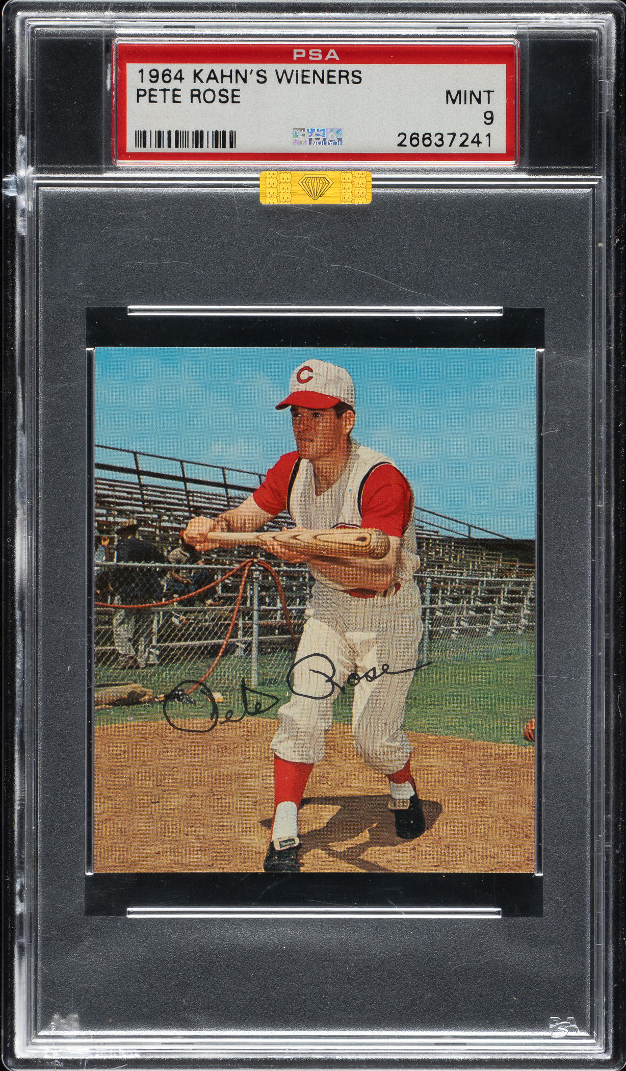 Graded MINT 9 by PSA. Stunning example of Pete Rose from the 1964 Kahn's Wieners set. This striking, colorful, and scarce 1960s regional issue features players from the Reds, Pirates, and Indians. Kahn's Wieners cards are far rarer than most 1960s baseball cards and are one of the few food issues of the era. The offered card boasts beautiful colors, superb image quality, and sharp corners. Clean reverse with bold black text. This is a spectacular world-class example of one of the key cards from this popular 1960s food issue. Awarded an MBA Gold Diamond by Mike Baker Authenticated for high-end eye appeal. A corresponding MBA sticker is affixed to the front of the holder.