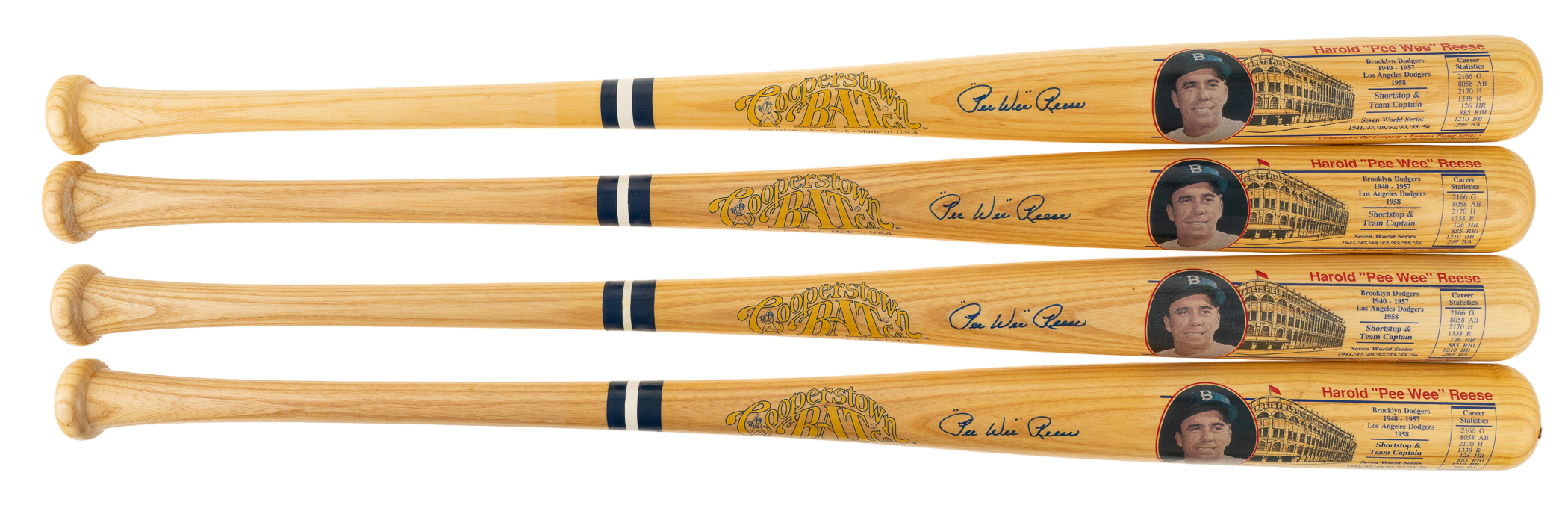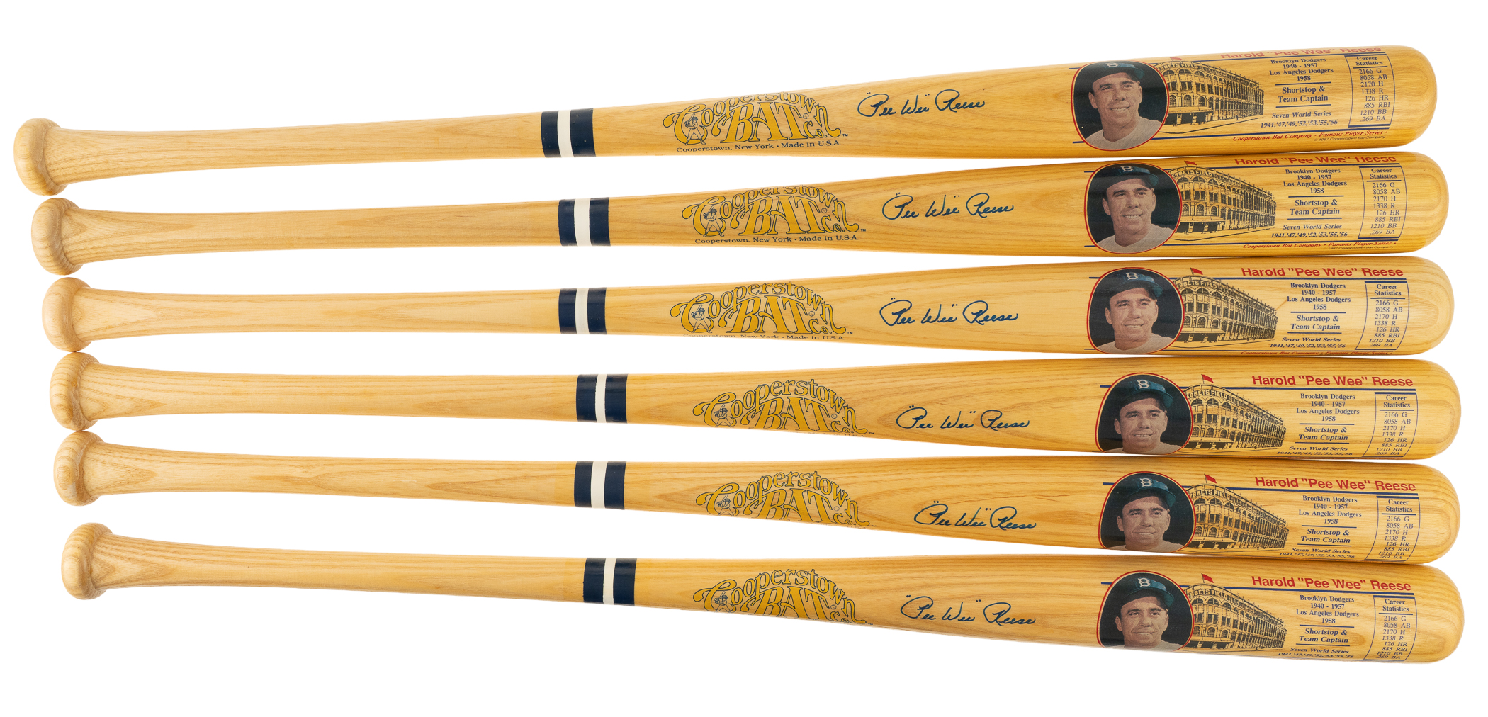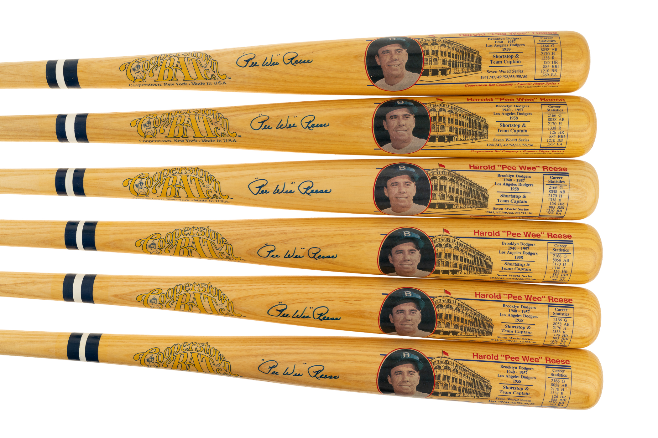 Collection of 10 bats from the Cooperstown Bat Company's "Famous Player Series," each signed on the sweet spot of the barrel by Hall of Famer Pee Wee Reese. The attractive bats, which feature both the player's portrait and career statistics on the barrel, are popular display pieces for collectors, with signed examples especially prized. 1987 copyright. All the signatures are boldly scripted in blue Sharpie. The bats (34 inches in length) all are in Near Mint condition. Total: 10 bats. Auction LOA from James Spence/JSA. The size/weight of this item requires that there will be an additional shipping charge for this lot.