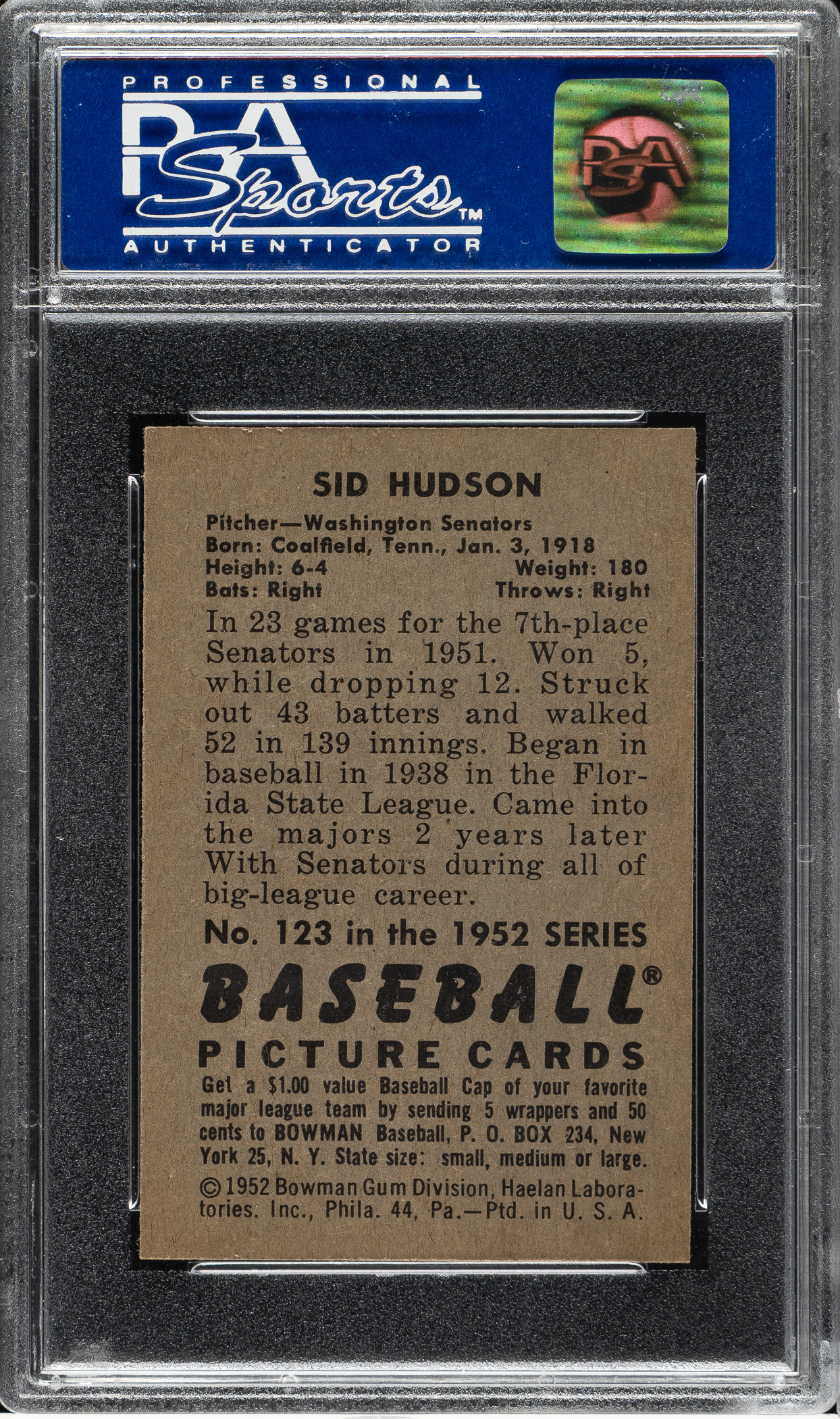 Lot # 985: 1952 Bowman #123 Sid Hudson PSA MINT 9
