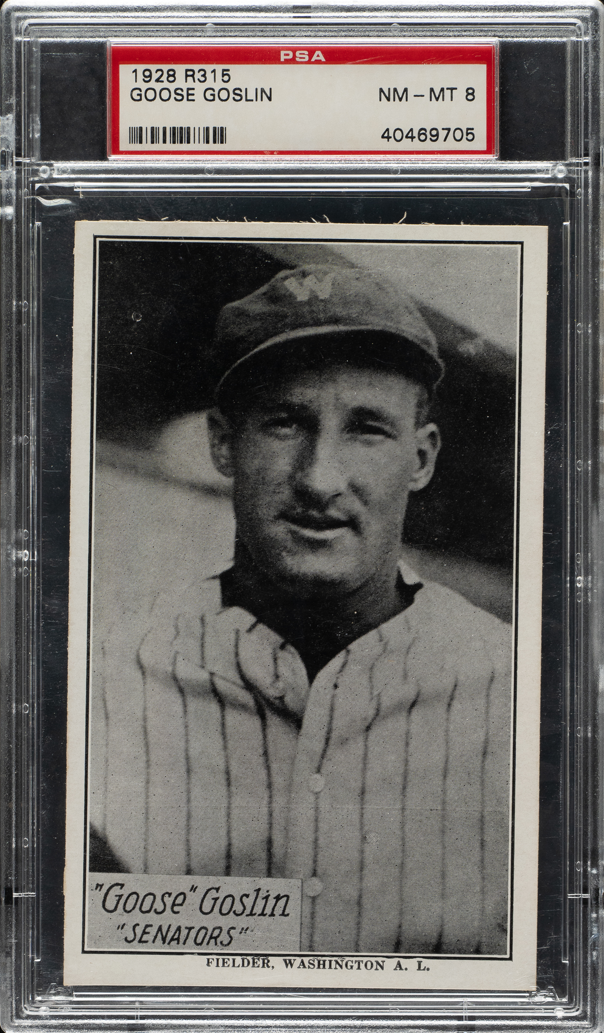 Graded NM-MT 8 by PSA. Washington Senators Hall of Famer Goose Goslin. One of only three examples graded at this level by PSA with none higher!