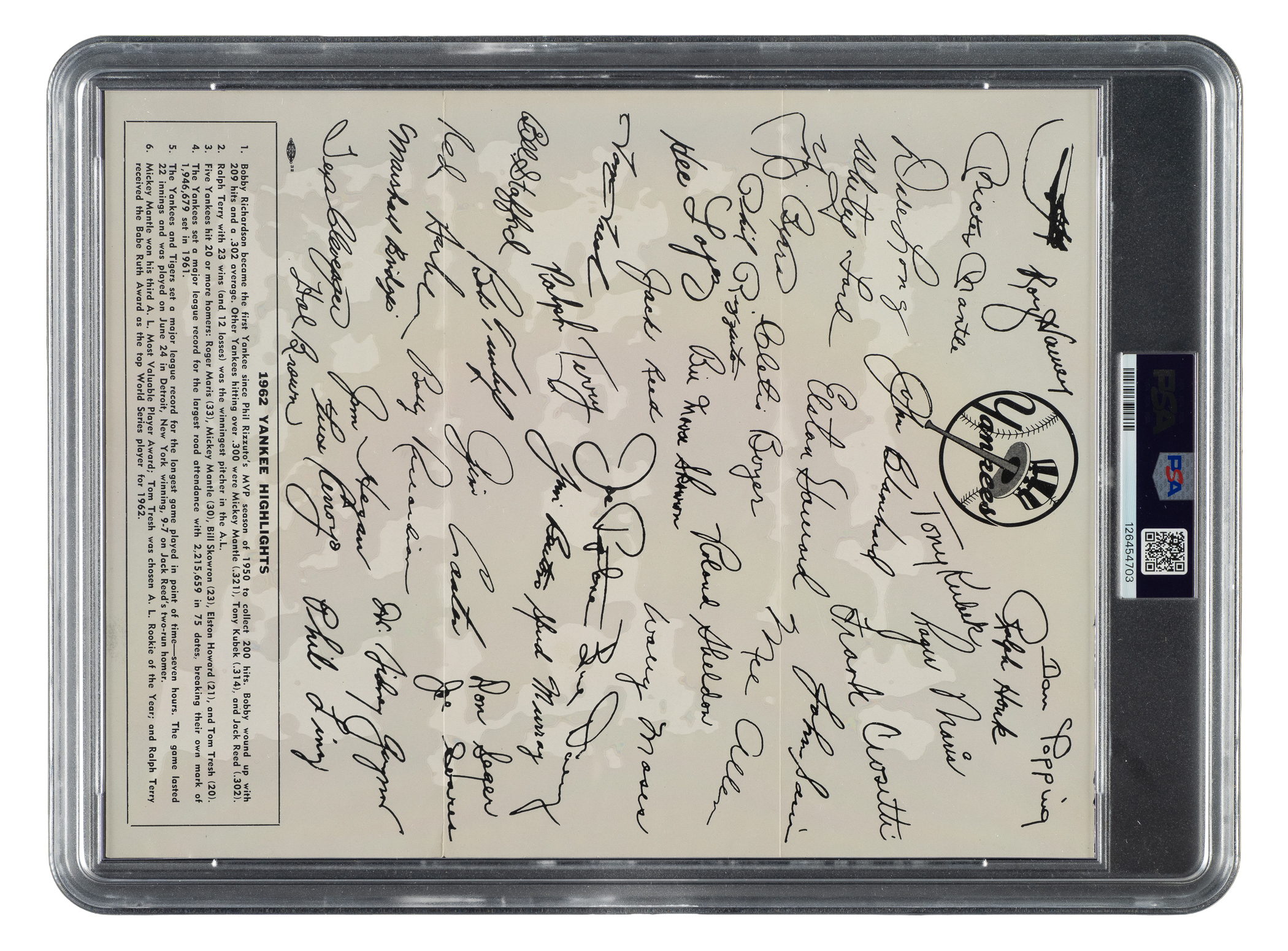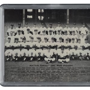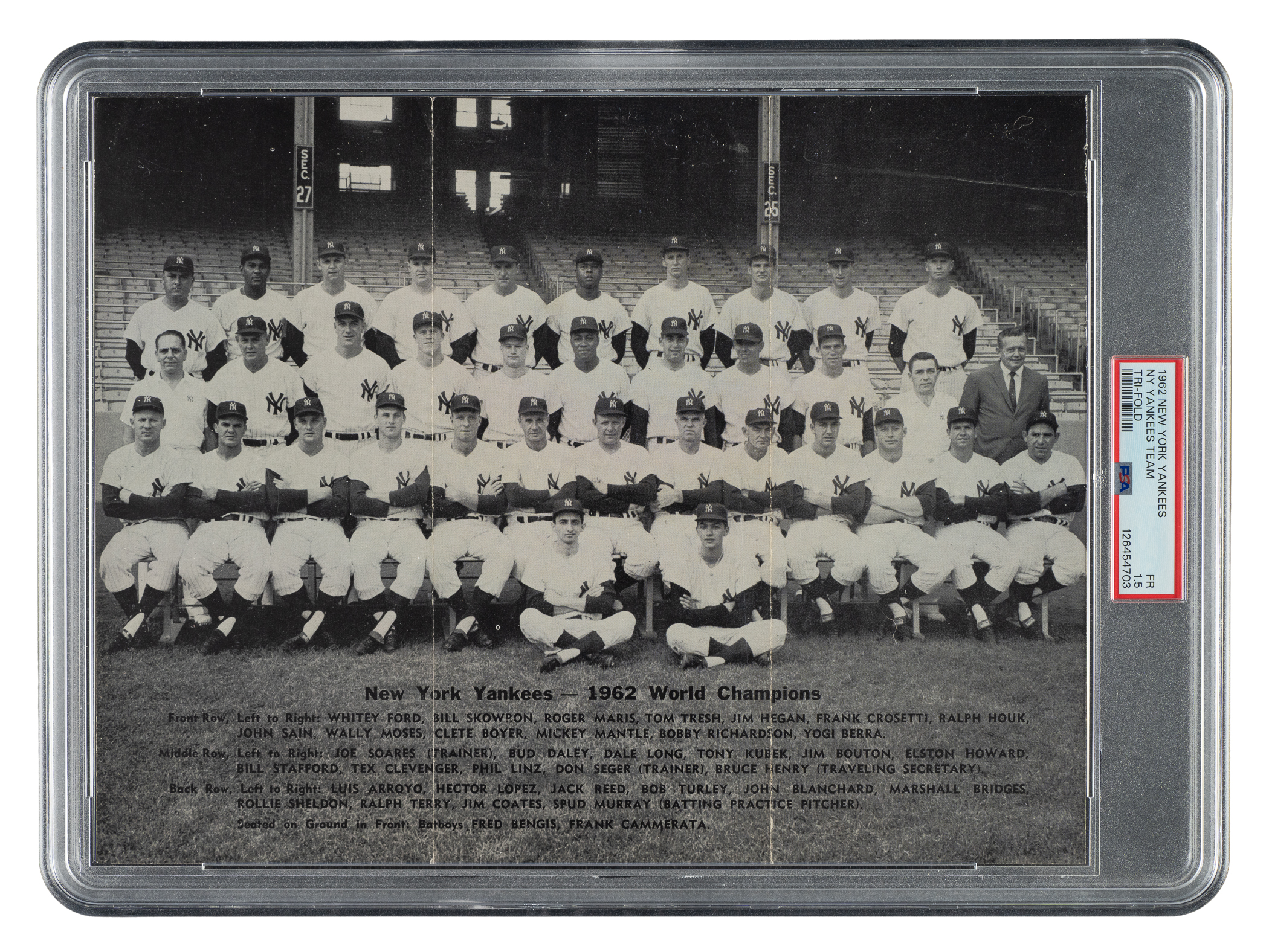 Offered is a rarely-seen New York Yankees tri-fold team photo dating from the 1962 season. Graded FAIR 1.5 by PSA, this is one of only two examples graded at this level by PSA with just one higher. The design features the club members in a traditional team pose at Yankee Stadium. Below the image, printed in black, are the names of the 36 team members pictured, including Mantle, Maris, Berra, Ford, Stengel (Mgr.), Crosetti (coach), E. Howard, and Skowron. The black-letter caption reads "New York Yankees - 1962 World Champions." The reverse of the piece has the facsimile signatures of all 36 team members pictured. The photo (11 x 8.5 inches), printed on thick paper stock, displays splitting at the fold lines and minor damage to the right edge.