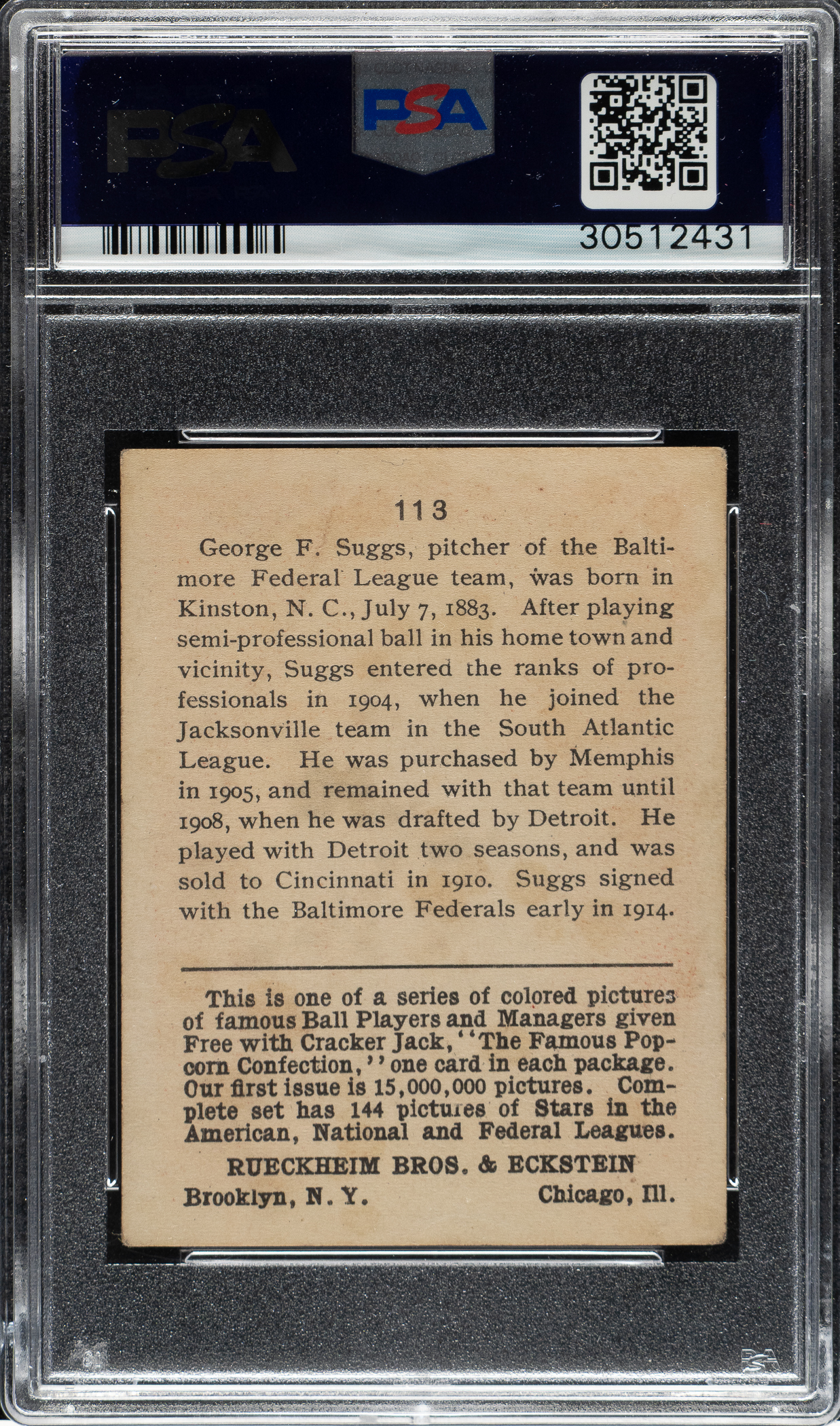 Lot # 577: 1914 E145 Cracker Jack #113 George Suggs PSA VG-EX 4