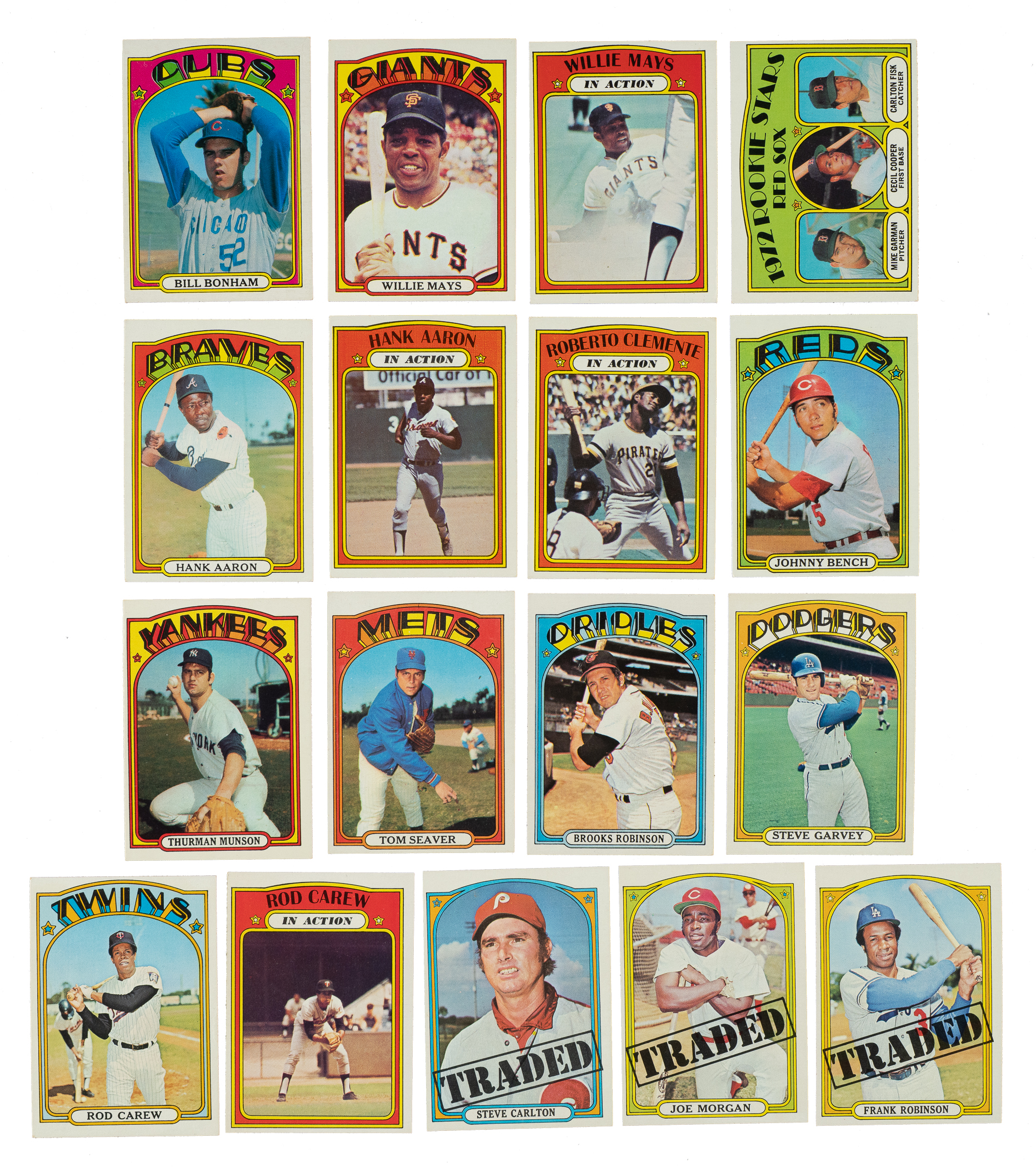 Presented is a complete set consisting of 787 cards from the 1972 Topps series, one of the most popular Topps sets of the decade. Condition is 14% Nr/Mt to Nr/Mt-Mt (mostly Nr/Mt), 63% Ex to Ex-Mt, and 23% Vg to Vg-Ex (including a few with a slight miscut). We have selected four cards for grading and encapsulation by SGC. Keys: #29b Bonham/green under "C" and "S" (Vg+), 49 Mays (Ex), 50 Mays IA (Vg-Ex), 79 Fisk RC (80/20 L/R, otherwise Ex-Mt+), 132 Morgan (slight trim, otherwise Ex-Mt), 299 Aaron (Vg-Ex+), 300 Aaron IA (Vg-Ex+), 309 Clemente (EX/NM 6), 310 Clemente IA (Vg+), 433 Bench (Vg-Ex), 435 Jackson (NM 7), 441 Munson (Ex due to centering), 445 Seaver (Vg-Ex), 550 B. Robinson (Ex), 559 Rose (NM 7), 595 Ryan (EX 5), 686 Garvey (Vg-Ex+), 695 Carew (Vg-Ex), 696 Carew IA (25/75 L/R, otherwise Nr/Mt+), 751 Carlton Traded (Ex), 752 Morgan Traded (Ex+ due to centering), and 754 F. Robinson Traded (Ex+). This is a very attractive mid- to high-grade set of one of the great Topps classics of the era! Total: 787 cards.