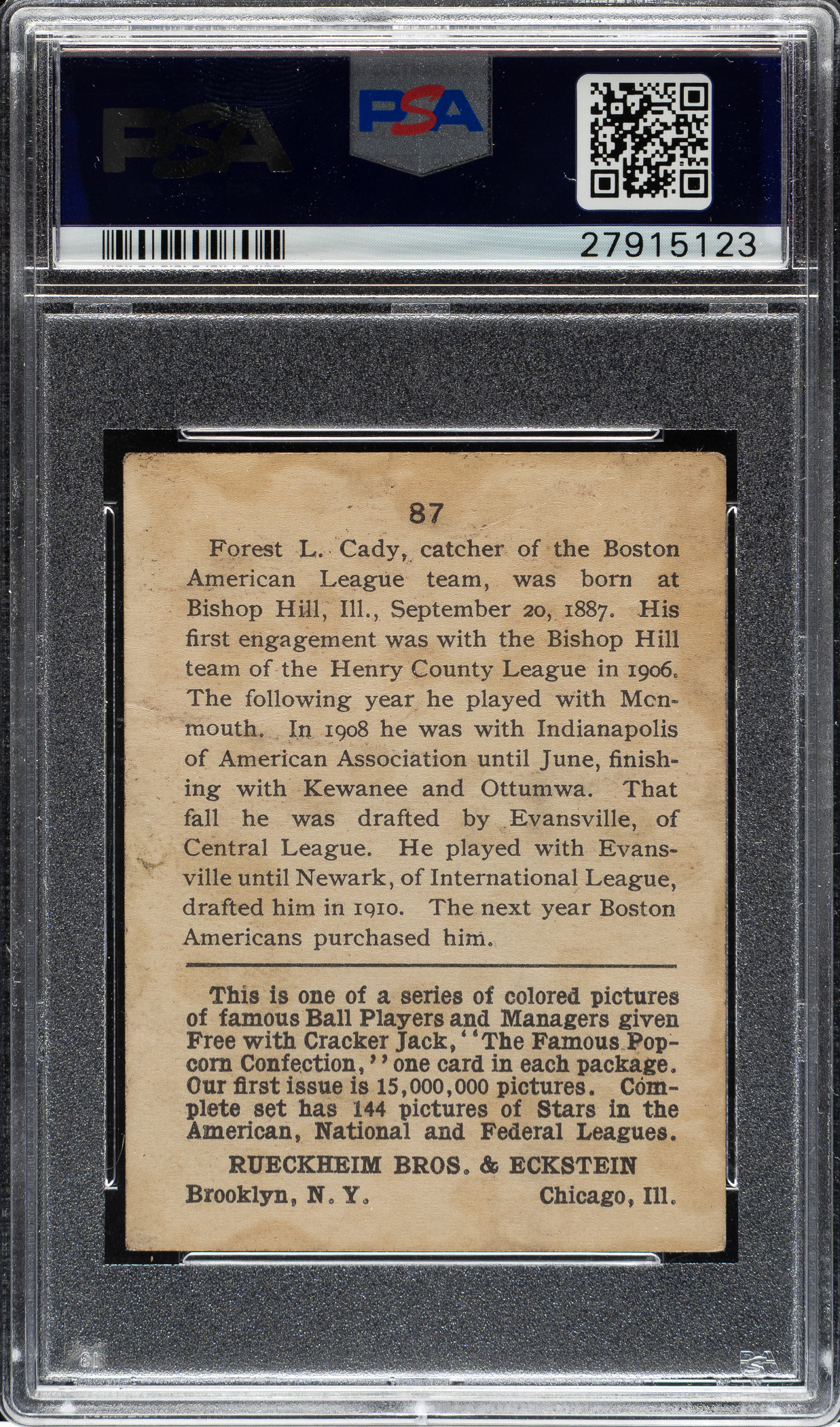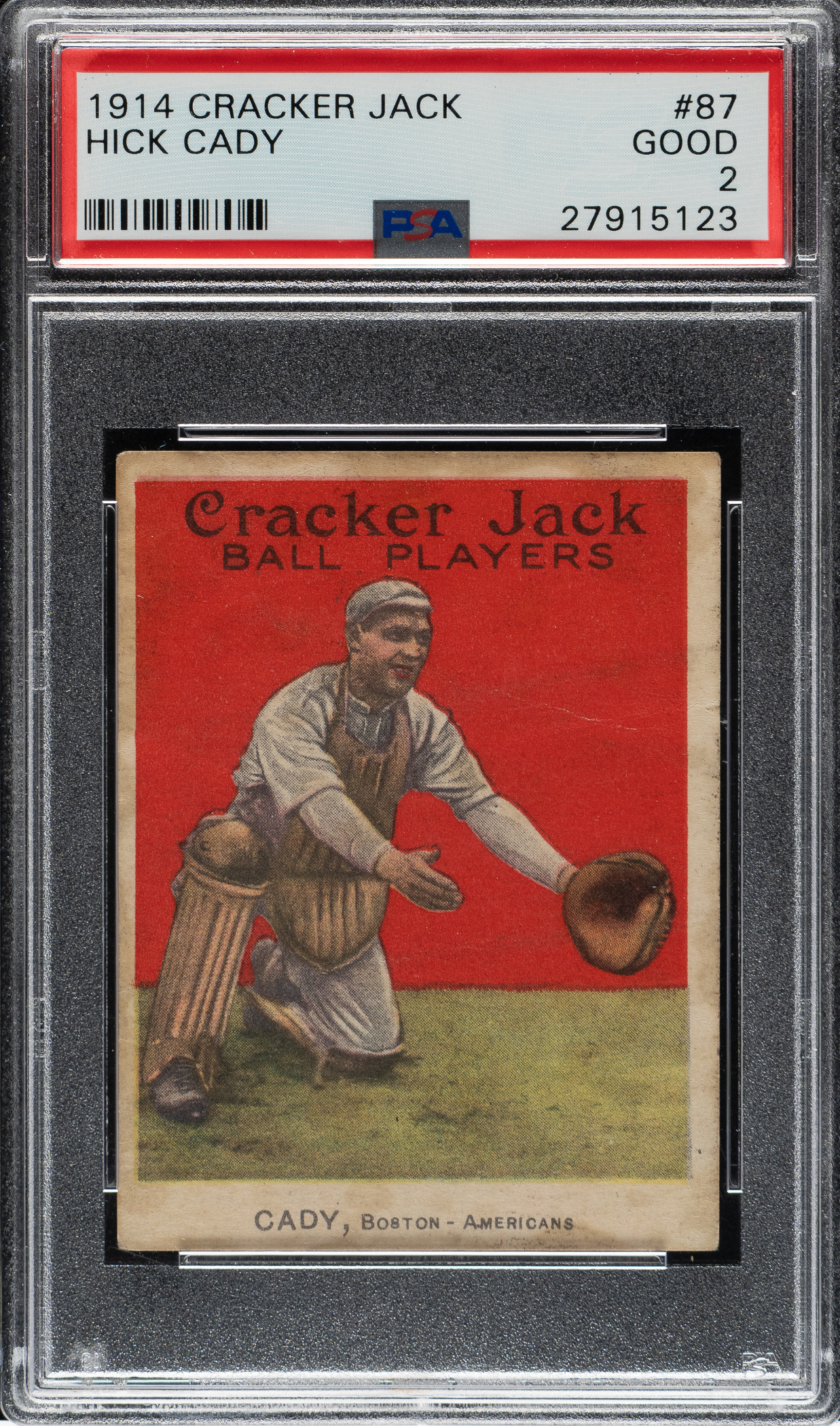 Graded GOOD 2 by PSA. Catcher Hick Cady of the Boston Red Sox. Cady has always been among the most difficult-to-find "commons" within the 1914 set.