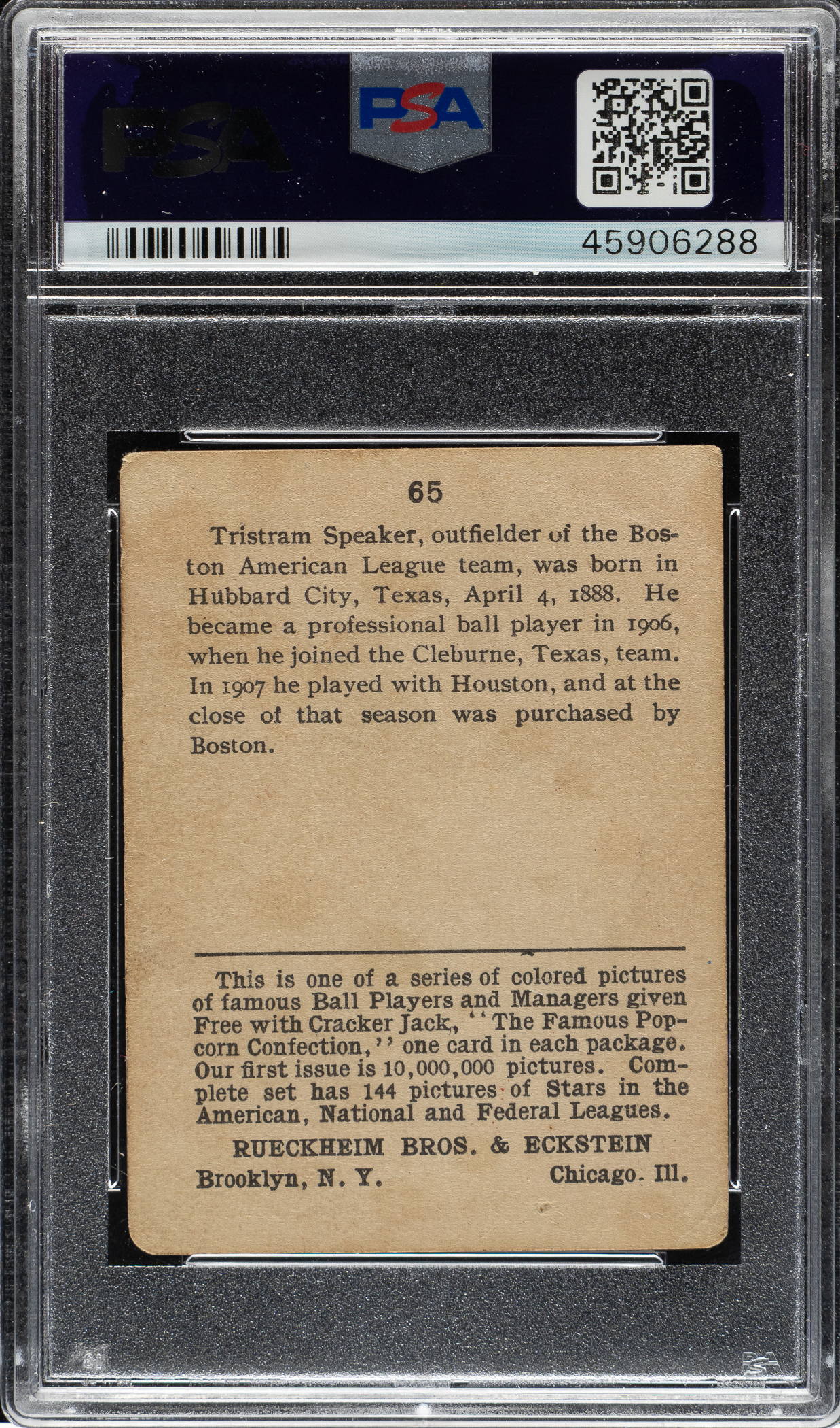 Graded GOOD 2 by PSA. Beautiful example of Boston Red Sox Hall of Famer Tris Speaker from the legendary 1914 Cracker Jack series. This card displays a brilliant red background, outstanding registration, and even corner wear. Only faint traces of caramel staining are visible, far less than normally encountered on 1914 #144 Series Cracker Jack cards. Downgraded due to light, unobtrusive creasing and a surface indentation along the bottom of the reverse. This is a tremendous example from this classic set that would be an outstanding addition to any high-quality 1914 Cracker Jack set or prewar-card collection.