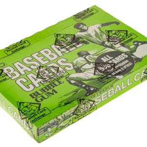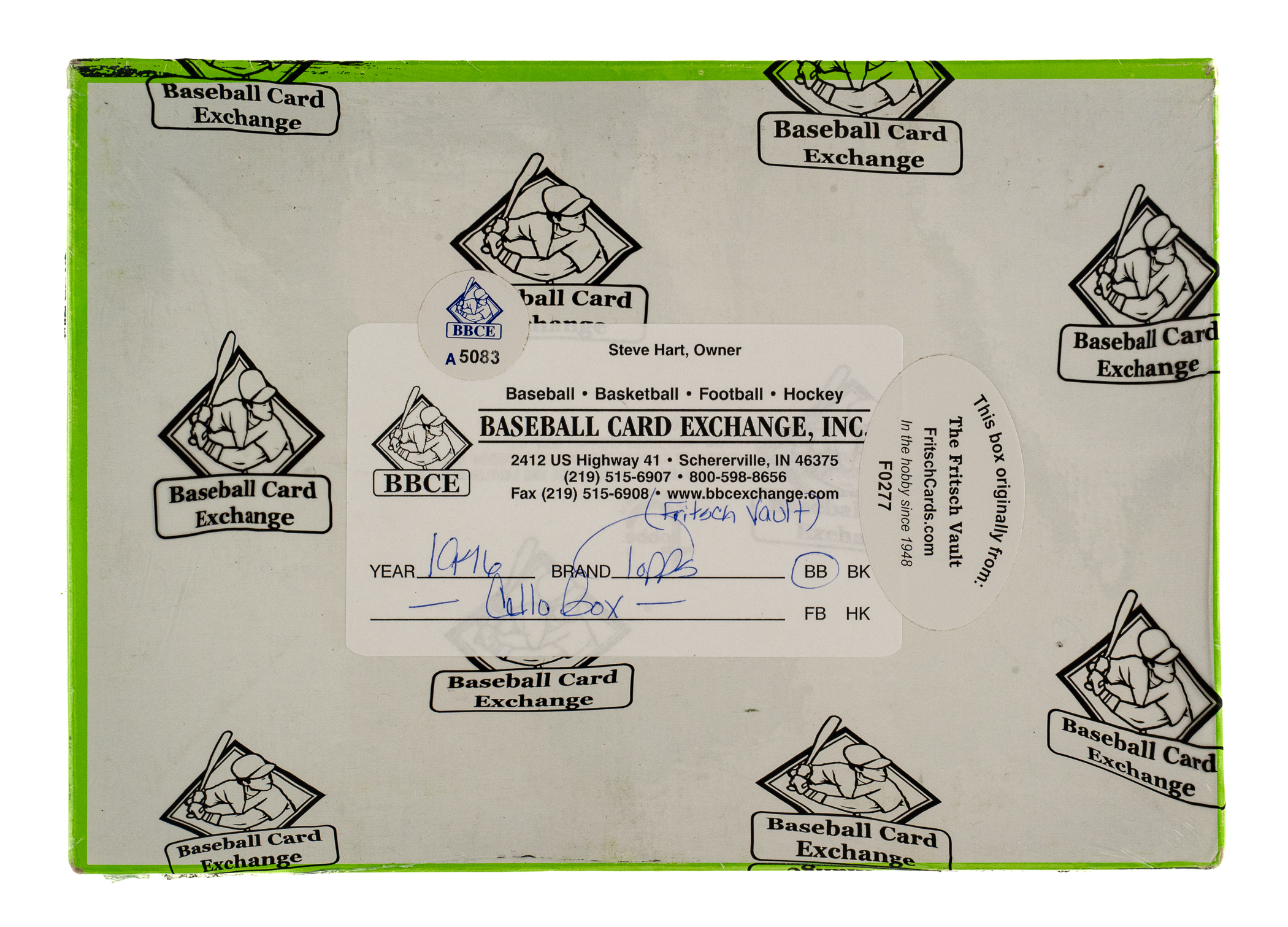 Complete, original unopened cello box of 1976 Topps baseball. This box originates directly from the legendary Larry Fritsch estate. It comes shrink-wrapped by Baseball Card Exchange (owned by Steve Hart, the foremost expert on unopened material) and bears the certified designation as having originated from the "Fritsch Vault." The box houses 24 cello packs, with each pack containing 18 cards for a total of 432 cards. The 1976 Topps set includes many Hall of Famers such as Brett, Eckersley (rookie), Yount, Ryan, and Aaron. All the other stars of the day are also included. The store display box is bright and bold with light shelf wear visible. An outstanding unopened box from this popular 1970s baseball set!