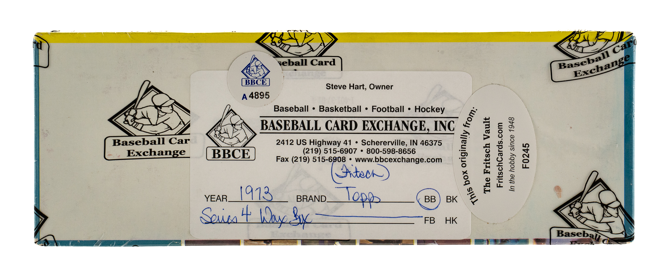 Complete, original unopened wax box of 1973 Topps baseball containing packs from the fourth series (#397-528). This wax box originates directly from the legendary Larry Fritsch Estate. It comes shrink-wrapped by Baseball Card Exchange (owned by Steve Hart, the foremost expert on unopened material) and bears the certified designation as having originated from the "Fritsch Vault." This box houses a total of 24 wax packs with each pack containing 10 cards for a total of 240 cards. The 1973 Topps fourth series is highlighted by Hall of Famers Juan Marichal and Willie McCovey as well as the All-Time Leaders series, featuring Babe Ruth and Lou Gehrig, along with other important stars. The box displays beautifully, appearing almost exactly as it did on the store shelves over 50 years ago. This is an incredible and extremely rare unopened wax box from this very popular set.