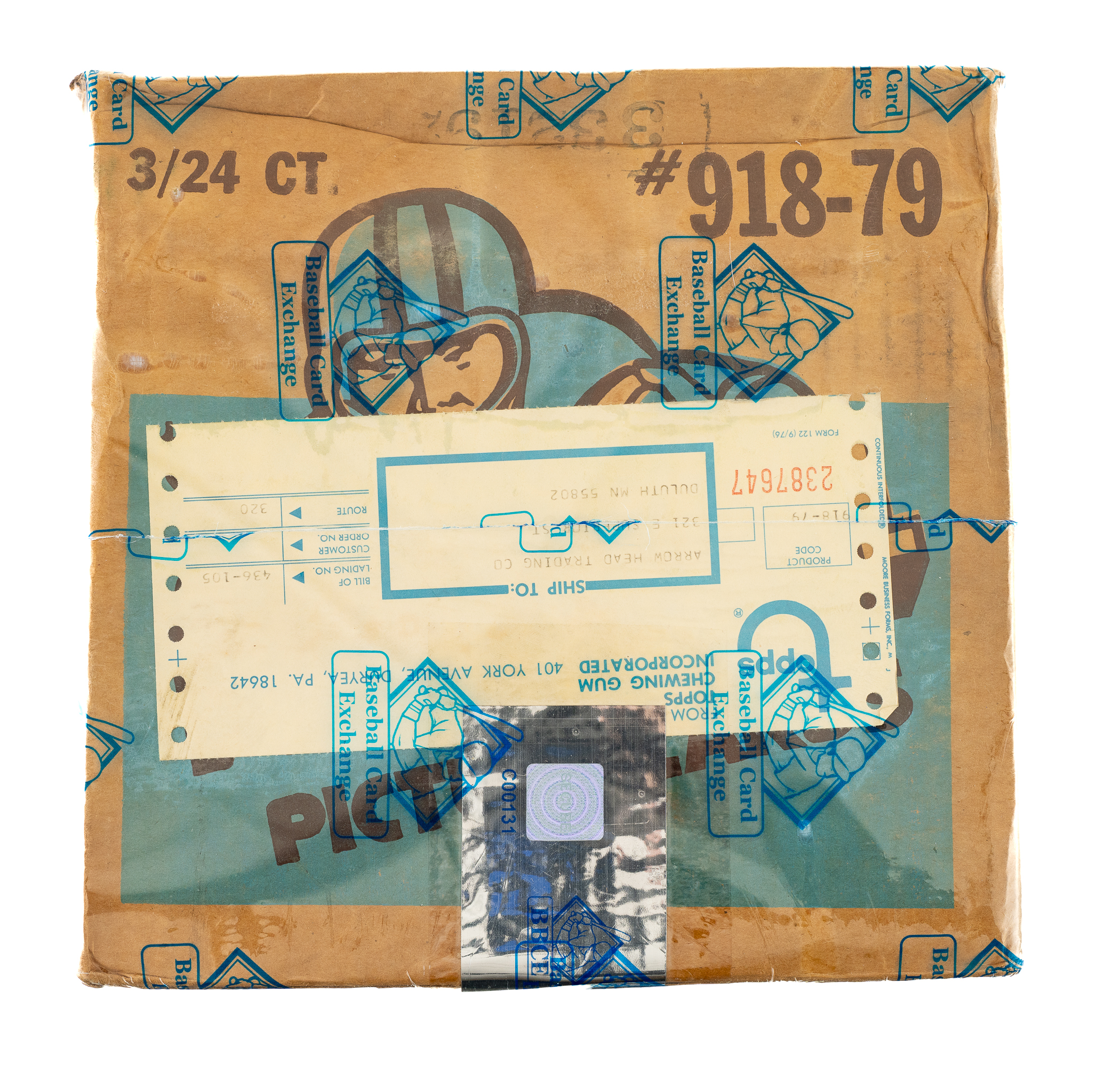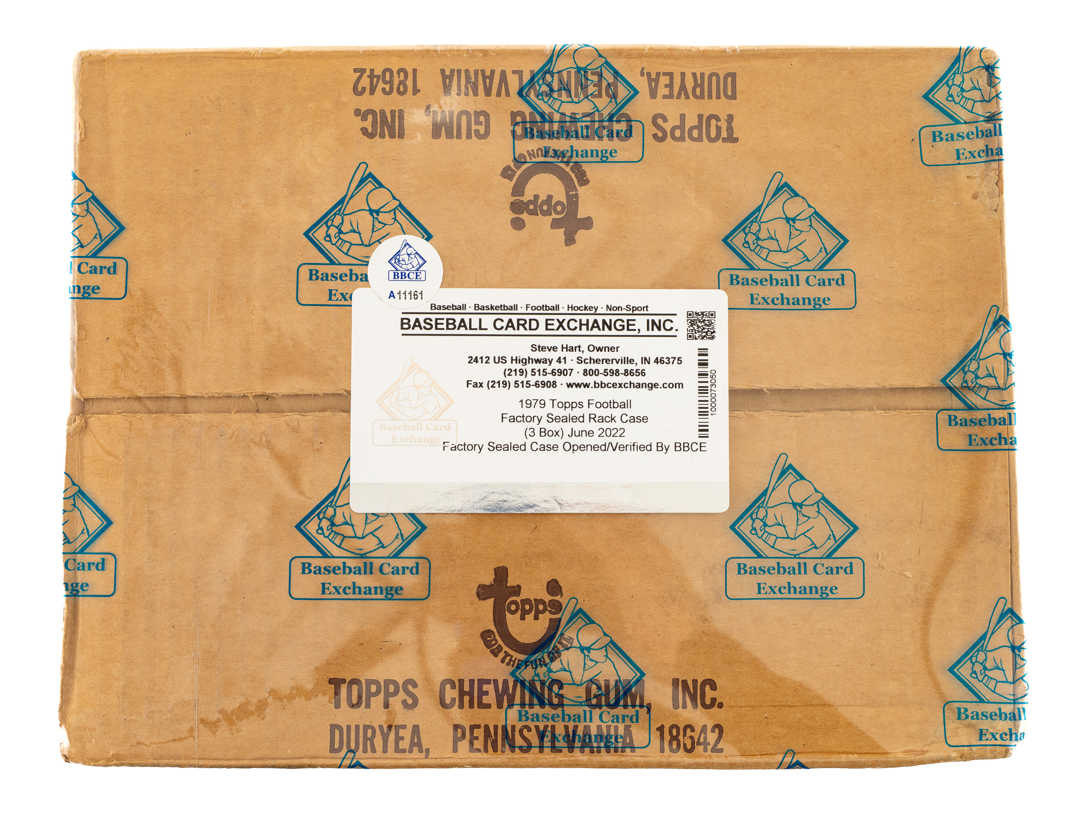 Complete, original unopened rack case of 1979 Topps football containing three boxes with 24 packs per box for a total of 72 packs. With each pack containing 42 cards, the case represents a total of 3,024 cards. This case comes shrink-wrapped by Baseball Card Exchange (owned by Steve Hart, the foremost expert on unopened material). Please note the case, which was presented for authentication factory-sealed from Topps, has been opened and verified by BBCE (as is their new policy) and is noted as such on their authentication label. Each box inside comes individually shrink-wrapped by BBCE and is noted to have originated from a sealed case (FASC designation on label). The "factory sealed" distinction is particularly important and makes the offered case even more impressive. The 1979 Topps set features rookie cards of Hall of Famers Earl Campbell, James Lofton, and Ozzie Newsome as well as numerous other stars and Hall of Famers, including Terry Bradshaw, Walter Payton, and Roger Staubach. While it is impossible to provide guarantees with reference to grading of unopened material, there is the real possibility that within this box are Gem Mint cards. The original outer case displays light-to-moderate wear. A tremendous opportunity to acquire this extraordinary and rarely seen rack case from the popular 1979 Topps football issue. The size/weight of this item requires that there will be an additional shipping charge for this lot.