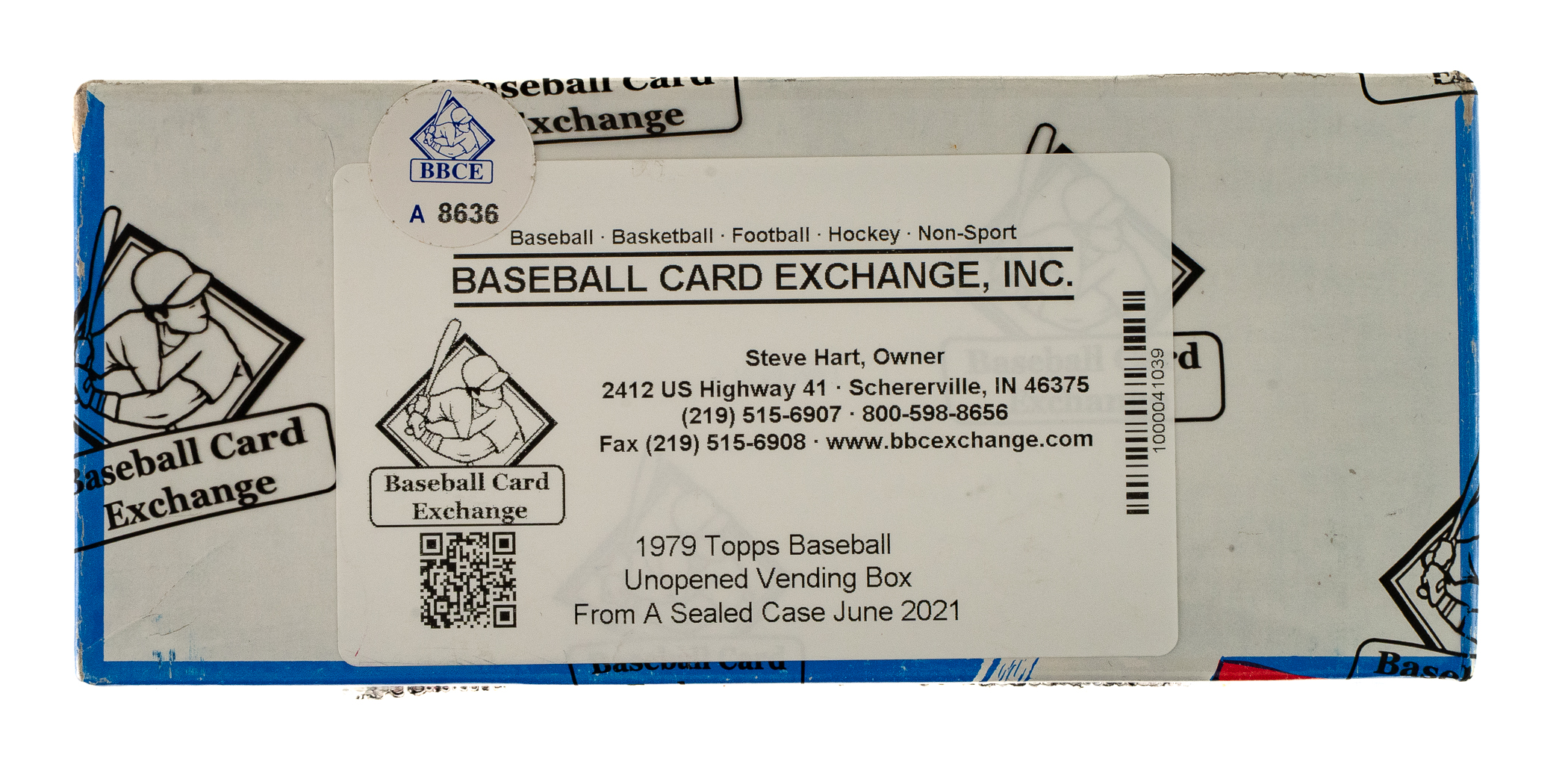 Original, unopened vending box of 1979 Topps baseball containing approximately 500 cards. The box comes shrink-wrapped by Baseball Card Exchange (owned by Steve Hart, the foremost expert on unopened material) and bears its certified designation as having originated from a sealed case.