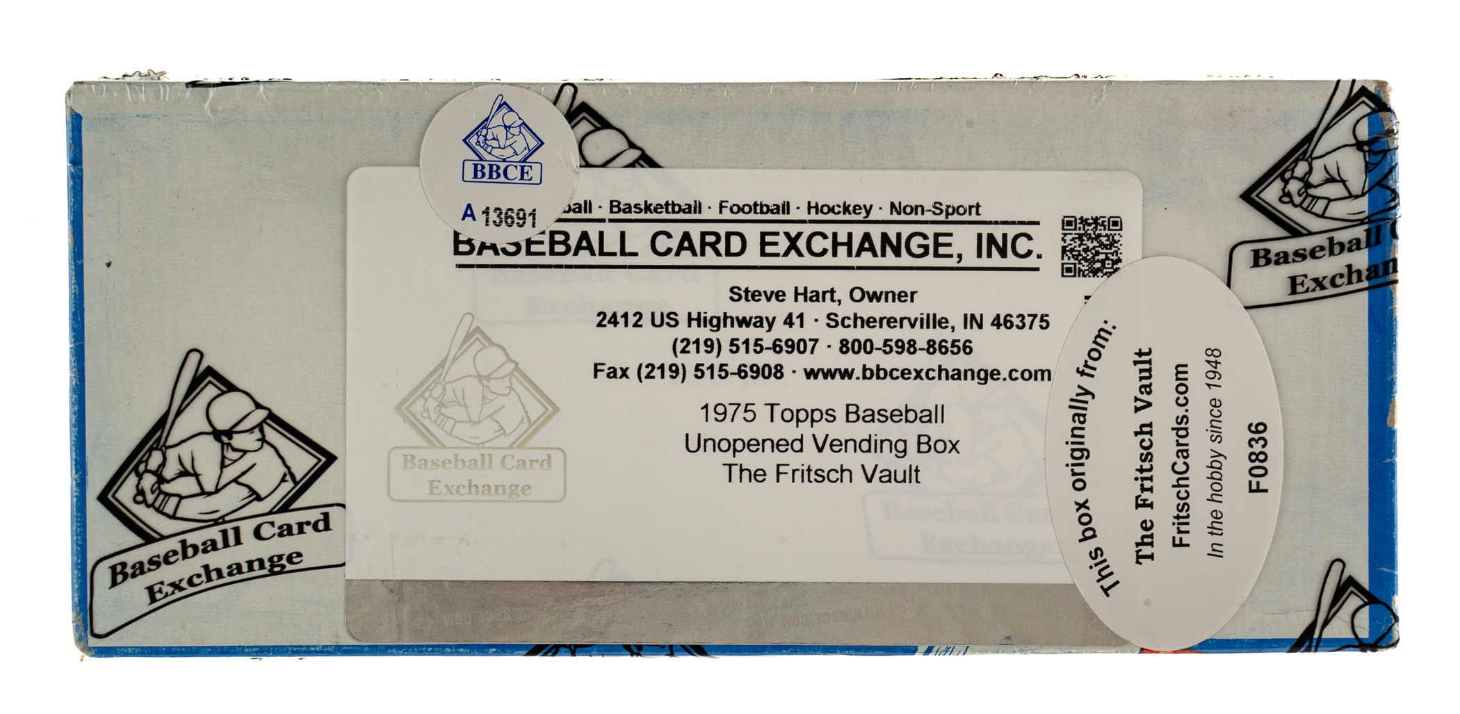 Original, unopened vending box of 1975 Topps baseball containing approximately 500 cards from this popular set. This box originates directly from the estate of the legendary Larry Fritsch. It comes shrink-wrapped by Baseball Card Exchange (owned by Steve Hart, the foremost expert on unopened material) and bears the certified designation as having originated from the "Fritsch Vault." While no guarantees can be made with respect to the grading of unopened material, there is a very real possibility that within this box are Mint or Gem Mint examples. The box displays beautifully, appearing almost exactly as it would have 51 years ago. This is a very impressive unopened vending box with superb provenance. It would be a worthy addition to even the most advanced collection of 1975 Topps or any unopened material collection.