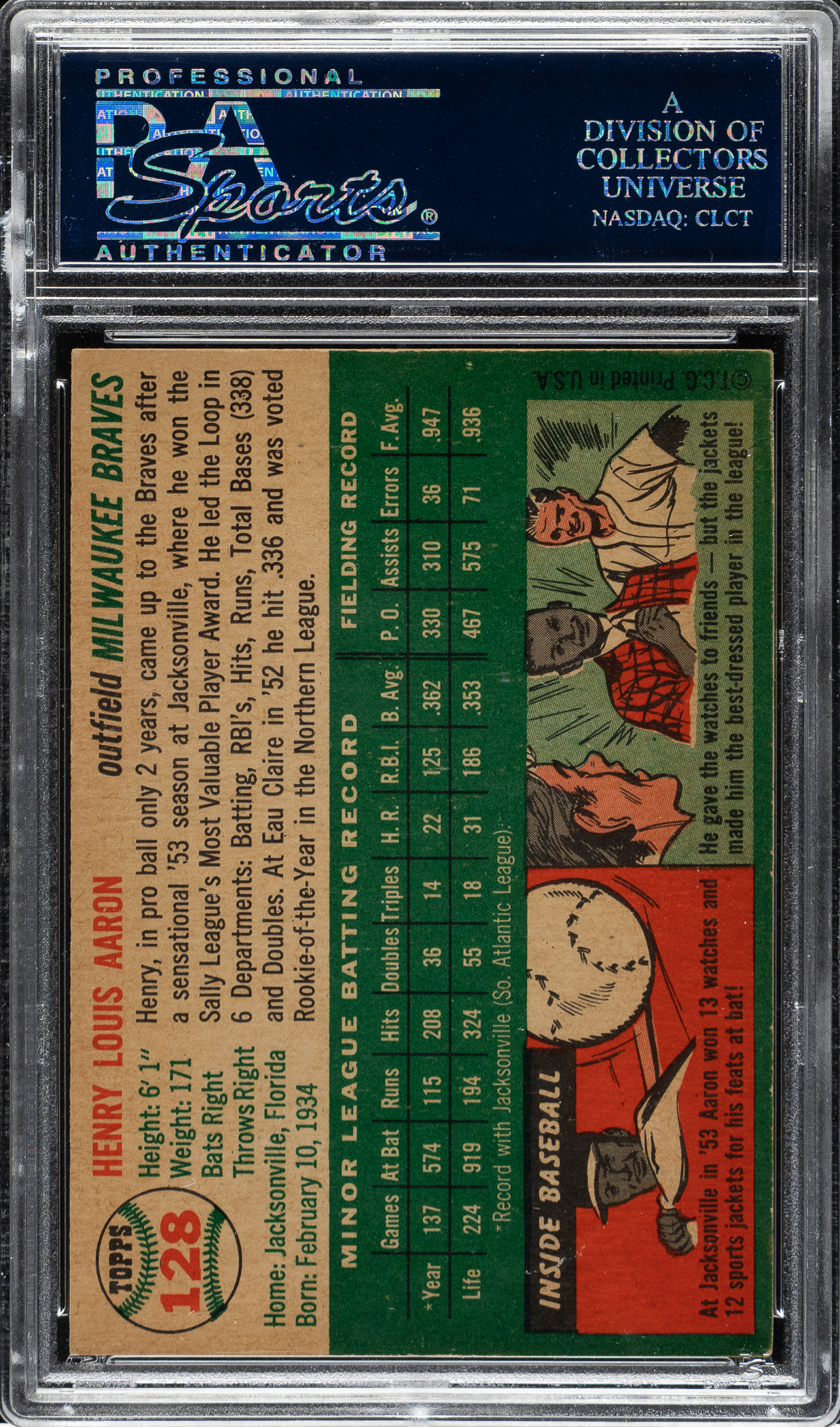Graded EX 5 by PSA. Very attractive mid-grade example of Milwaukee Braves Hall of Famer Hank Aaron's rookie card. One of card collecting's classics, Aaron's rookie card is the key to the 1954 Topps set and one of the most popular of all postwar baseball cards. This well-centered card has vibrant colors, outstanding registration, and light corner wear. Clean reverse.