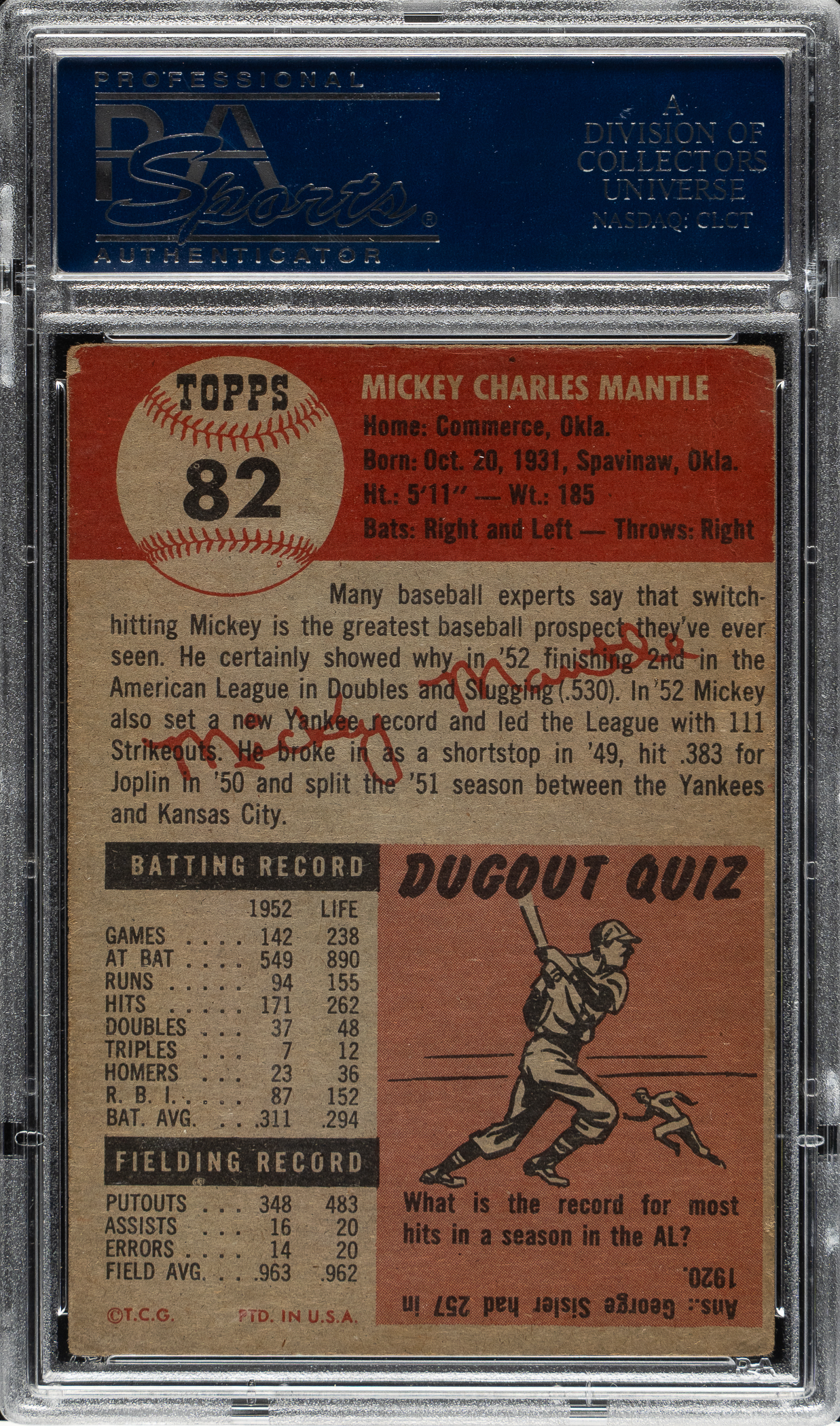 Graded VG+ 3.5 by PSA. Mid-grade example of New York Yankees Hall of Famer Mickey Mantle's second Topps card. One of card collecting's greatest classics, Mantle's second Topps card is the key to the 1953 Topps set and one of the most popular of all postwar baseball cards. The offered example has beautiful colors, a strong image, and honest corner wear. An unobtrusive crease in the top left (more visible on the reverse) and chipping along the red border contribute to the assigned grade. This is a solid mid-grade example of one of collecting's most famous cards.