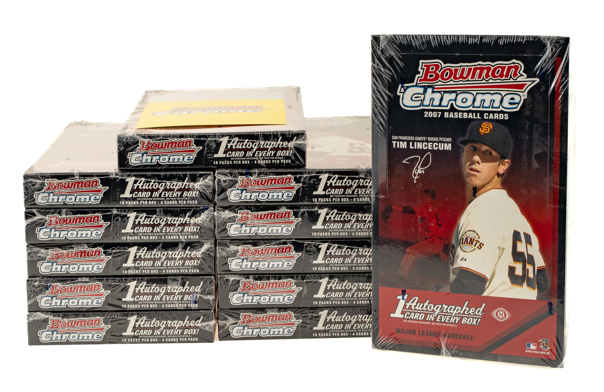Hobby case (factory seals broken) of 2007 Bowman Chrome featuring 12 unopened boxes. The keys to this set are the rookie cards of Tim Lincecum and Ryan Braun. There is one autograph card and five parallel cards per box on average. An outstanding opportunity to acquire a hobby case of this popular modern baseball card issue. The size/weight of this item requires that there will be an additional shipping charge for this lot.
