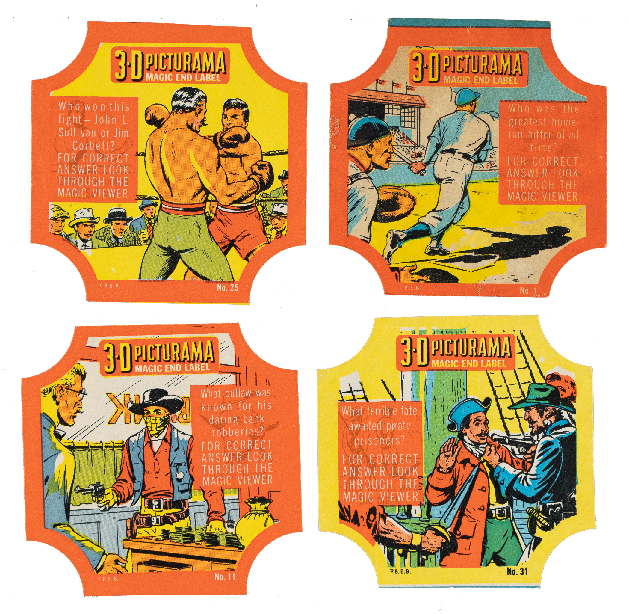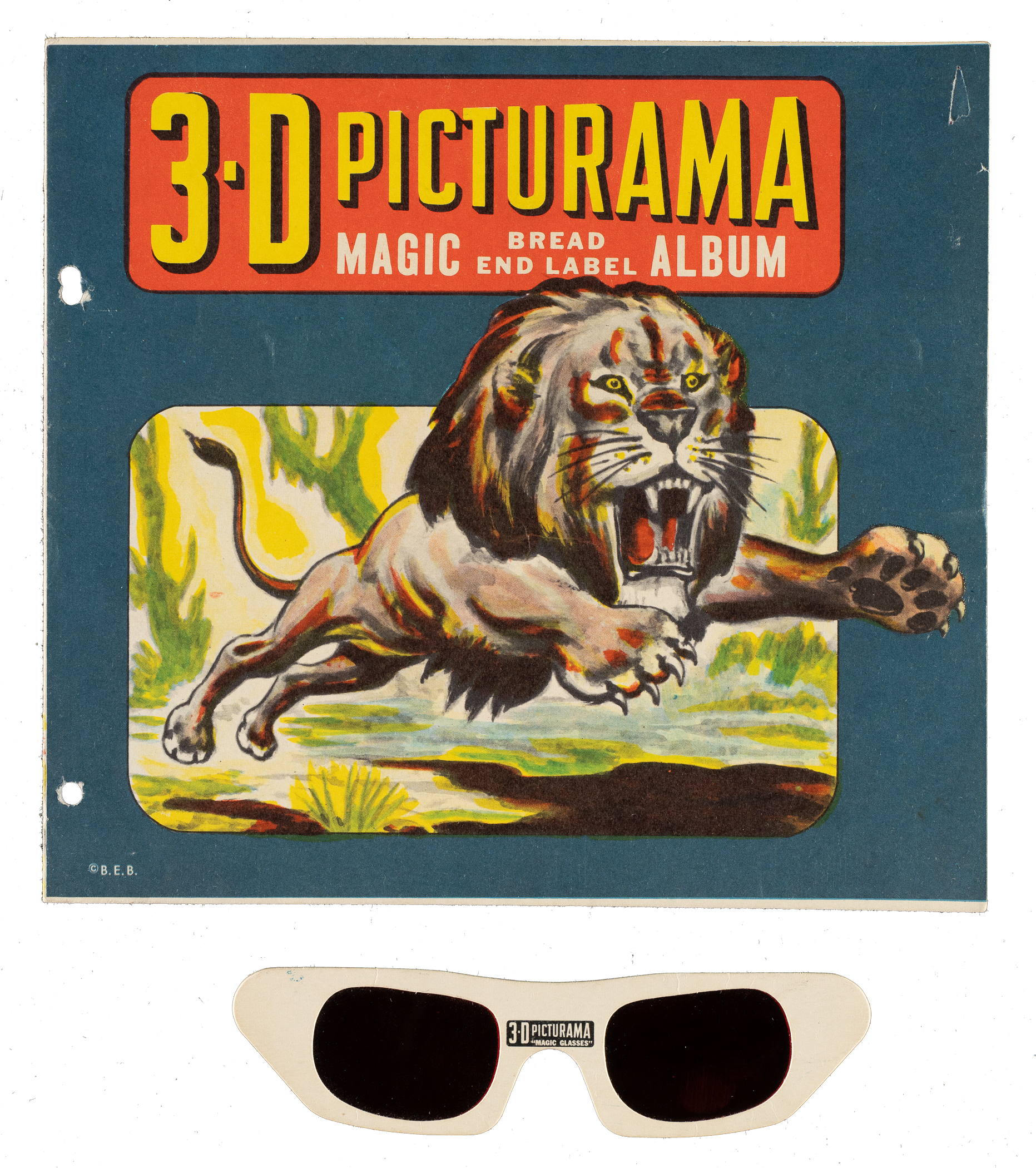 Presented is a complete 32-label set of 1950s D290-16 3-D Picturama Bread Labels, highlighted by Babe Ruth! One colorful bread label appeared on the end of each bread loaf as a packaging seal. Also included are an original album and a pair of 3-D "glasses" (Gd-Vg). Approximately half of the bread labels display one or more slightly uneven edges. It is not completely clear whether this is an indication of slight trims or is just a natural characteristic of these paper-thin labels. Without further reference to the edges, the condition of the bread labels ranges from Pr to Vg (averaging Fr-Gd), with two labels showing tape repairs on the reverse. The original Harvest Bread companion album is in modest condition, with scattered creasing, a small tear of the front cover, and punch holes added to the side of the album. Keys: #1 Ruth (Gd) and 25 Sullivan/Corbett (possible slight trim to top edge, otherwise Vg). Total: 32 bread labels plus album and 3-D glasses.