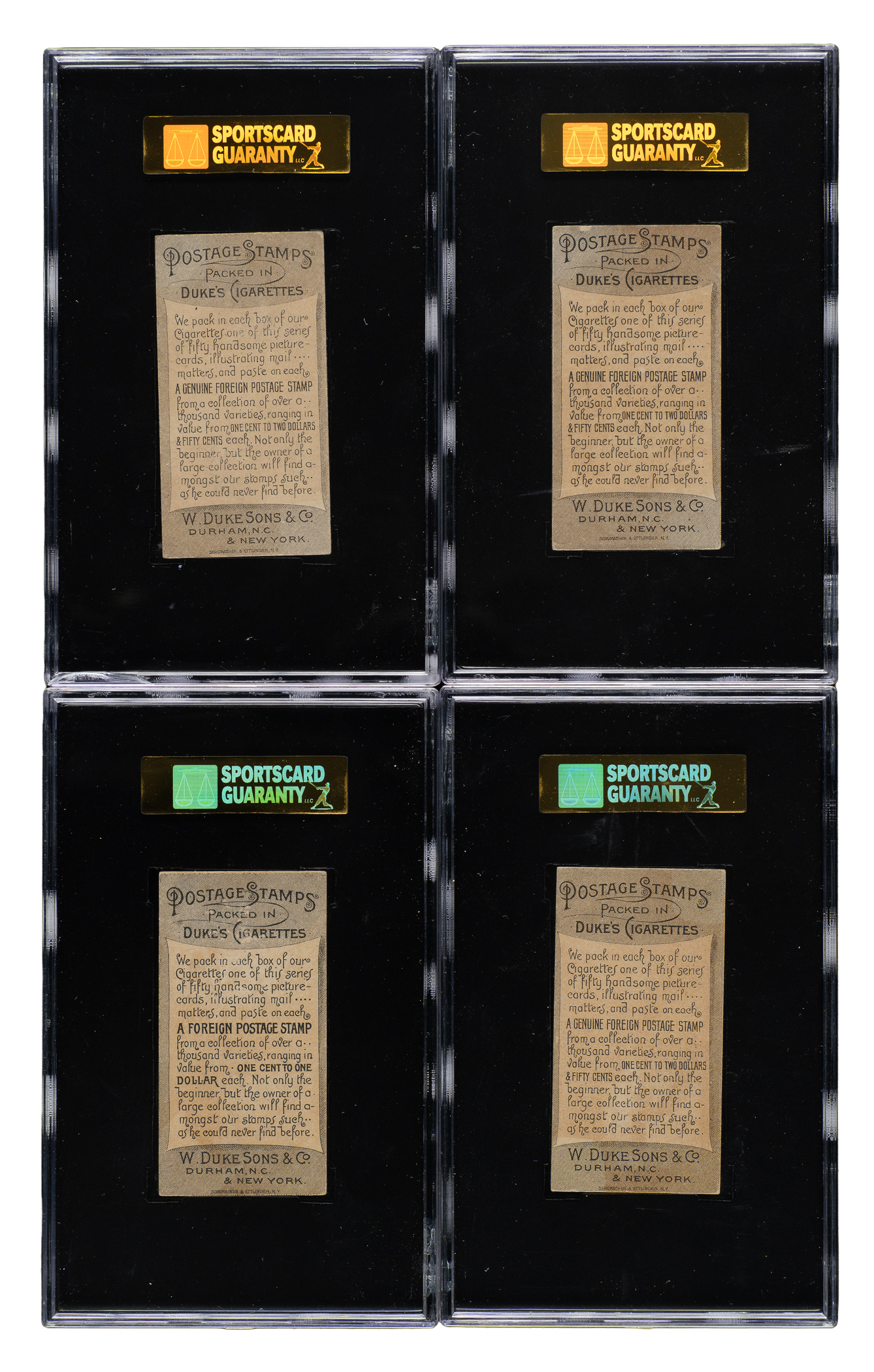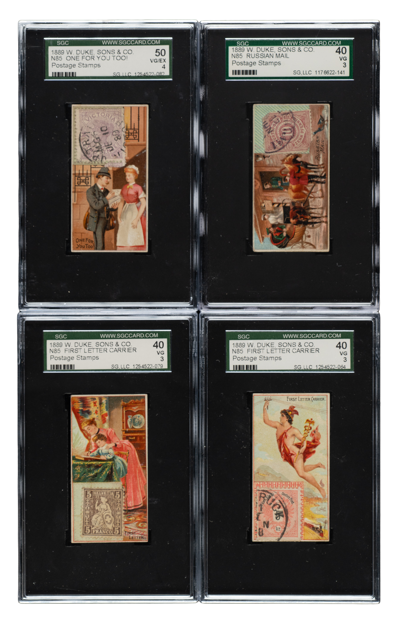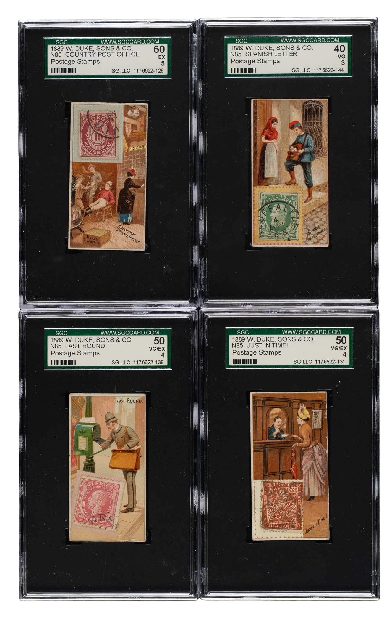 Complete set of fifty 1889 N85 Duke "Postage Stamps” cards, one of nineteenth-century tobacco-card collecting's most unusual and fascinating sets. Issued with Duke's Cigarettes, the popular hobbies of stamp collecting and card collecting inspired this unique set. The cards feature beautiful colorful lithographs related to the postal service, including real stamps from different areas of the world attached to the fronts of the cards. We can only imagine the logistics involved in the production of this set. Each stamp clearly had to be mounted at the factory by hand, one at a time, no doubt by many workers in an assembly-line process. This set was obviously the result of great vision and a tremendous desire to produce a product that stood out from the crowded field of card sets issued in the 1880s. Eight cards have been professionally graded and encapsulated by SGC: Country Post Office (EX 60), First Letter (VG 40), First Letter Carrier (VG 40), Just in Time! (VG/EX 50), Last Round (VG/EX 50), One for You Too! (VG/EX 50), Russian Mail (VG 40), and Spanish Letter Carrier (VG 40). The condition of the forty-two card balance is technically modest, with all except five cards showing a collector's hand stamp on the reverse. Without further reference to the backs of the cards, the fronts offer an overall Vg to Vg-Ex appearance, with a couple Ex and a few and lower. One of the most interesting and ingenious sets ever produced, Duke's "Postage Stamps" are rarely offered as a complete set and are highly prized by both stamp collectors and nineteenth-century nonsport tobacco-card collectors. Total: 50 cards.