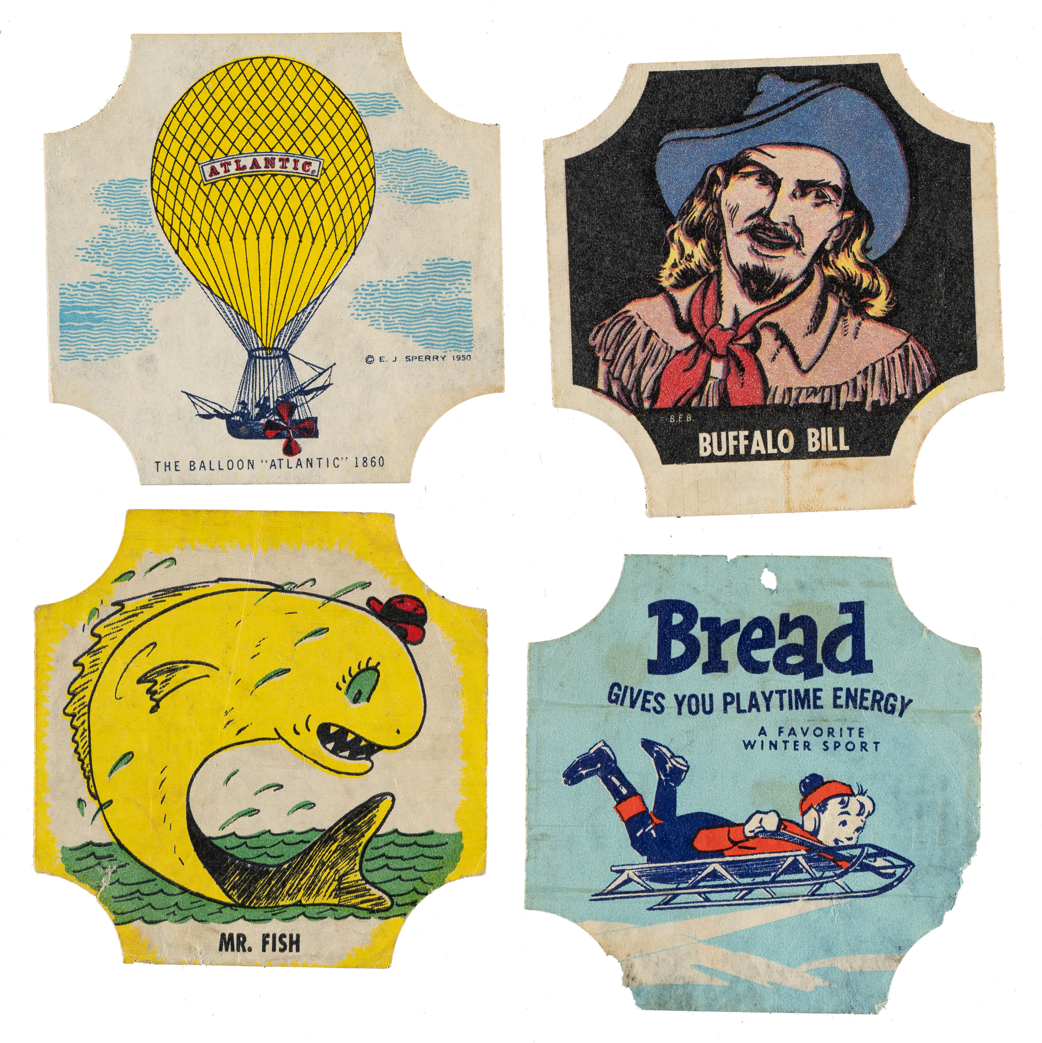 Presented is a very substantial collection of 113 circa 1950s nonsport bread labels, highlighted by two complete sets. Designed to be applied to loaves of bread, labels are naturally rare (having been issued only one label per loaf of bread) and often found with numerous condition issues. The backs are blank and are almost always found with paper loss or remnants of the bread packaging still affixed. Condition of the offered labels is overall modest as a result, with very few of the labels technically grading higher than Good. This collection consists of the following: 1) 1950 E.G. Sperry Transportation Series Bread Labels Complete Set (48). 2) 1950s Western Characters NBC Bread Labels Complete Set (34): Includes both blue and black variations of the following three labels: Buffalo Bill, Calamity Jane, and Prospector. 3) Miscellaneous Labels (28): Includes: Taystee "Cowboy-G-Men" and Freihofer Characters "Mr. Fish." A very presentable lower-grade collection of these very colorful nonsport bread label tops. Total: 113 labels.