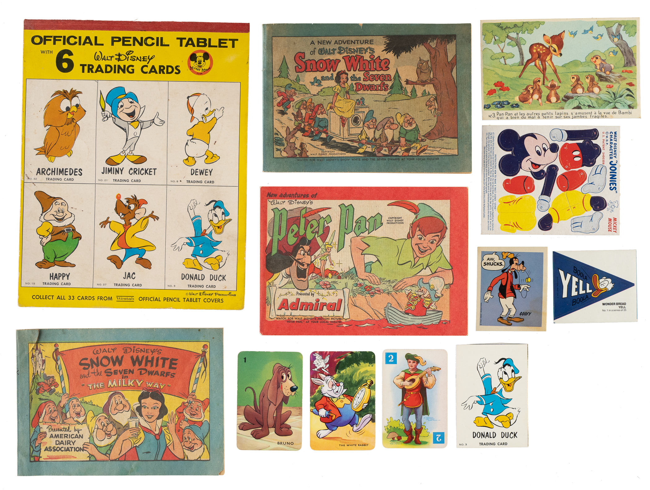 Presented is a complete and near-complete set collection of Walt Disney trading cards and stickers, spanning from the 1930s to the 1970s. This collection includes some rare complementary items such as original boxes, direction cards, uncut sheets, and albums. This collection consists of the following: 1) c.1930s Shuffled Symphonies Card Game Complete Set (45) Plus Original Box and Rules Booklet: Condition is 65% Nr/Mt, 35% ranging from Vg to Ex-Mt. The original box is flattened and grades modestly due mostly to missing all top flaps and paper loss on a bottom flap. The rules booklet is in Good condition. 2) 1938 Castell Brothers Ltd. (London) Snow White and the Seven Dwarfs Card Game (Pepys Series) Complete Set (45) Plus Original Box and Directions: Condition is Nr/Mt overall with a few lesser. The original box is flattened and grades modestly due mostly to two missing side flaps and paper loss on a bottom flap. The rules booklet is in Very Good condition. 3) c.1945 Superluxe (Paris) Walt Disney Bambi Story Postcards Complete Set (25): Ranging in appearance from Vg to Ex-Mt (averaging Vg-Ex+), with ten grading lesser due to pencil on the reverse. 4) 1949 Kellogg's Walt Disney Characters "Joinies" Complete Set (12): Ranging from Vg-Ex to Nr/Mt (averaging Ex+), with two lesser. 5) 1950 Alice and Wonderland Card Game (Pepys Series) Complete Set (44) Plus Original Box and Directions: Condition ranges from Vg to Ex-Mt (averaging Vg-Ex+), with a couple higher and lower. The original box is flattened and grades Fair. The rules booklet is in Gd-Vg condition. 6) c.1950s Cinderella Card Game (Pepys Series) Complete Set (44) Plus Original Box and Directions: Condition is 30% Vg-Ex or better, 70% ranging from Pr-Fr to Vg (averaging Gd). The original box is flattened and grades modestly due mostly to missing all top flaps and paper loss on a bottom flap. The rules booklet is in Good condition. 7) c.1960s Walt Disney Trading Cards Partial Set (11/33) Plus 6-Card Panel: Includes the following eleven hand-cut cards: #3, 4, 7, 9, 13, 15, 19, 21, 25, 29, and 32. Pencil tablet cover includes: #3, 9, 15, 21, 27, and 32. The partial set is mostly Vg, with a few better. The cover shows partially erased pencil marks in the non-card area, otherwise Gd-Vg. 8) 1970s Wonder Bread Co. Crazy License Plates "Walt Disney" Complete Set (25) Plus Collector's Poster: Ranging from Ex to Nr/Mt (averaging Ex-Mt), with a couple higher and lower. The poster (folded, as issued) grades Vg-Ex. 9) 1973 Wonder Bread Co Disney Characters Stickers "Walt Disney" Near-Complete Set (28/34): Ranging from Vg to Ex (averaging Vg-Ex), with a few lesser. Of the thirty-four stickers cataloged to date, missing the following six for completion: Donald Duck, Mary Poppins, Morty/Mickey, Queen of Hearts, Robin Hood, and Tinker Bell. 10) 1974 Wonder Bread Co Disney Characters Stickers "Walt Disney" Complete Set (29): Three stickers are peeled, trimmed, and attached to paper backings. The balance range from Vg to Ex-Mt (averaging Ex/Ex-Mt), with one lesser. The set is complete according to stickers cataloged to date. 11) 1975 Wonder Bread Co. Crazy College Pennants Stickers "Walt Disney" Complete Set (25): Ranging from Vg-Ex to Ex-Mt (averaging Ex), with a few slightly lesser. Also Includes: 12) c.1945 Superluxe (Paris) Walt Disney Dumbo Story Postcards (1 card): #7 (Fr). 13) c.1945 Superluxe (Paris) Walt Disney Cinderella Story Postcards (2 cards): #13 (Vg-Ex) and 23 (Ex). 14) c.1950s Disney Comics (3 comic booklets): 1952 Bendix Washing Machines Snow White and the Seven Dwarfs (Fr), 1953 Admiral Peter Pan (Vg-Ex), and 1955 American Dairy Association Snow White and the Seven Dwarfs (Vg). Total: 349 items.