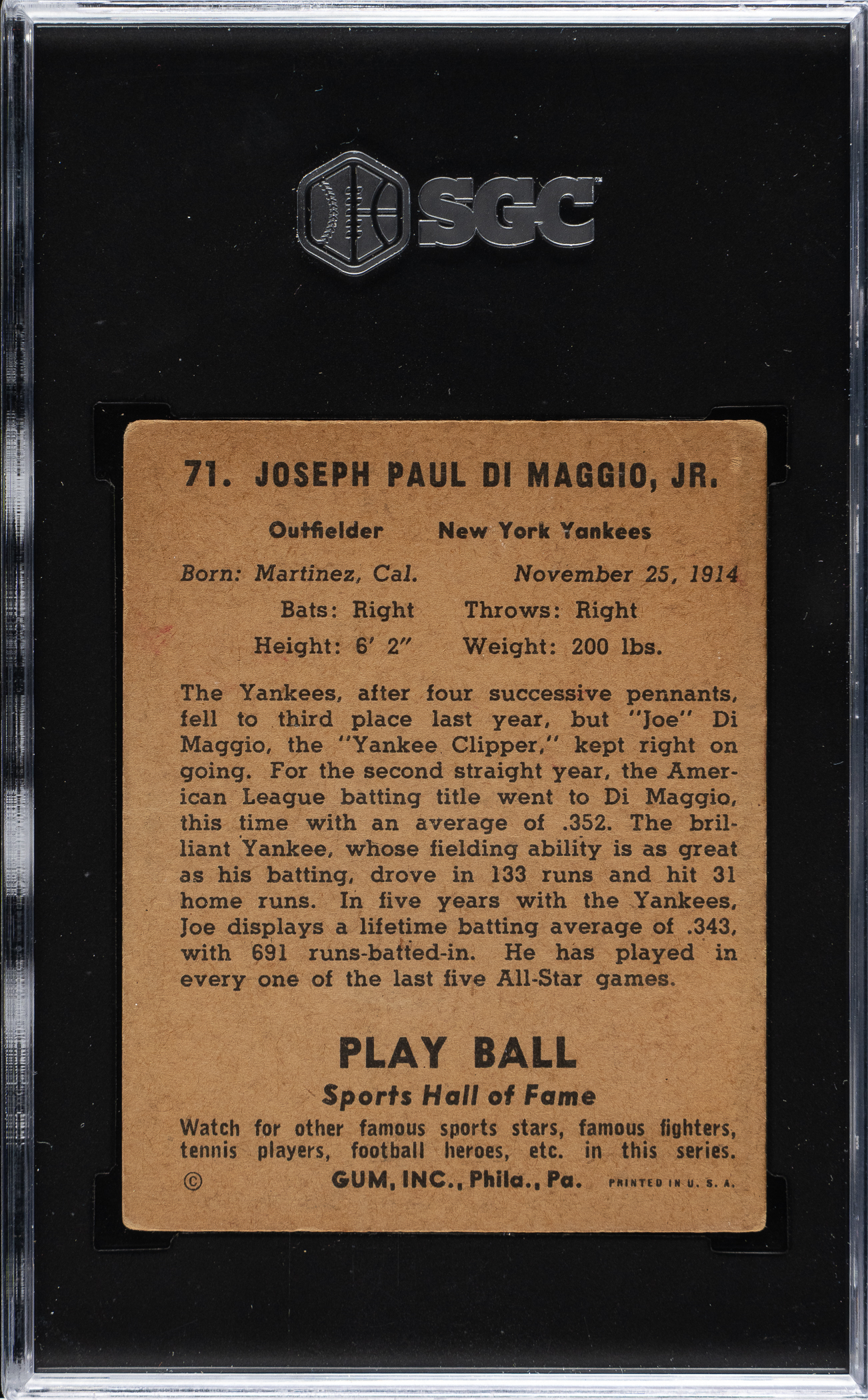 Graded GOOD 2 by SGC. Visually appealing 1941 Play Ball of New York Yankees Hall of Famer Joe DiMaggio. This example has bold colors, light creasing, and honest corner wear. The reverse displays bold black text. Minor toning is visible front and back. This card tends to be very difficult to find in high grade because it is #71 of 72 cards in the set. A very pleasing example of one of the key cards from the 1941 Play Ball set and one of the iconic cards of the era.