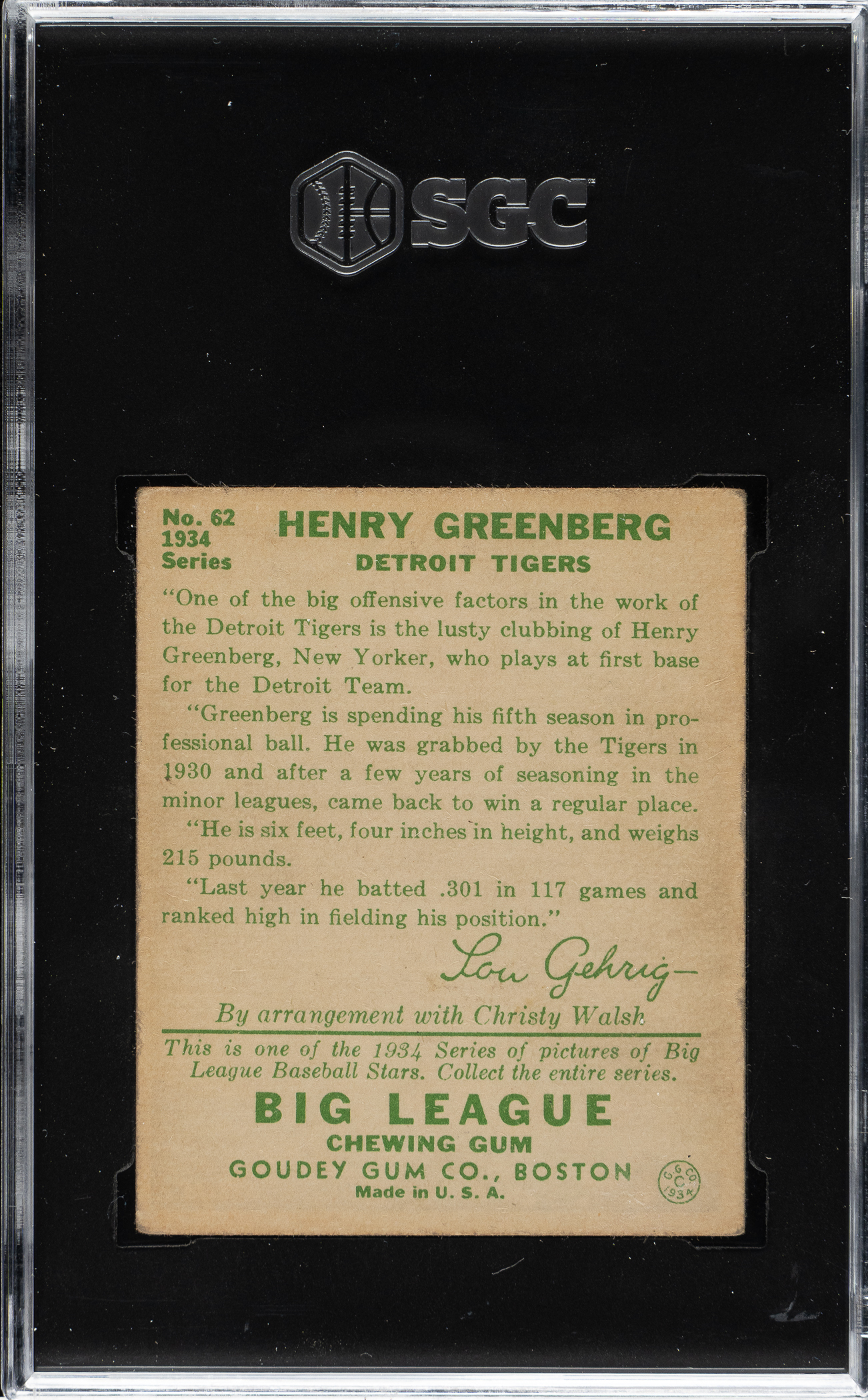 Graded VG/EX+ 4.5 by SGC. Very attractive example of Detroit Tigers Hall of Famer Hank Greenberg's rookie card from the classic 1934 R320 Goudey set. This is perhaps Greenberg's most popular card and one of the most striking cards in the entire 1934 Goudey set. "Hammerin' Hank" Greenberg was one of the greatest sluggers of the 1930s, leading the American League in home runs on four separate occasions. This example has bold colors, a strong image, and even corner wear. Boldly printed reverse. A very appealing mid-grade example of one of the classics of 1930s bubble-gum cards.