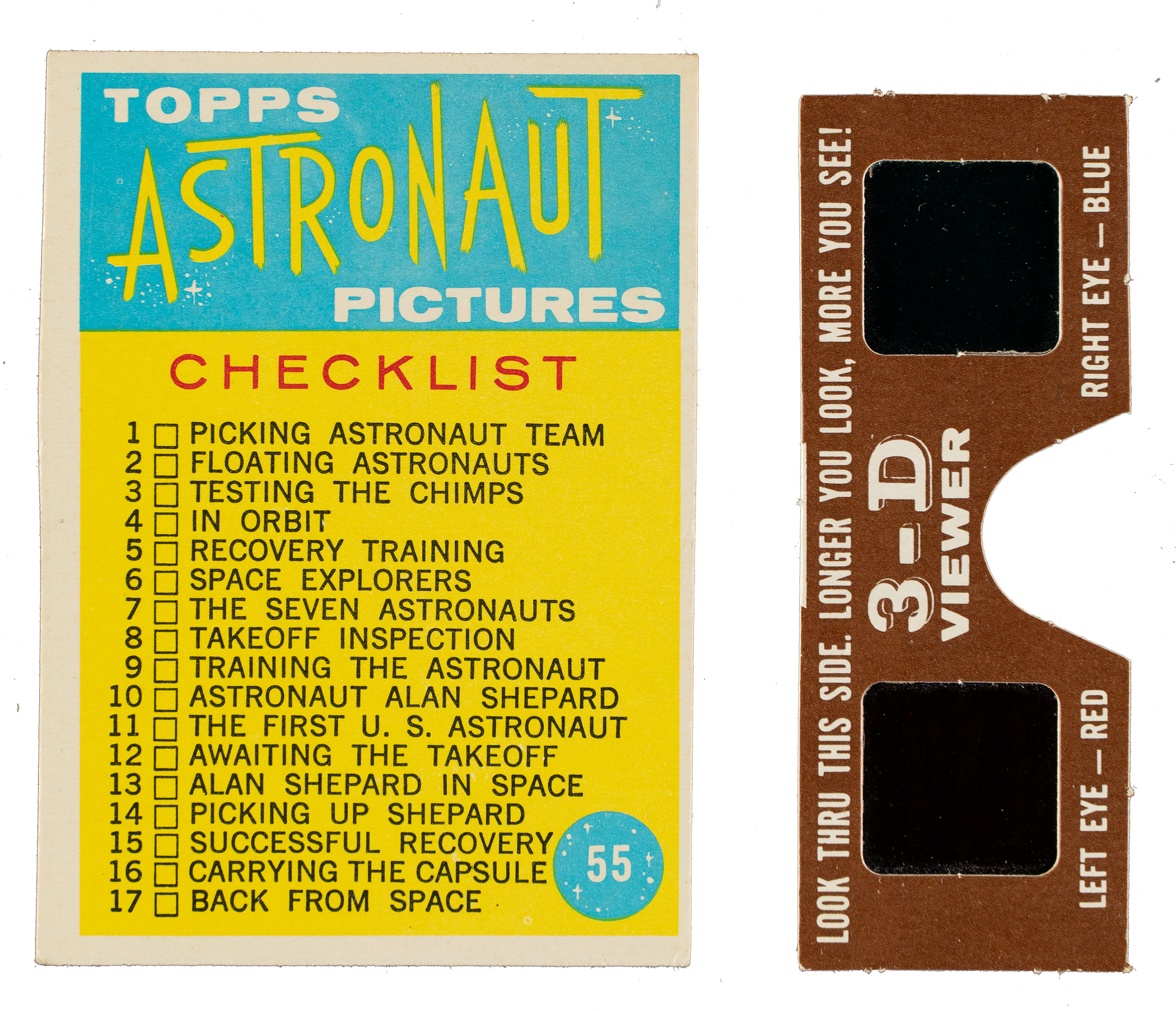 Presented is a complete 55-card set of 1963 Topps "Astronauts" trading cards plus an original 3-D viewer (Ex). Produced at the dawn of the space age, when every kid in America wanted to be an astronaut, this set of cards honoring those national heroes was Topps' response to this enthusiasm. The set features artworks based on NASA photographs of America's space explorers, their training exercises, and equipment. Includes one "Popsicle" back (#14). Condition is 45% Ex-Mt to Nr/Mt and 55% Vg-Ex to Ex (including a few lesser). Key: #55 Checklist (slightly miscut left edge, otherwise Vg-Ex). The offered set presents a tremendous opportunity to acquire a very attractive mid- to high-grade complete set of one of nonsport-card collecting's most historically significant sets. Total: 55 cards plus viewer.