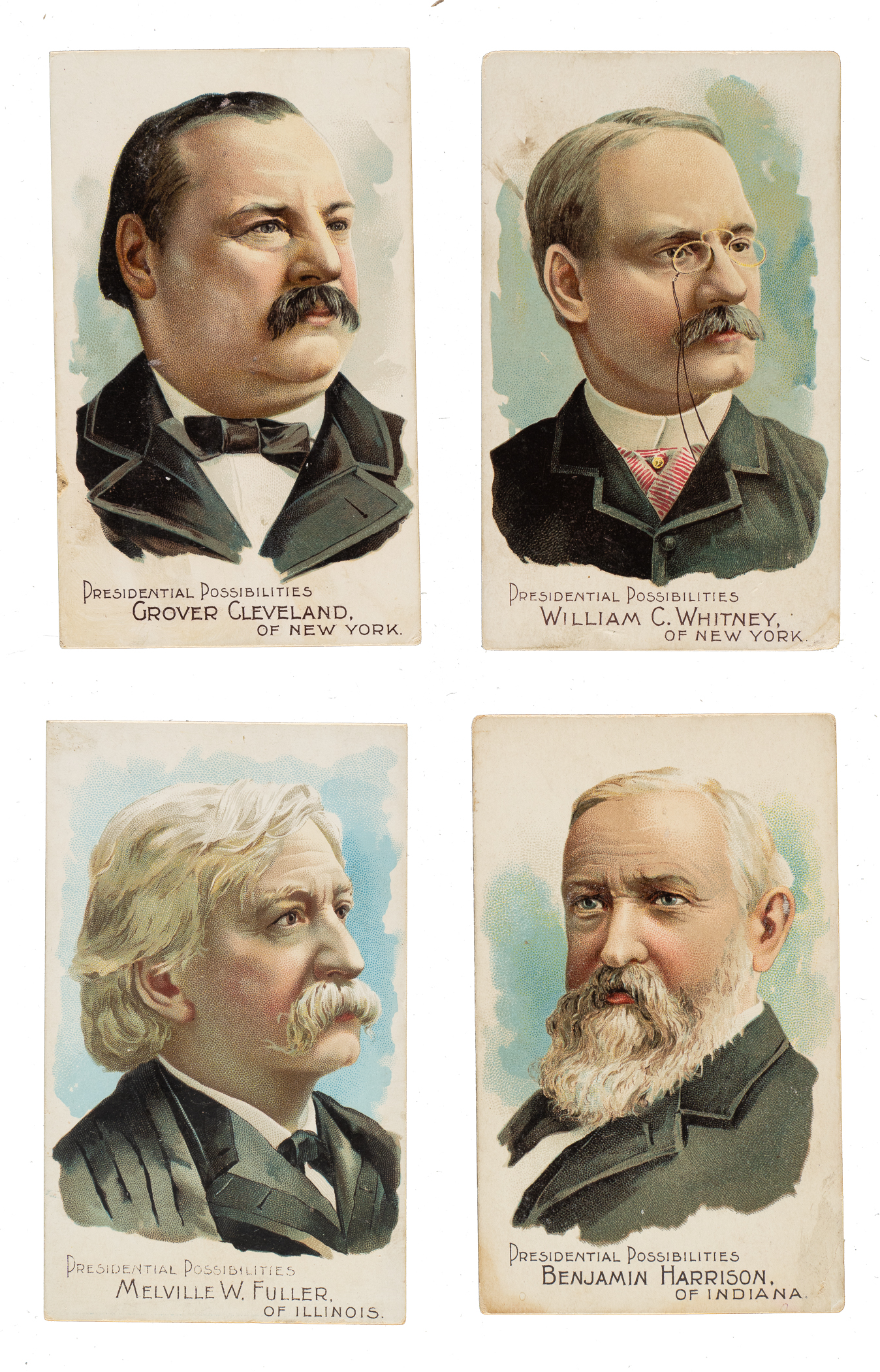 Complete set of twenty-five 1888 N124 Duke "Presidential Possibilities." This is a very attractive set of these extremely striking nineteenth-century tobacco cards. The N124 set is one of the most popular and desirable of all nineteenth-century nonsport tobacco-card sets. Issued with Duke's Cigarettes, each card measures 2-9/16 x 4-1/8 inches and features color portraits of the various statesmen considered to be potential candidates for the presidency in 1888 on the front with a checklist presented on the reverse. Condition is 36% Vg-Ex to Ex, 32% Gd to Vg, and 32% Pr to Fr. Duke's "Presidential Possibilities" are rarely offered as a complete set, and are highly prized by both historical collectors and nineteenth-century nonsport tobacco-card collectors. Total: 25 cards.