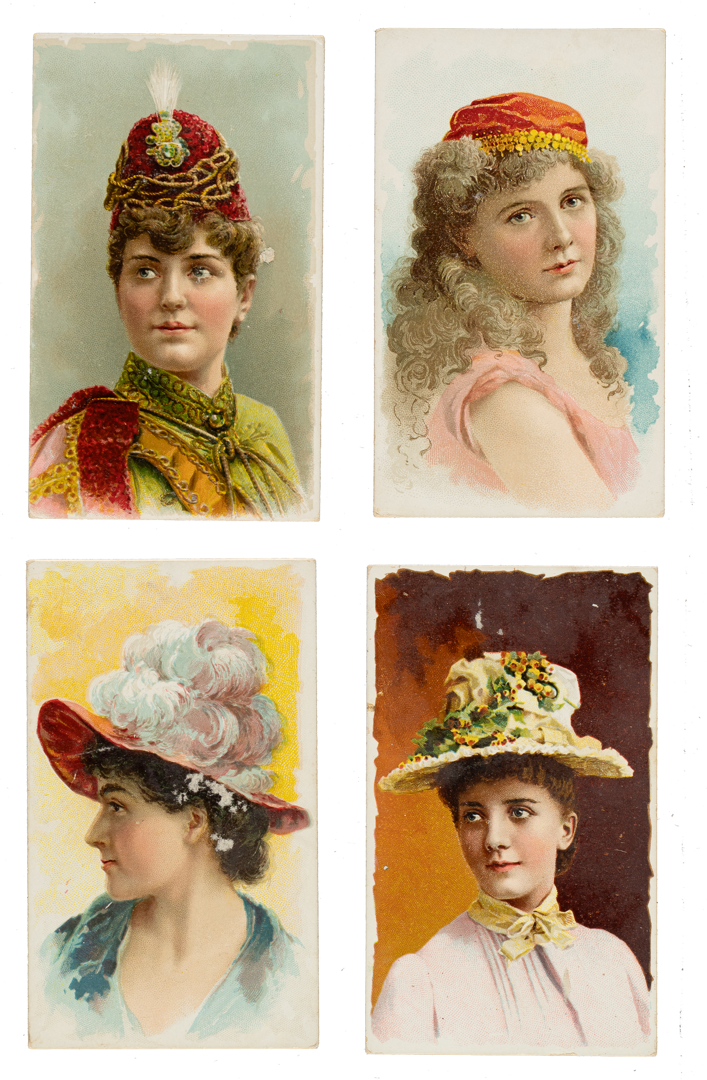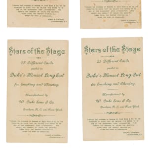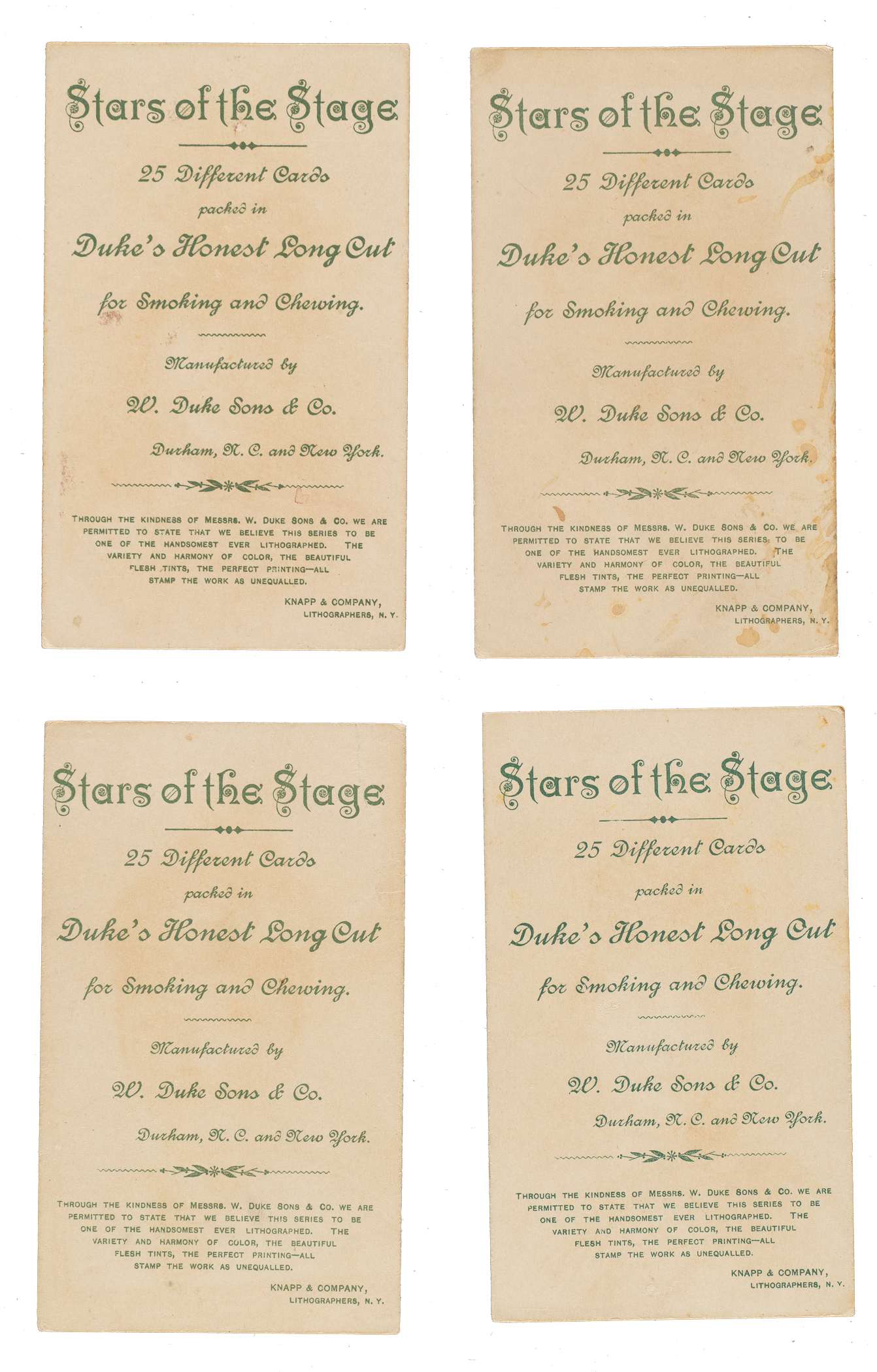 Complete set of twenty-five 1890 N129 Duke "Stars of the Stage" (First Series) cards. Includes one example with an N131 "Stars of the Stage" (Third Series) error back in Very Good condition. A very attractive complete set of these rare, colorful, and very striking nineteenth-century tobacco cards, grading 20% Vg-Ex, 64% Gd to Vg, and 16% lesser. Duke Tobacco cards in general are far rarer than cards issued by many other tobacco companies such as Allen & Ginter. Issued with Duke's Honest Long Cut brand tobacco, each card features a colorful, graphically detailed lithographic image of an unnamed "beauty" dressed in fancy Victorian attire. Duke's "Stars of the Stage" (First Series) is rarely offered as a complete set. Total: 25 cards.