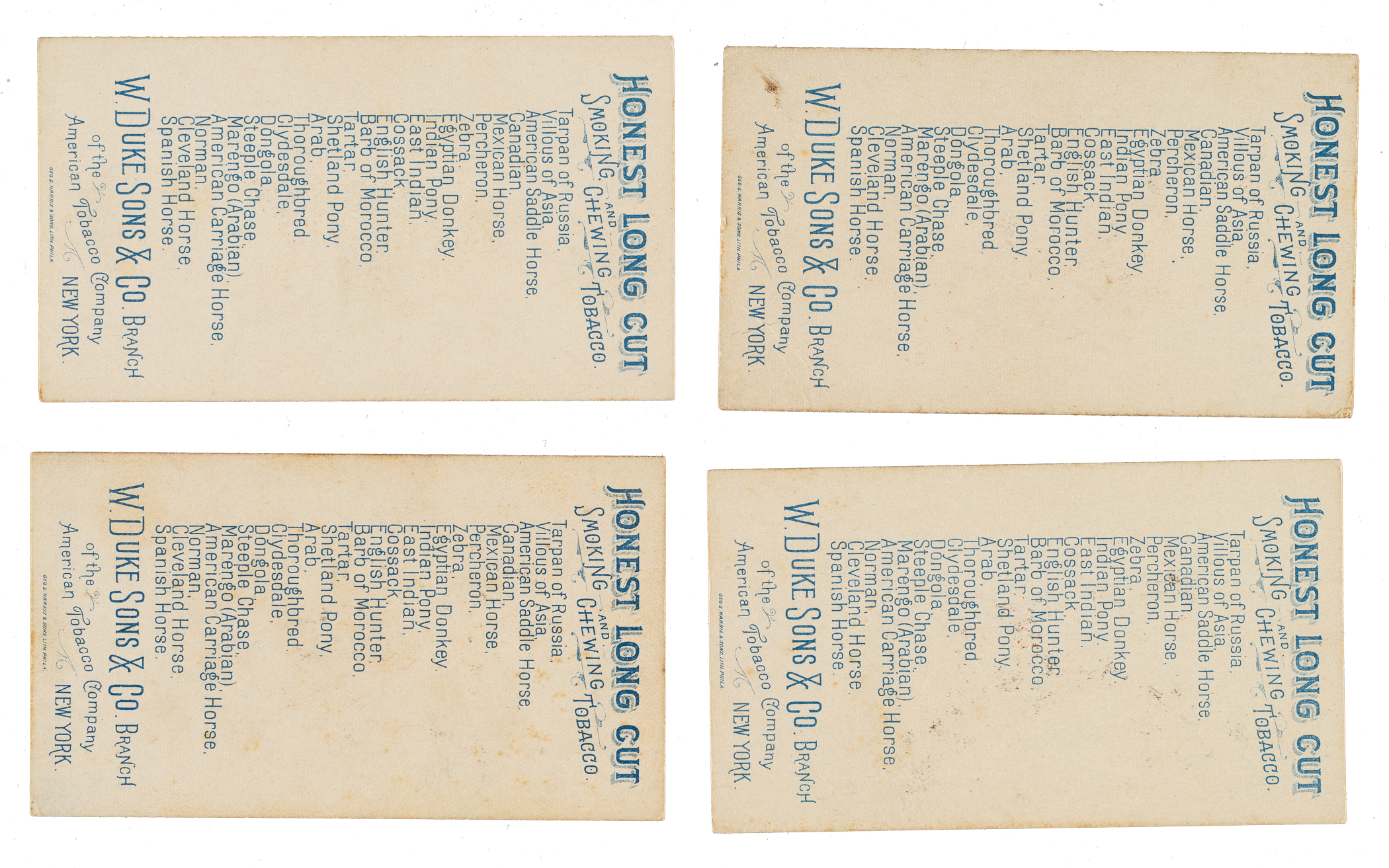 Complete 25-card set of N101 Duke "Breeds of Horses." This set, issued by Duke with its Honest Long Cut Tobacco brand, features colorful illustrations of horses set against a woodgrain background. Each card measures 4.25 by 2.5 inches and identifies the breed of horse with a small caption on the front and contains a complete set checklist, along with an advertisement for Duke and Honest Long Cut, on the reverse. Condition is 60% Ex or slightly better, 28% Vg to Vg-Ex, and 12% lesser. This is a very attractive complete set of this scarce and classic nonsport tobacco issue. Total: 25 cards.