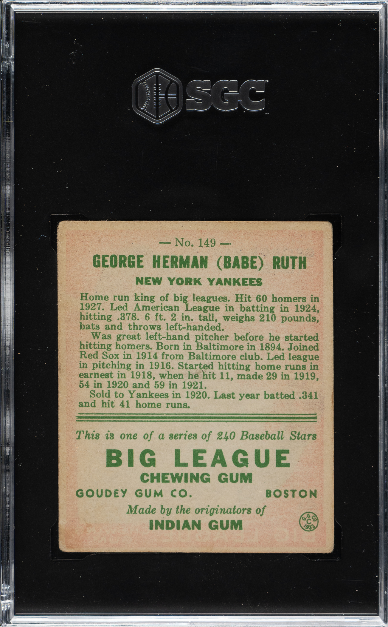Graded VG 3 by SGC. Tremendous mid-grade example of one of New York Yankees Hall of Famer Babe Ruth’s most famous and classic cards: #149 (red background) from the 1933 Goudey series. This card has a beautiful red background, a crisp image, and moderate corner wear. In an extremely desirable condition, this is an ideal card for the collector who wants an appealing 1933 Goudey #149 Babe Ruth but is not interested in spending the tens of thousands of dollars an example in a significantly higher grade would cost.