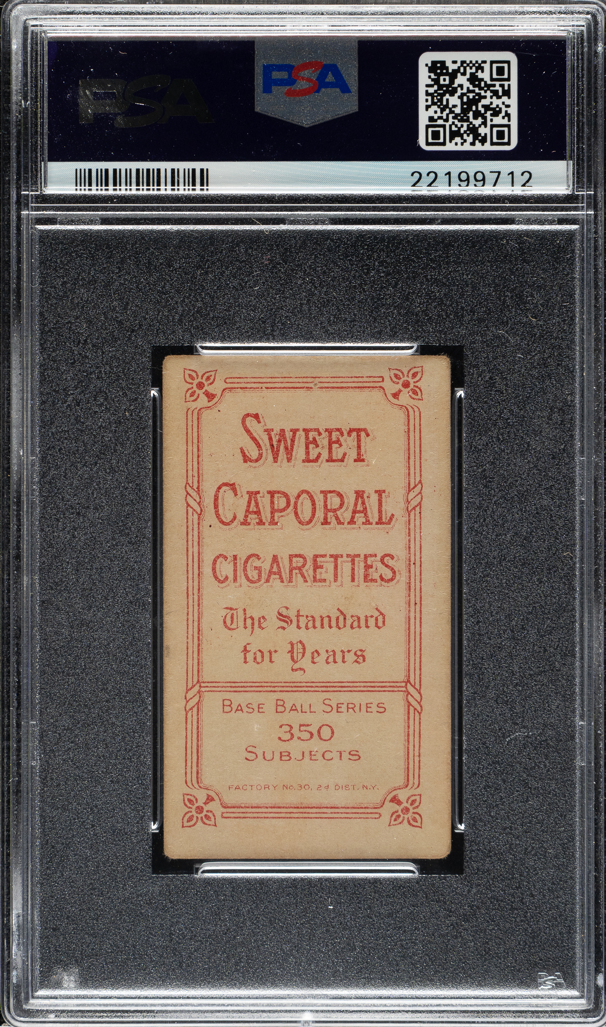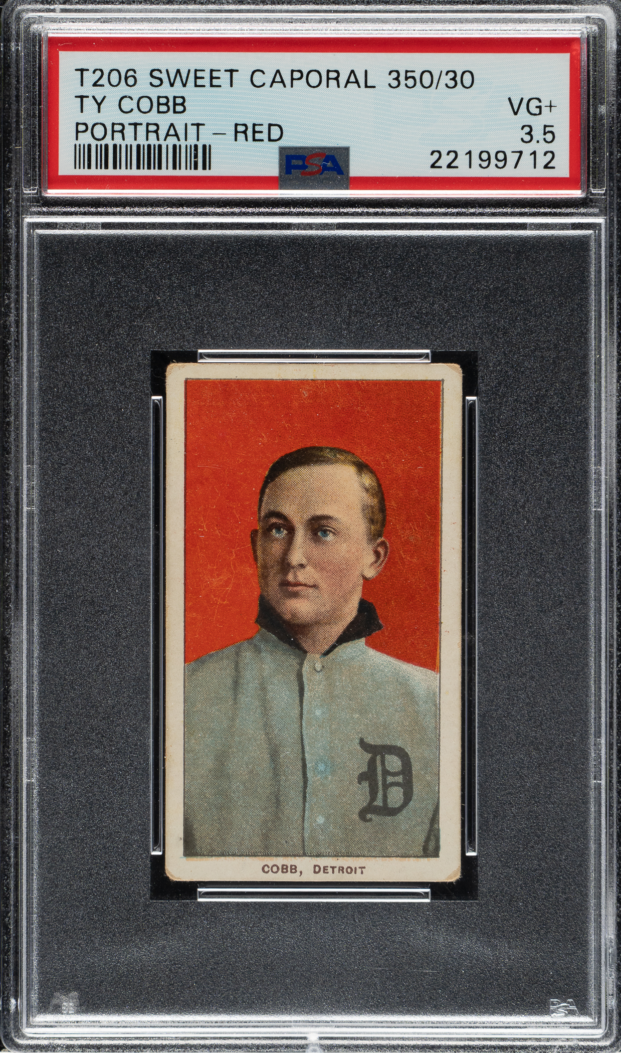 Graded VG+ 3.5 by PSA. Mid-grade example of this classic tobacco card of Detroit Tigers Hall of Famer Ty Cobb. The red background pose has long been considered a classic Cobb card. This example displays a brilliant red background, outstanding registration, and honest corner wear. Sweet Caporal 350/30 advertising reverse.