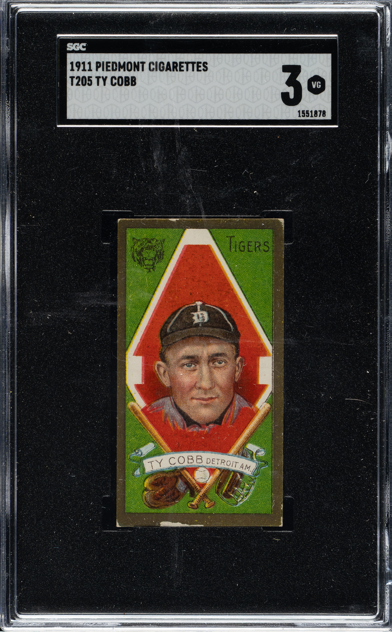 Graded VG 3 by SGC (submitted by REA). Classic card of Detroit Tigers Hall of Famer Ty Cobb from the T205 Gold Border series. This Cobb card is not just the most valuable in the set, it is also one of the most well-known and popular of all his cards. The offered card has brilliant colors, outstanding registration, light corner wear, and no creases or wrinkles. Minor chipping along the bottom edge contributes to the assigned grade. The Piedmont advertising back is boldly printed and centered to the top right. This is a very attractive example of Ty Cobb, the key card in the T205 Gold Border set, in a particularly desirable grade, from this extremely condition-sensitive set.