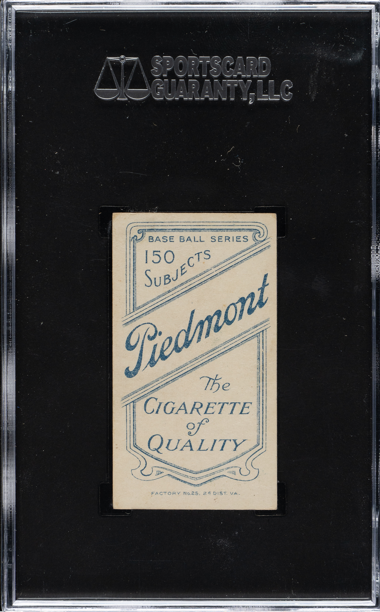 Graded EX 5 by SGC. Stunning mid-grade example of this classic tobacco card of Detroit Tigers Hall of Famer Ty Cobb from the T206 White Borders series. The T206 Ty Cobb bat-on-shoulder pose is one of the key cards in the legendary T206 set. This card has bright colors, excellent registration, even corner wear, and impressive centering. Boldly printed Piedmont 150/25 advertising reverse.