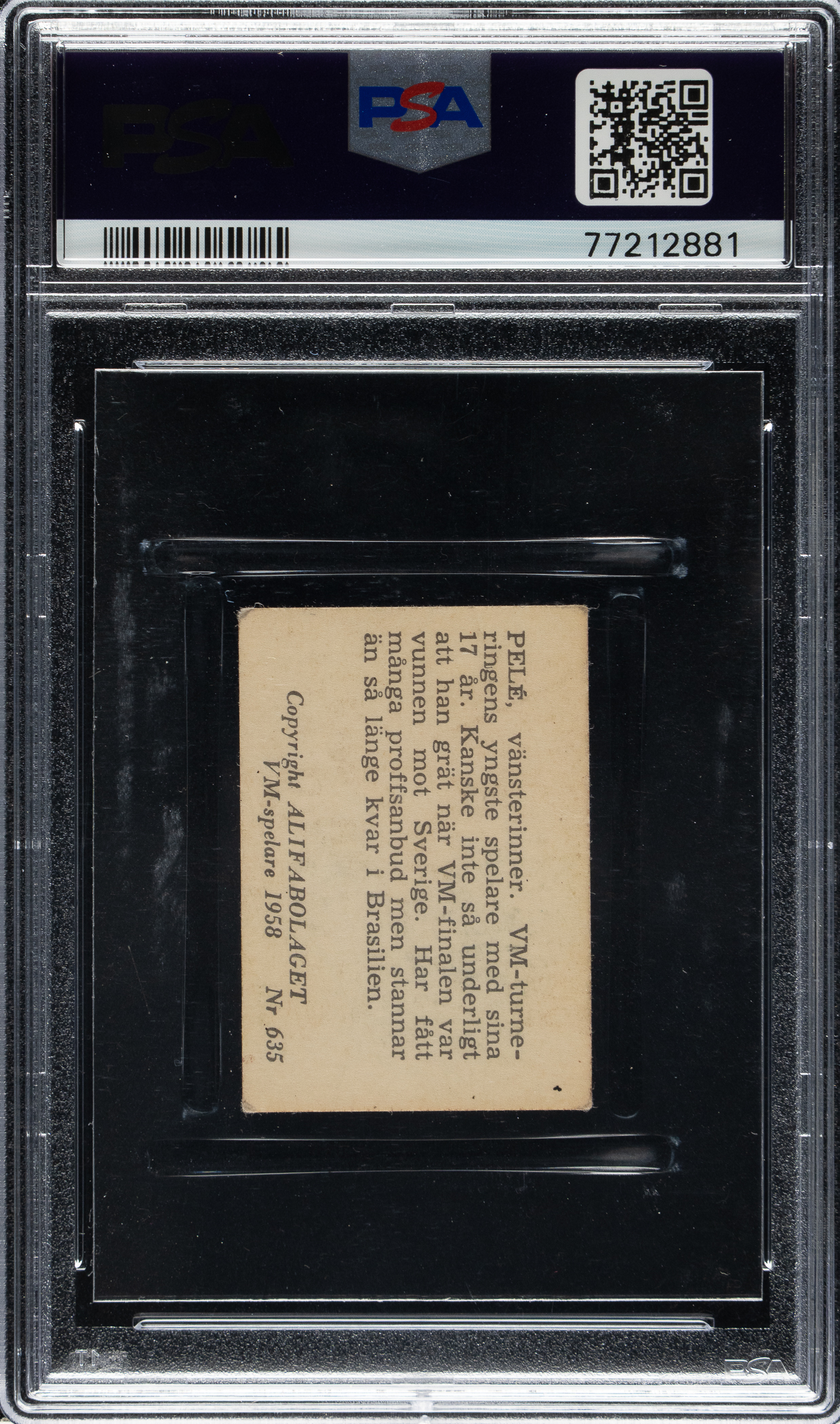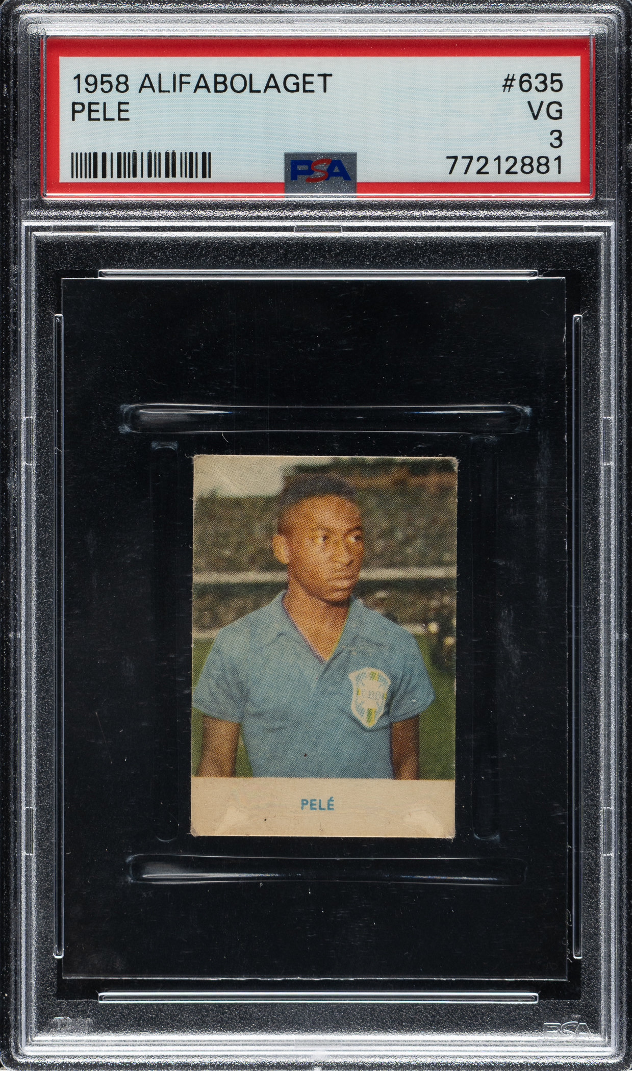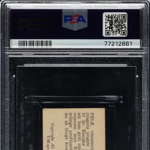 Graded VG 3 by PSA. Outstanding mid-grade example of Brazilian soccer legend Pelé's most desirable rookie card from the 1958 Alifabolaget series. This 35-card set featured players and team cards from all four finalists of the 1958 World Cup and was issued in Sweden to commemorate the country's hosting of the event. Pelé, captured here in the blue jersey Brazil wore in the final, was the tournament's breakout star. At just 17 years old, Pelé became the youngest player to score in a World Cup, a record that stands to this day. He scored in all three of Brazil's knockout stage games, including two goals in the 5-2 final win over Sweden. The offered card displays a bright and crisp image of Pelé and even wear to the corners. The text on the reverse, printed in Swedish, translates to "Pelé, left winger, the WC tournament’s youngest player at the age of 17. Perhaps not so strange that he cried when the WC final was won against Sweden. Has received many professional offers but remains in Brazil for the time being.” Marking one of Pelé's earliest appearances on a trading card, this example would make a tremendous addition to any world-class Pelé or soccer collection.