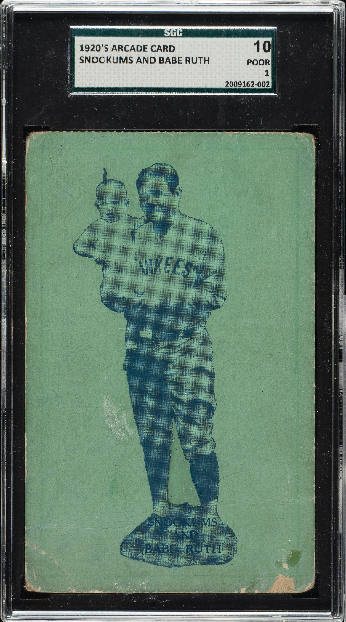 Rare and unusual "Arcade" card featuring New York Yankees Hall of Famer Babe Ruth and young child actor "Snookums" (Lawrence "Sunny" McKeen), circa 1926-1927. The card pictures Ruth holding the infant film star. The subjects' names, "Snookums and Babe Ruth," are printed along the base. The reverse is blank. This is the first example we have offered in the past 22 years. Graded POOR 10 by SGC due to heavy creasing and rounded corners. This is a fascinating Babe Ruth card dating from the peak years of his legendary career.